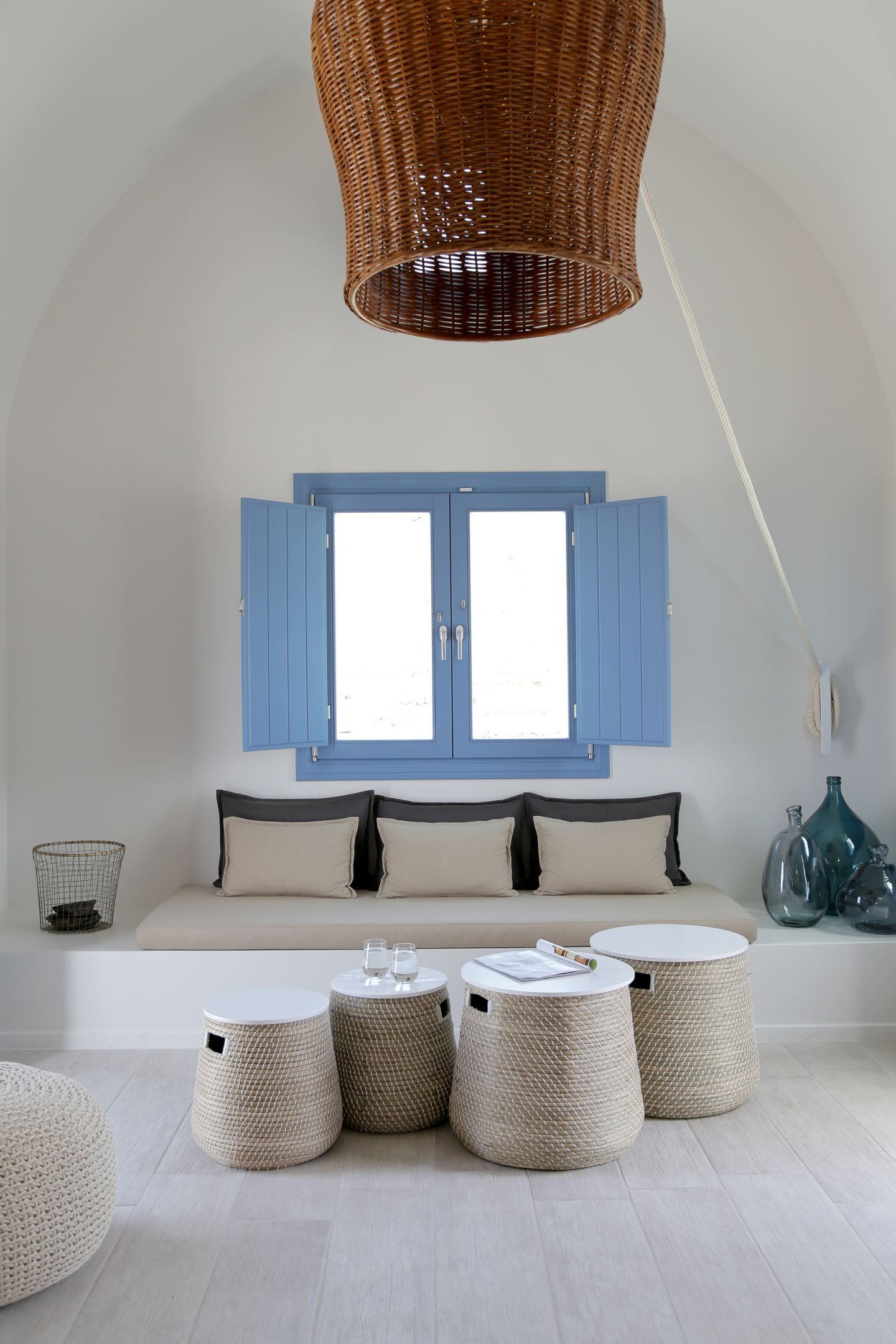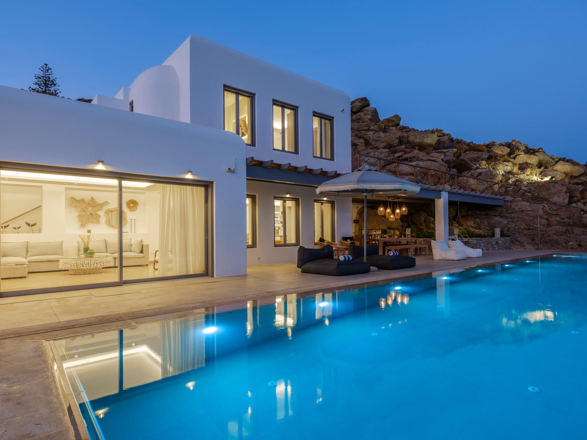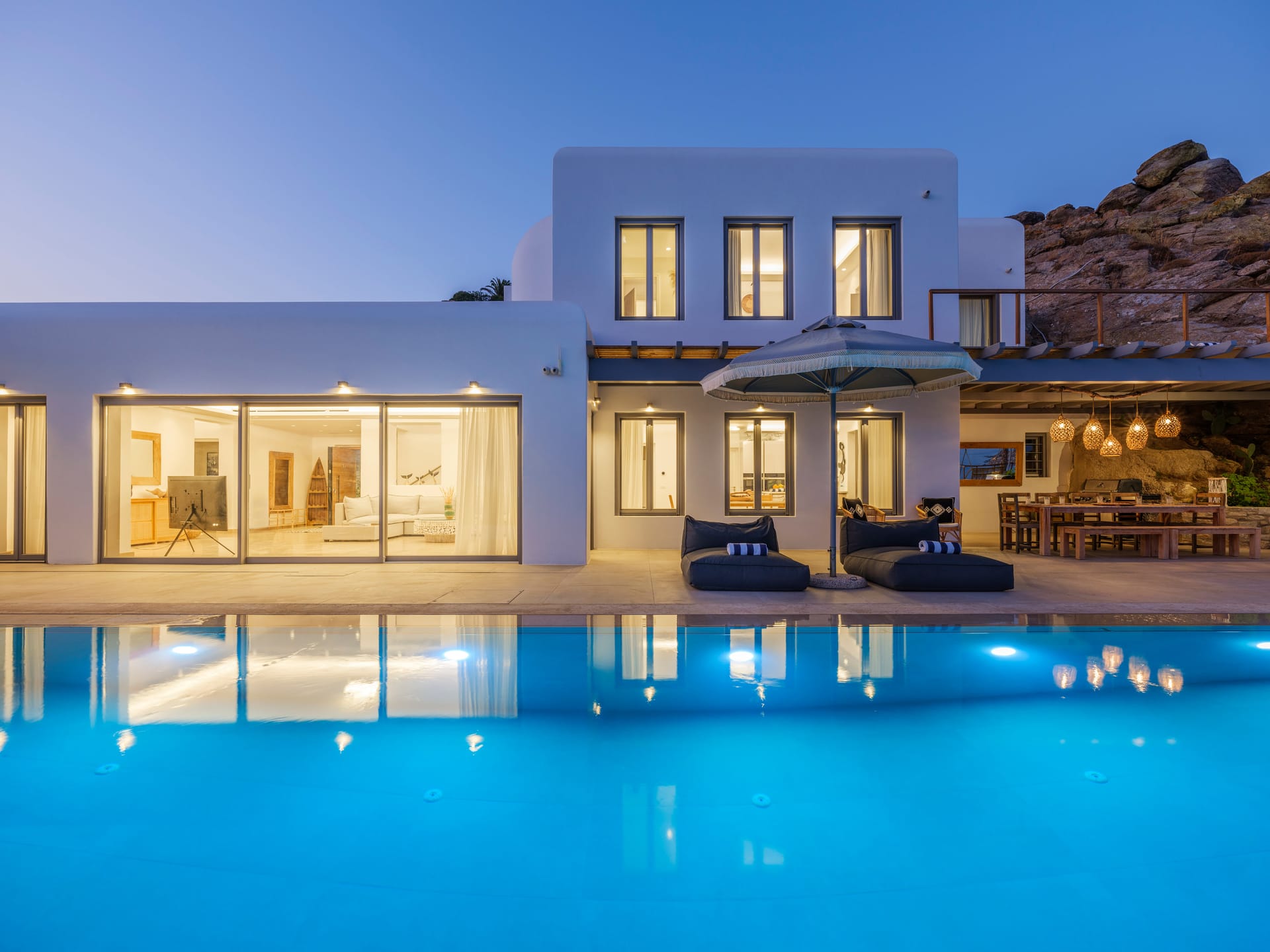 Rethink relaxation under the shadow of Camares – a Greek pool house – and as the daylight fades away giving its turn to the sweet summer night, the outdoor dining area – with its well equipped bar, the round dining table and the large sliding windows which access the swimming pool – invites you to indulge yourself or entertain your quests enjoying a cocktail or dinner by the pool.
