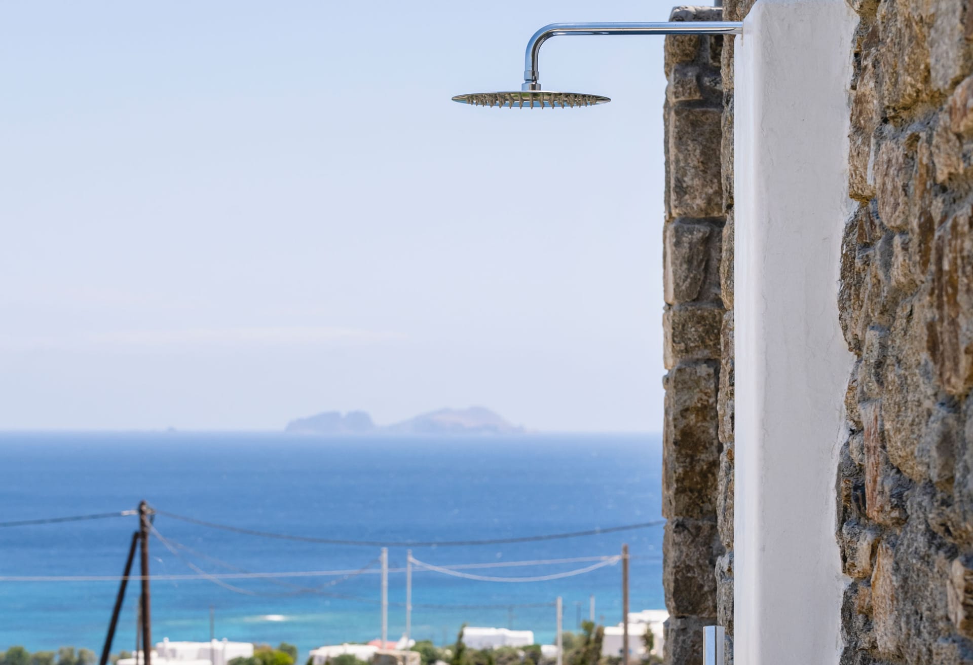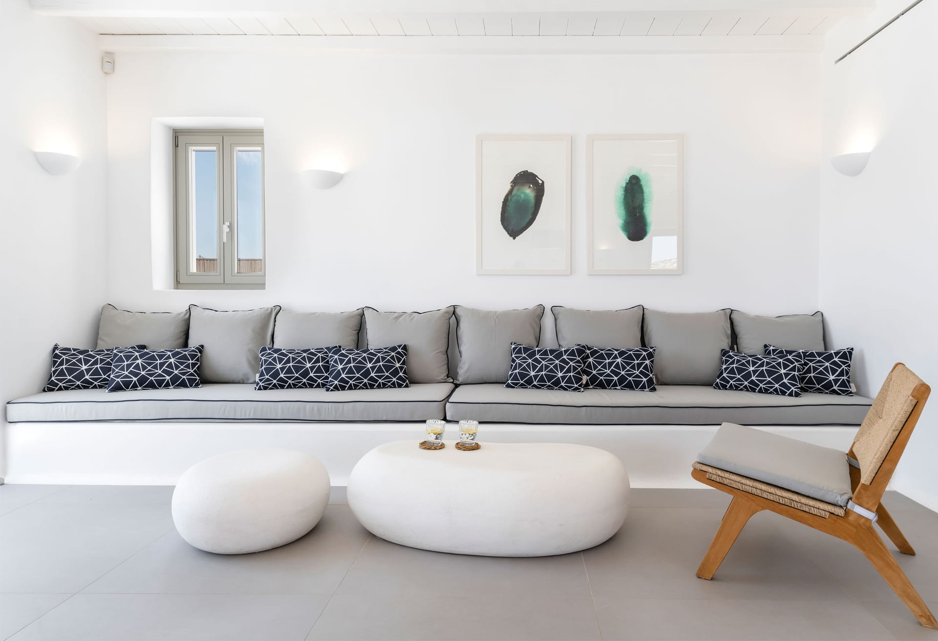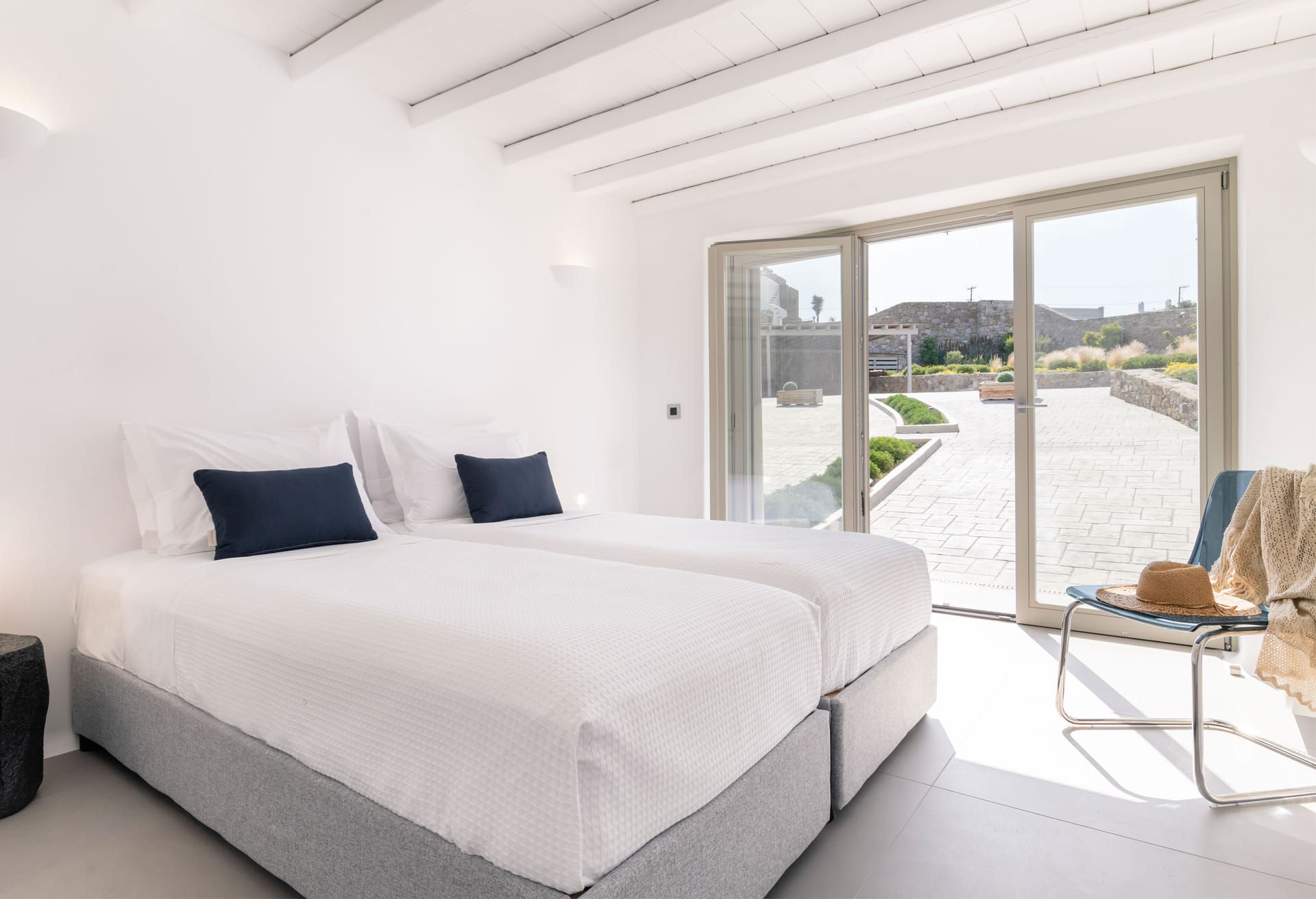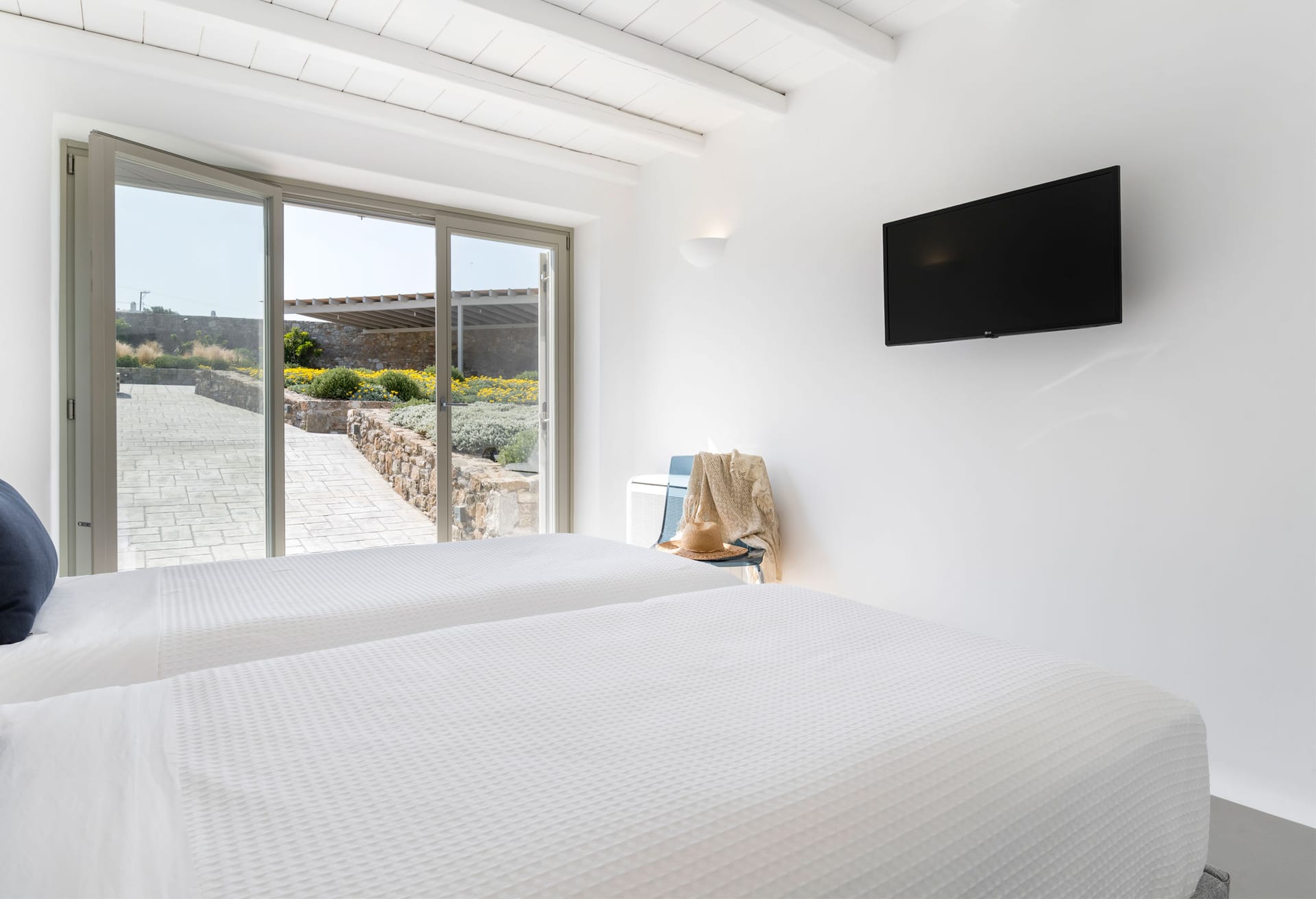 Villa Ivory 2 consists of two levels. On the main level, there is a living and dining room area with a fully equipped kitchen and two bedrooms: a master bedroom with a queen size bed, en-suite bathroom with shower and sea view and a second bedroom with two single beds, a bathroom with shower and garden view. In the outdoor area on the same level, you can find the private swimming pool with a hydromassage and sunbeds. The outdoor lounge and dinning area with the bar have an infinite and endless sea view of the Aegean Sea while protected by a pergola.