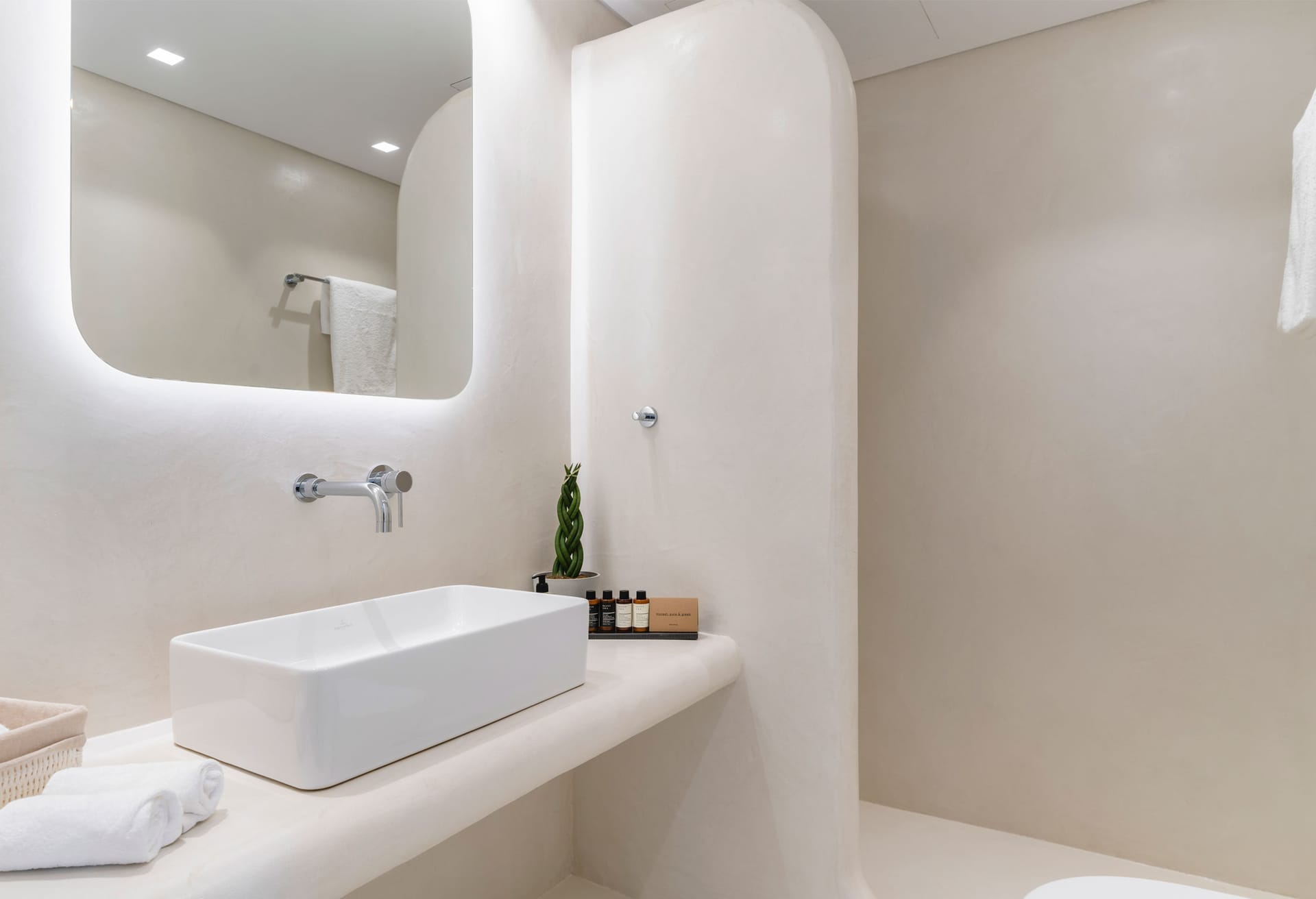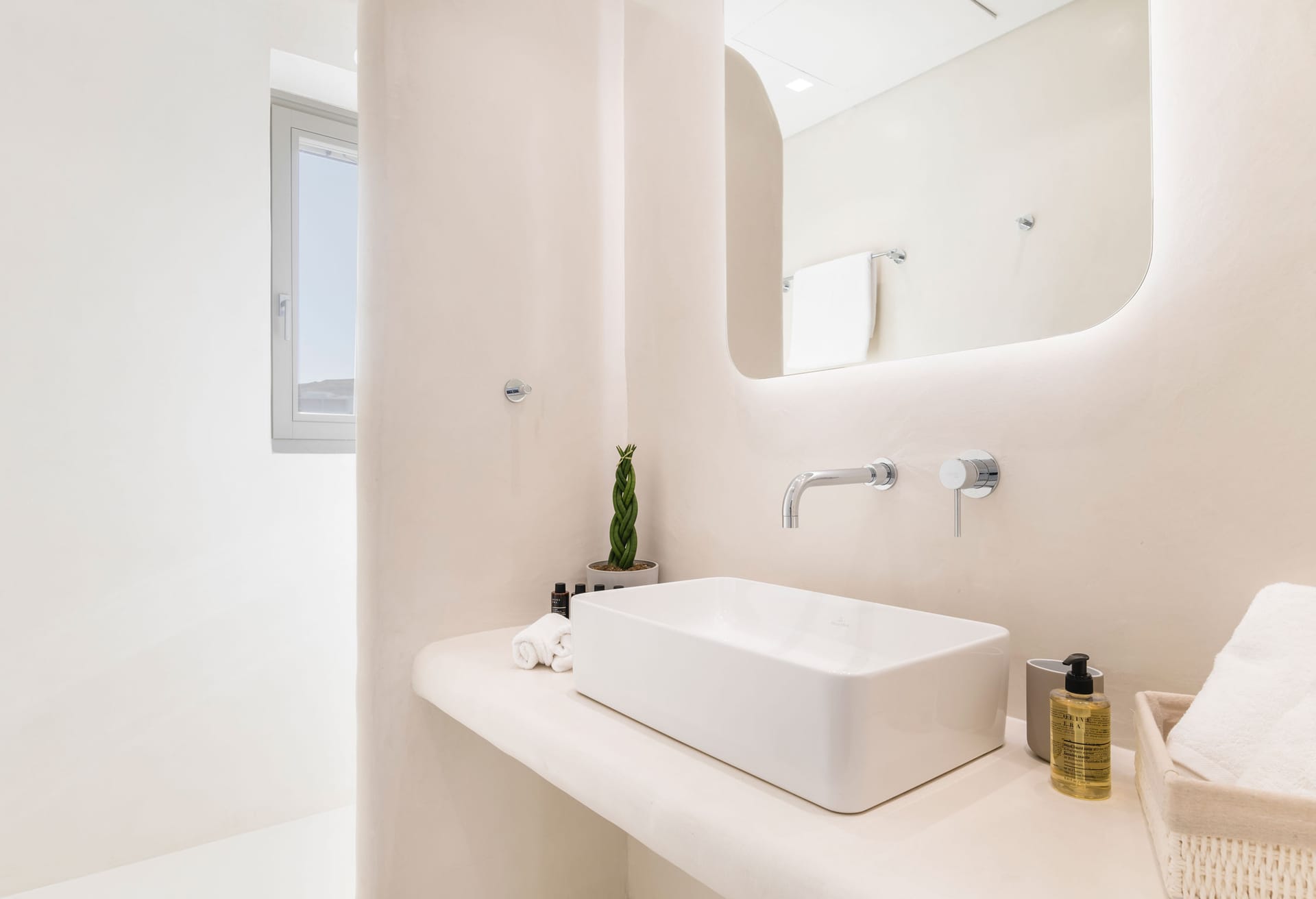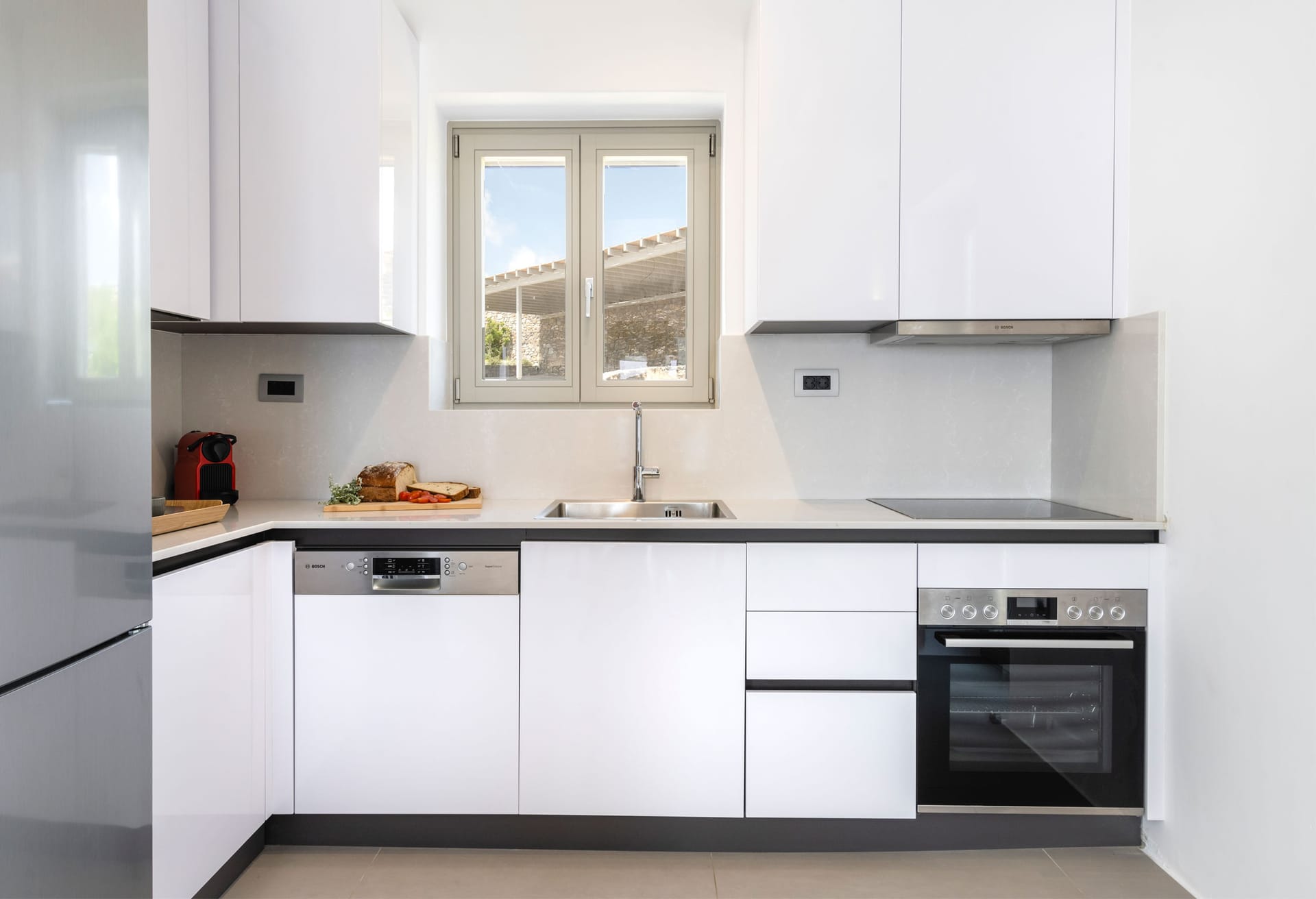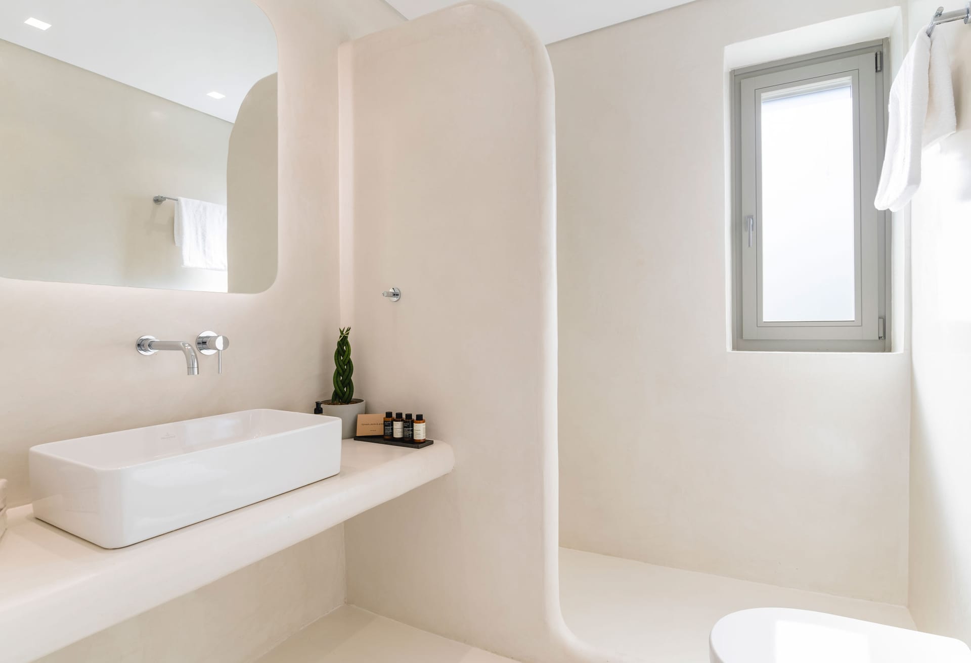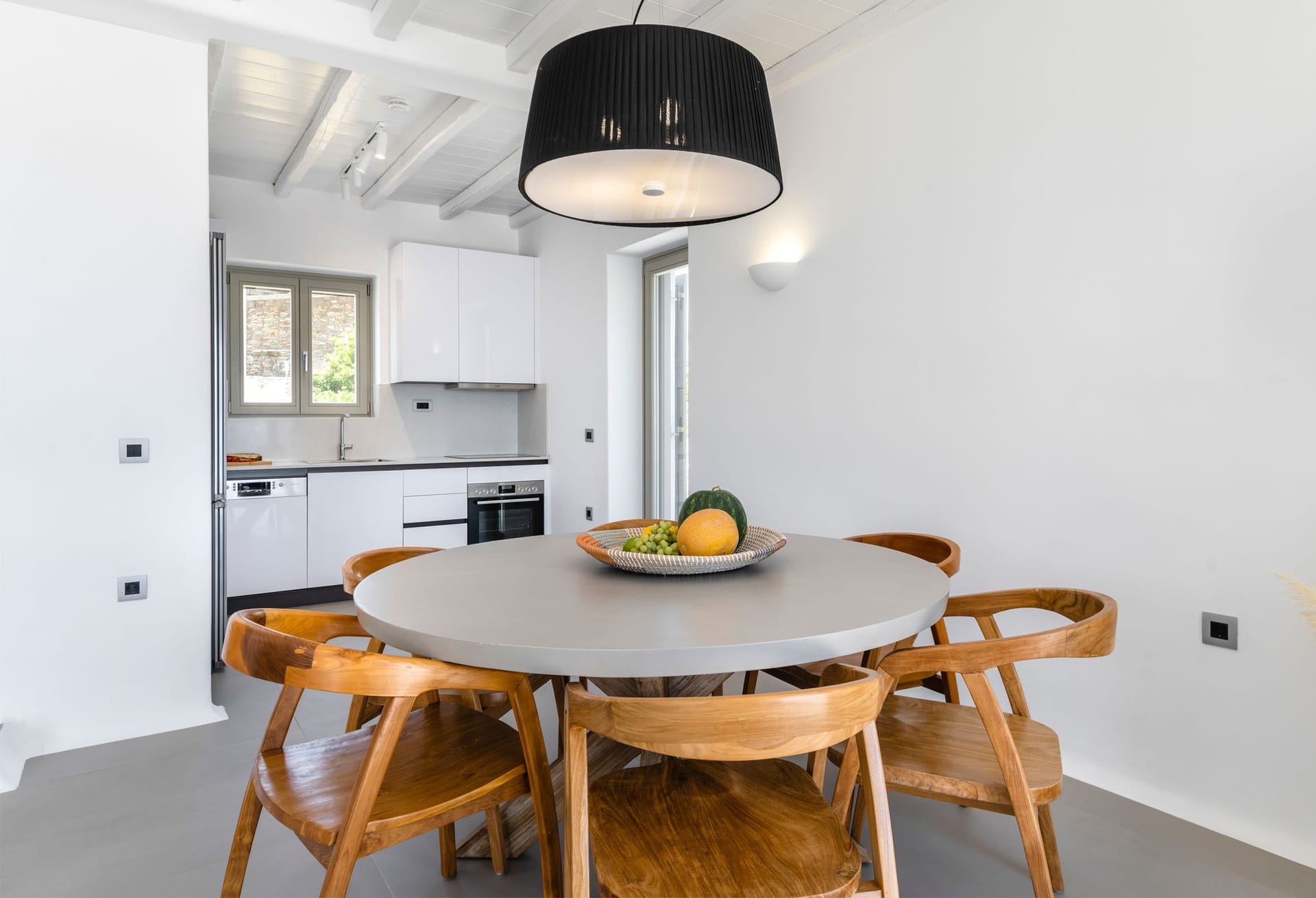 Villa Ivory 2 consists of two levels. On the main level, there is a living and dining room area with a fully equipped kitchen and two bedrooms: a master bedroom with a queen size bed, en-suite bathroom with shower and sea view and a second bedroom with two single beds, a bathroom with shower and garden view. In the outdoor area on the same level, you can find the private swimming pool with a hydromassage and sunbeds. The outdoor lounge and dinning area with the bar have an infinite and endless sea view of the Aegean Sea while protected by a pergola.