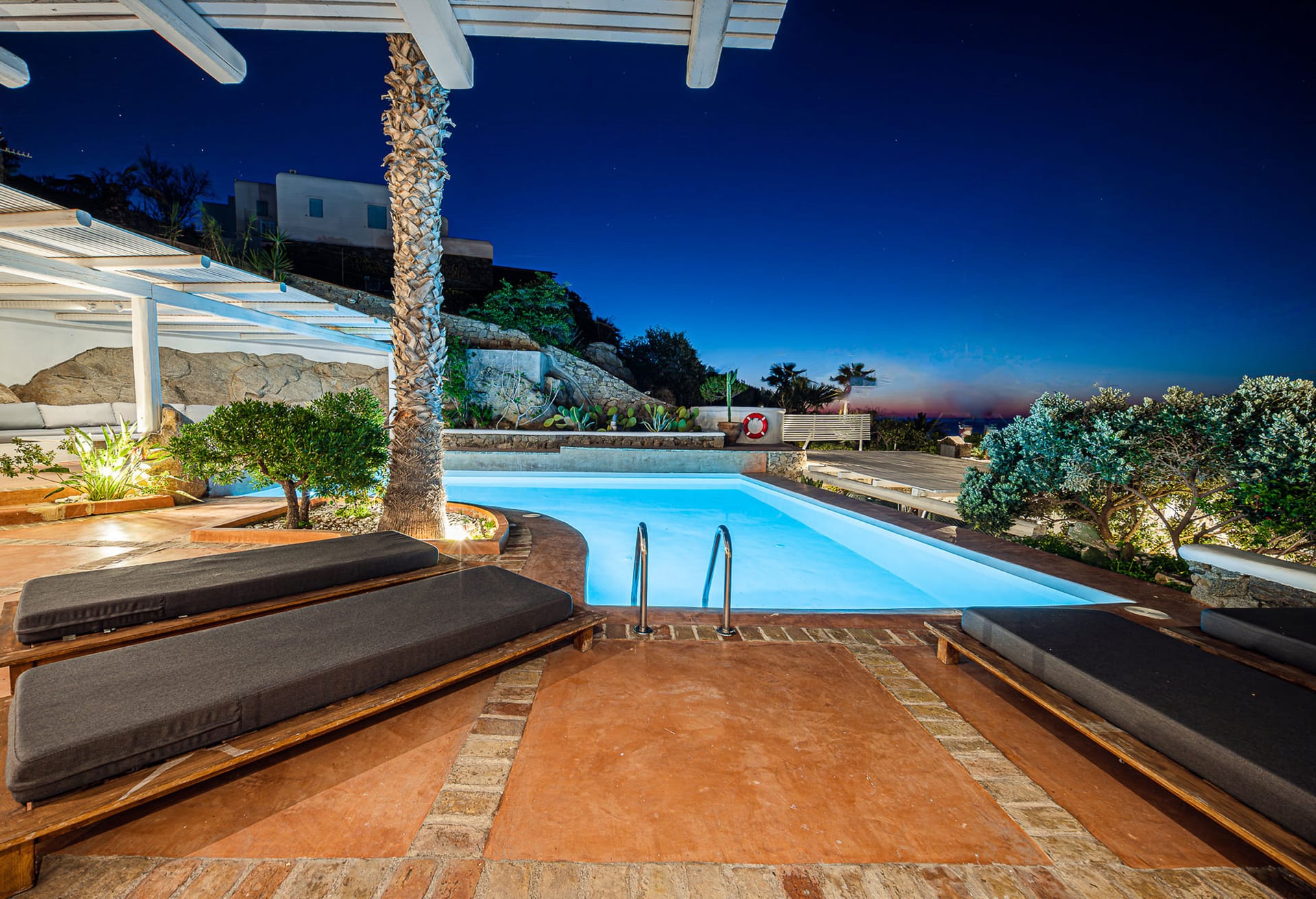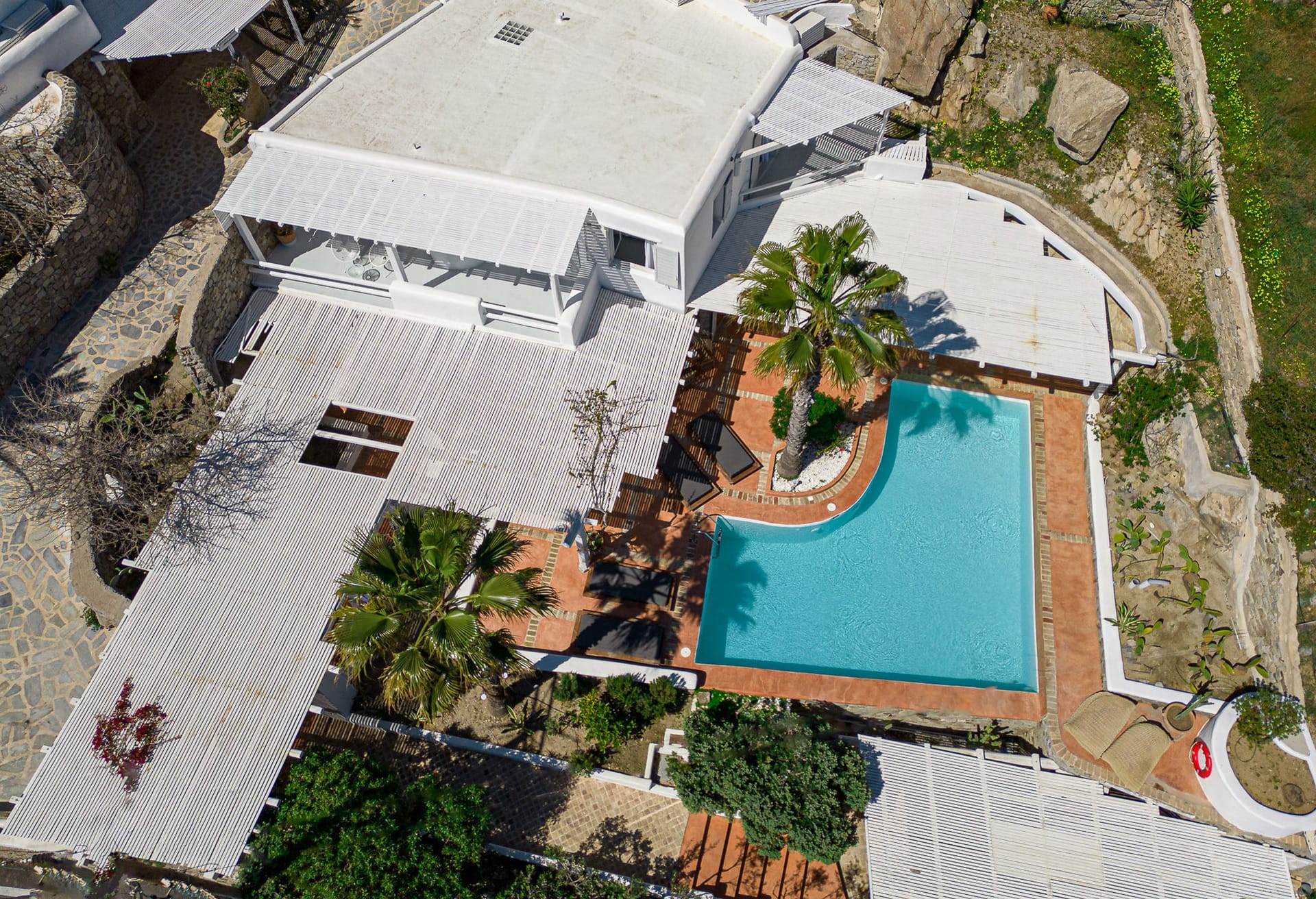 There are plenty of open spaces and verandas with pergolas and at the poolside there are umbrellas and deck chairs. The villa has 2 large parking spaces.