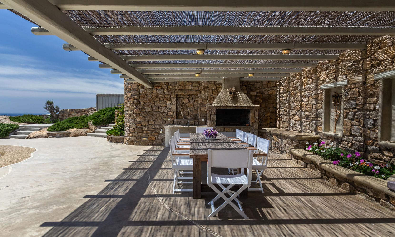 At the forefront of the villa lies a private lagoon-like infinity swimming pool, surrounded by comfortable summer furniture and a large wooden shaded pergola. This area includes a beautiful dining space and a traditional wood-fire BBQ, making it an ideal entertaining area at any time of day.