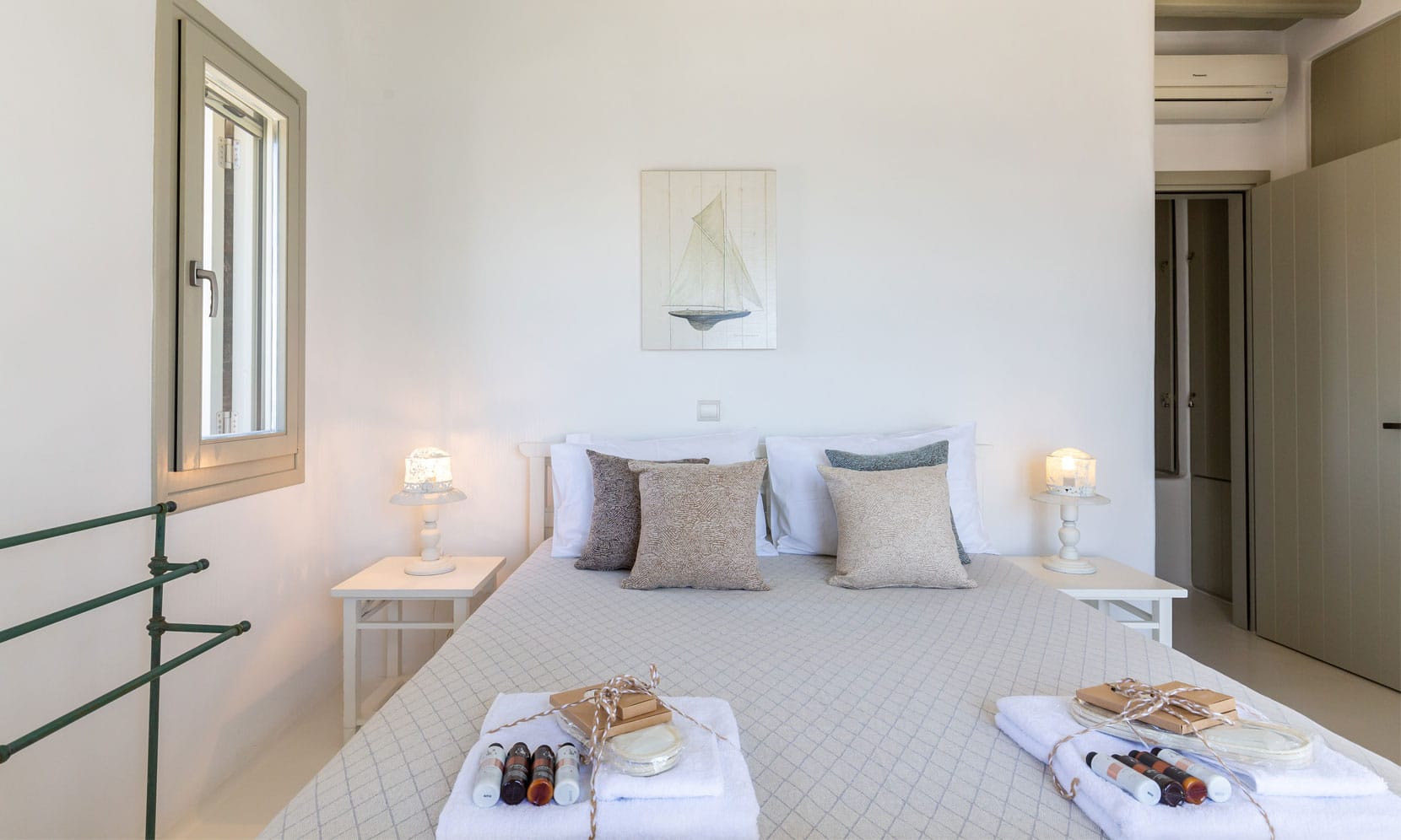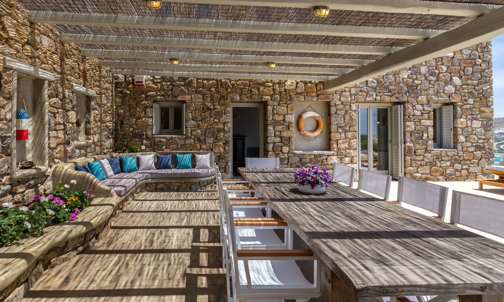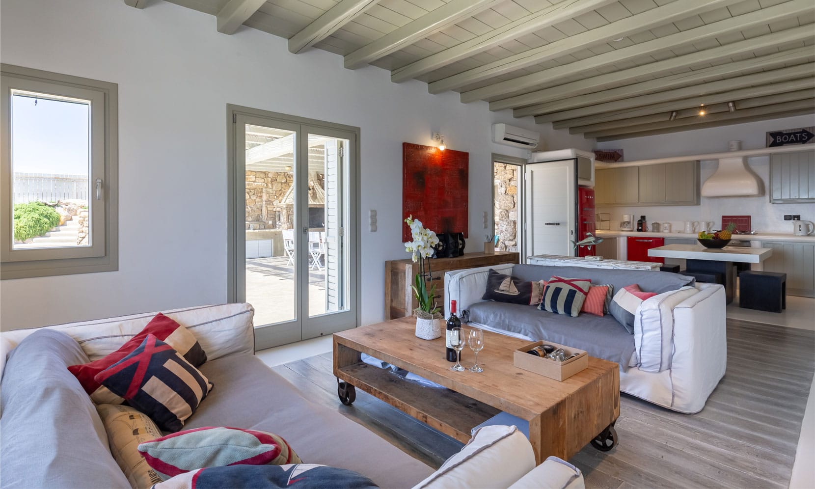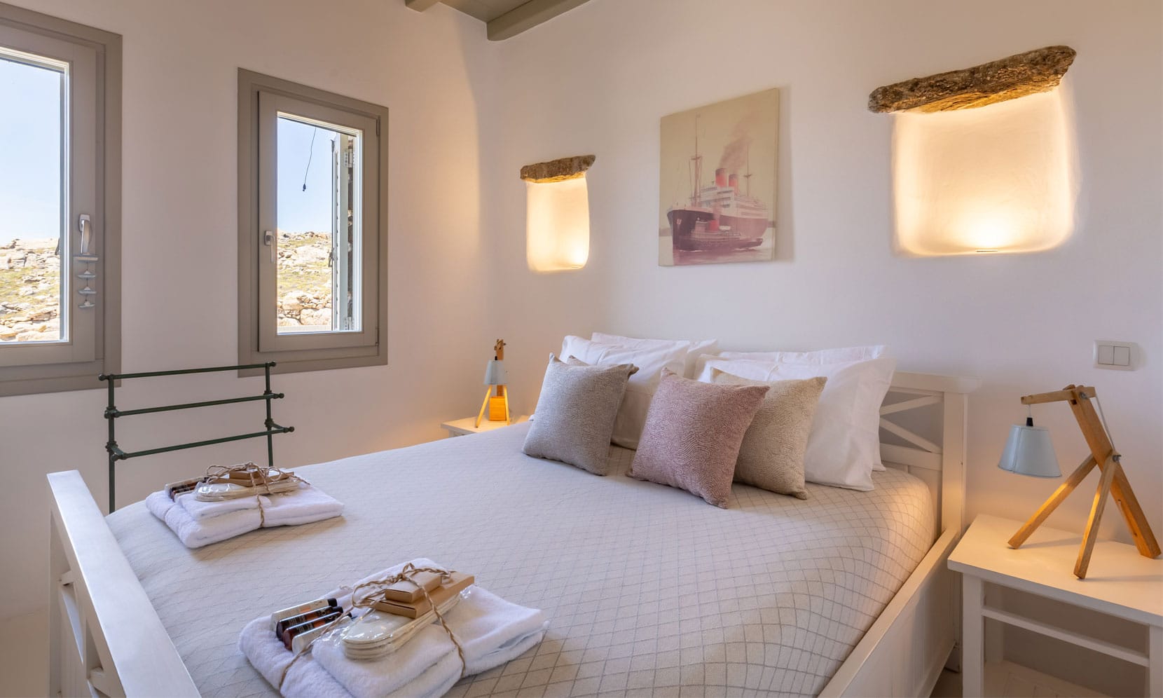 The villa's charming interior, a seamless blend of Mykonian and provincial beach house elements, complements the traditional Cycladic architecture, creating an atmosphere of comfort and elegance. Situated on 2,000 square meters of private land, this secluded retreat is located on a quiet, dead-end street, ensuring a peaceful and serene environment.
