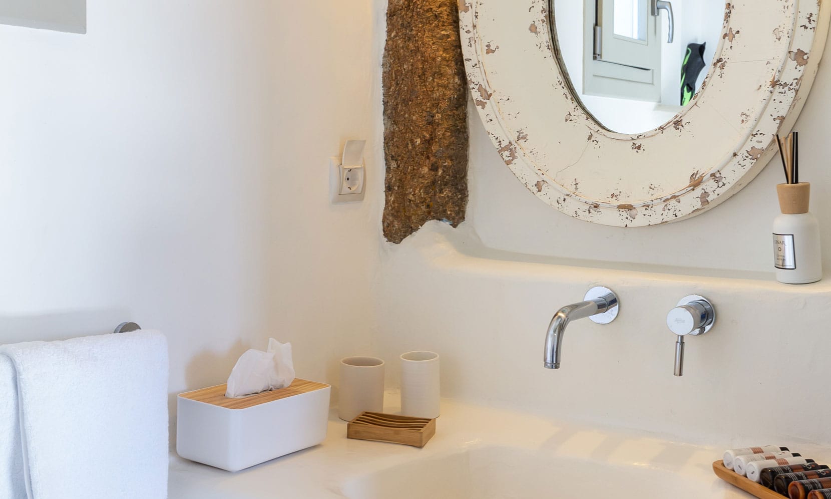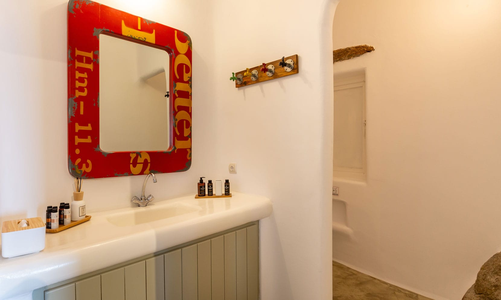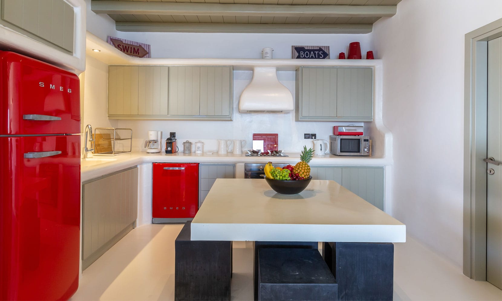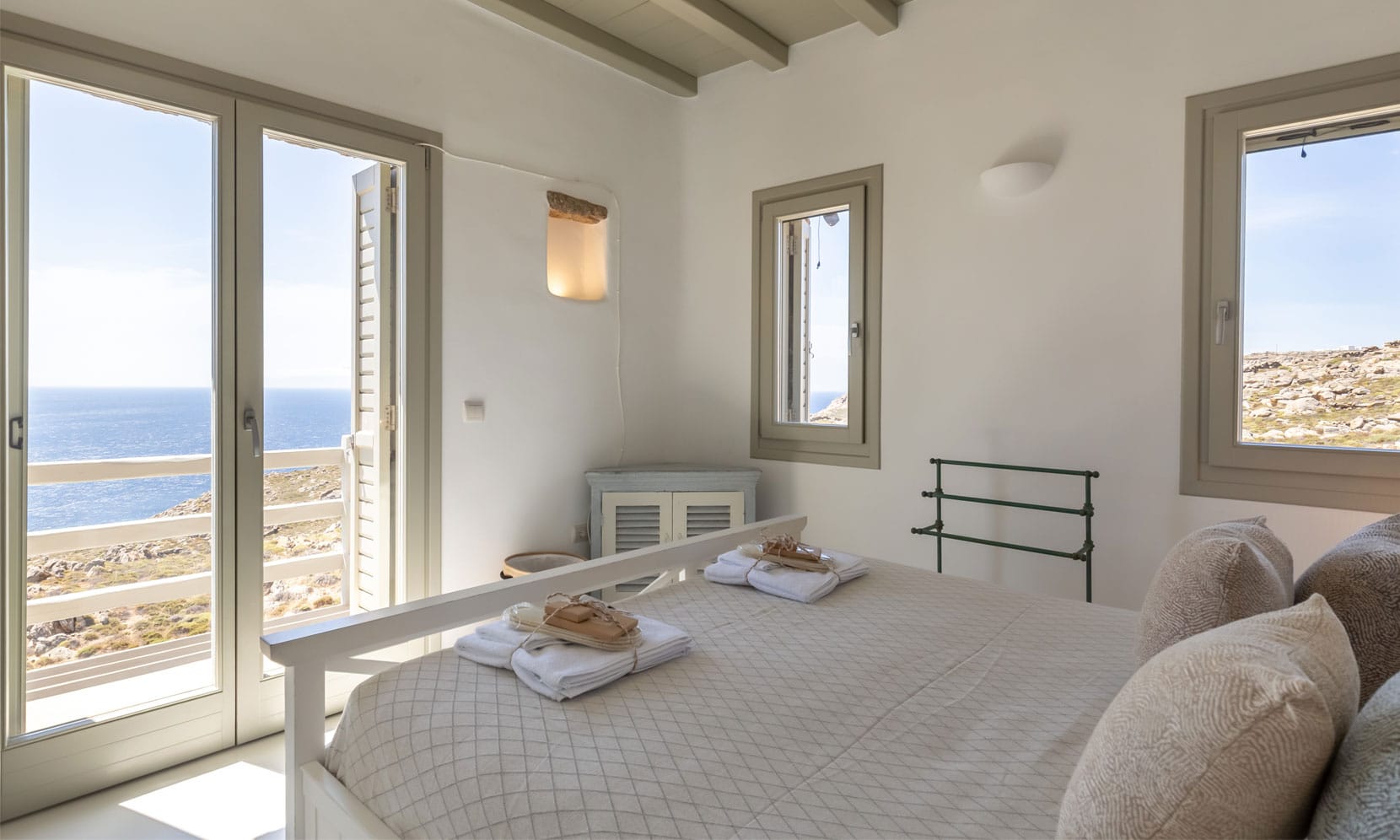 The villa's charming interior, a seamless blend of Mykonian and provincial beach house elements, complements the traditional Cycladic architecture, creating an atmosphere of comfort and elegance. Situated on 2,000 square meters of private land, this secluded retreat is located on a quiet, dead-end street, ensuring a peaceful and serene environment.