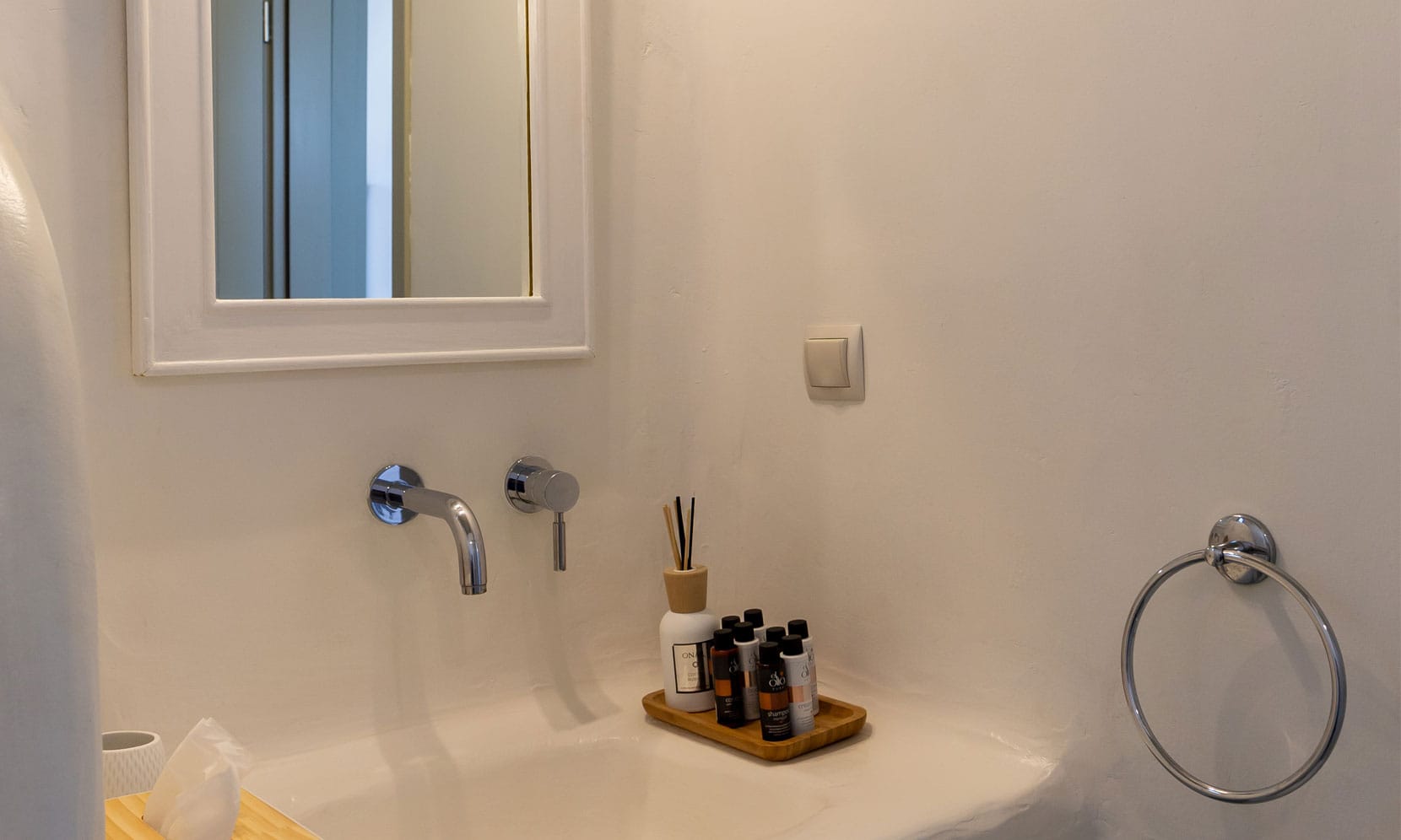 The lower terrace provides additional sunbeds and a traditional thatched sun umbrella, with direct views down to Agrari and Elia beaches. The Luxury Lagoon Villa in Mykonos is the ultimate destination for those seeking a harmonious blend of luxury, privacy, and natural beauty.