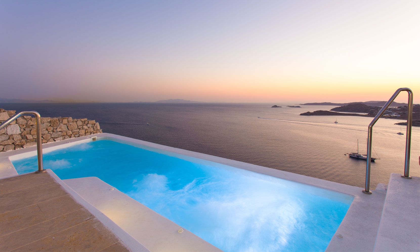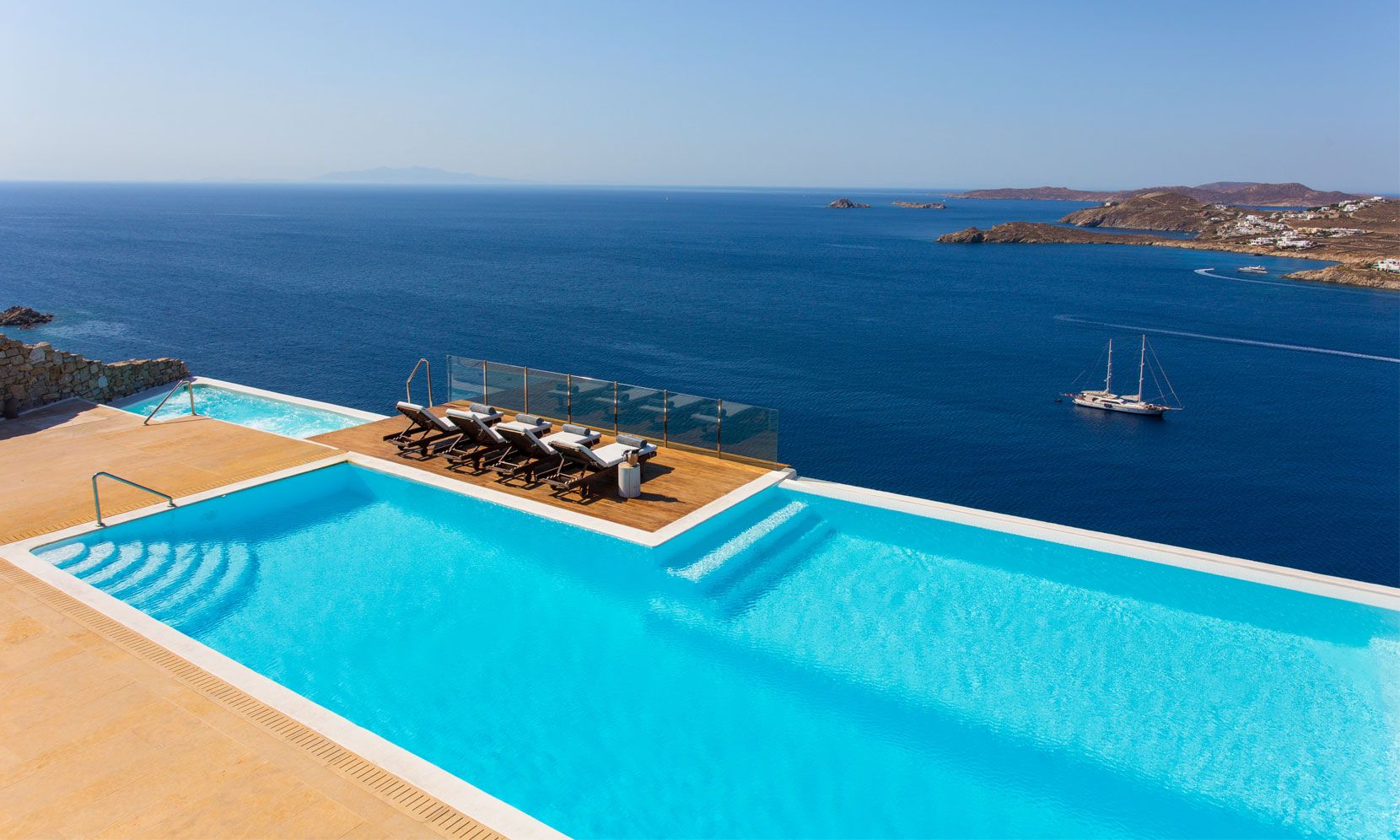 This exceptional residence enjoys one of the most magnificent views in Mykonos, over the gulf of Ornos, towards numerous islands, starting from Delos and Renia till the endless blue of the Aegean sea. Just minutes from Psarou beach and less than 3 km from town center, Lazare I is located on the unique spot of Agios Lazaros, overhanging at the very edge of the rocky shore. Built on two levels with spacious outdoor areas, infinity swimming pool with a teak deck and plenty of pillowed lounges, it offers total privacy and comfortable living, exactly as you have dreamed.
