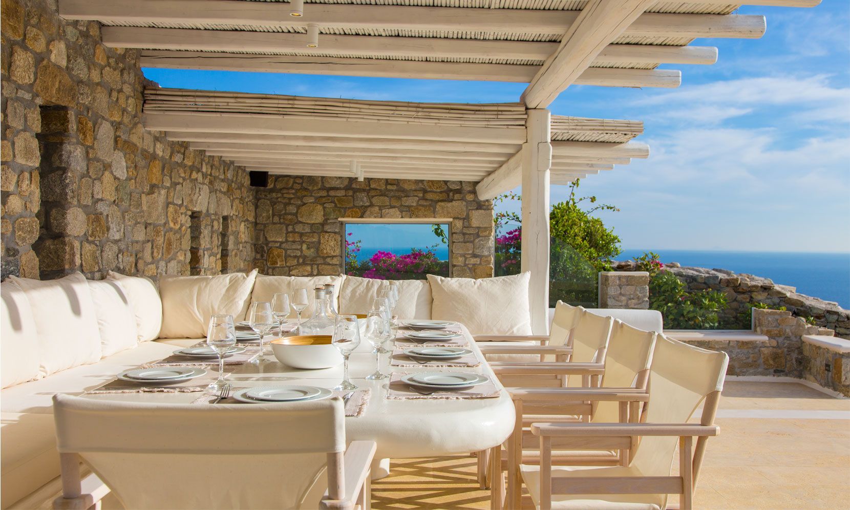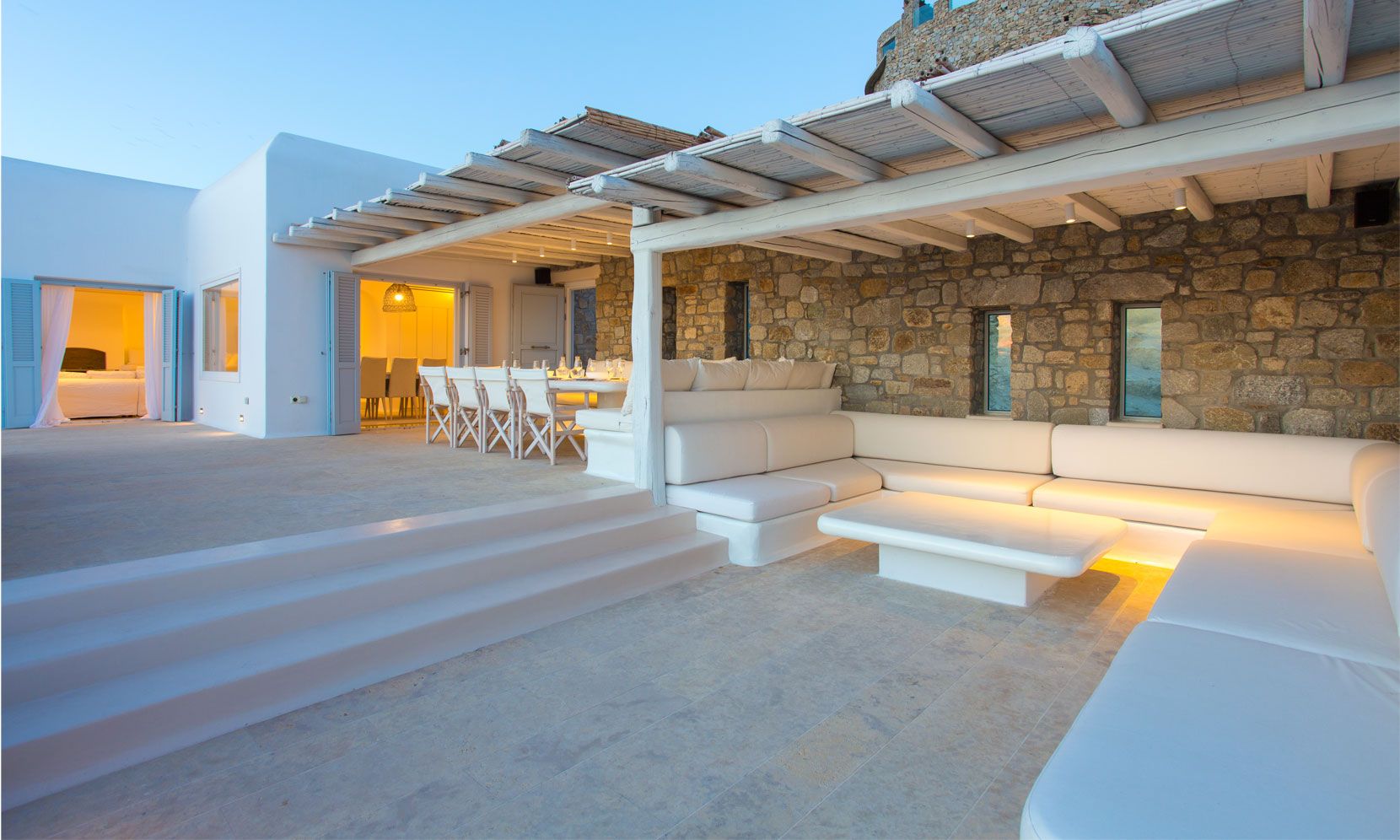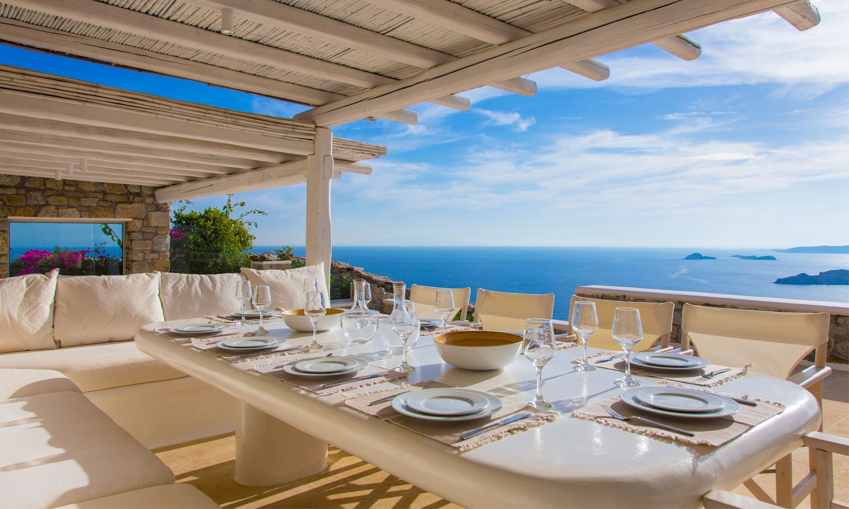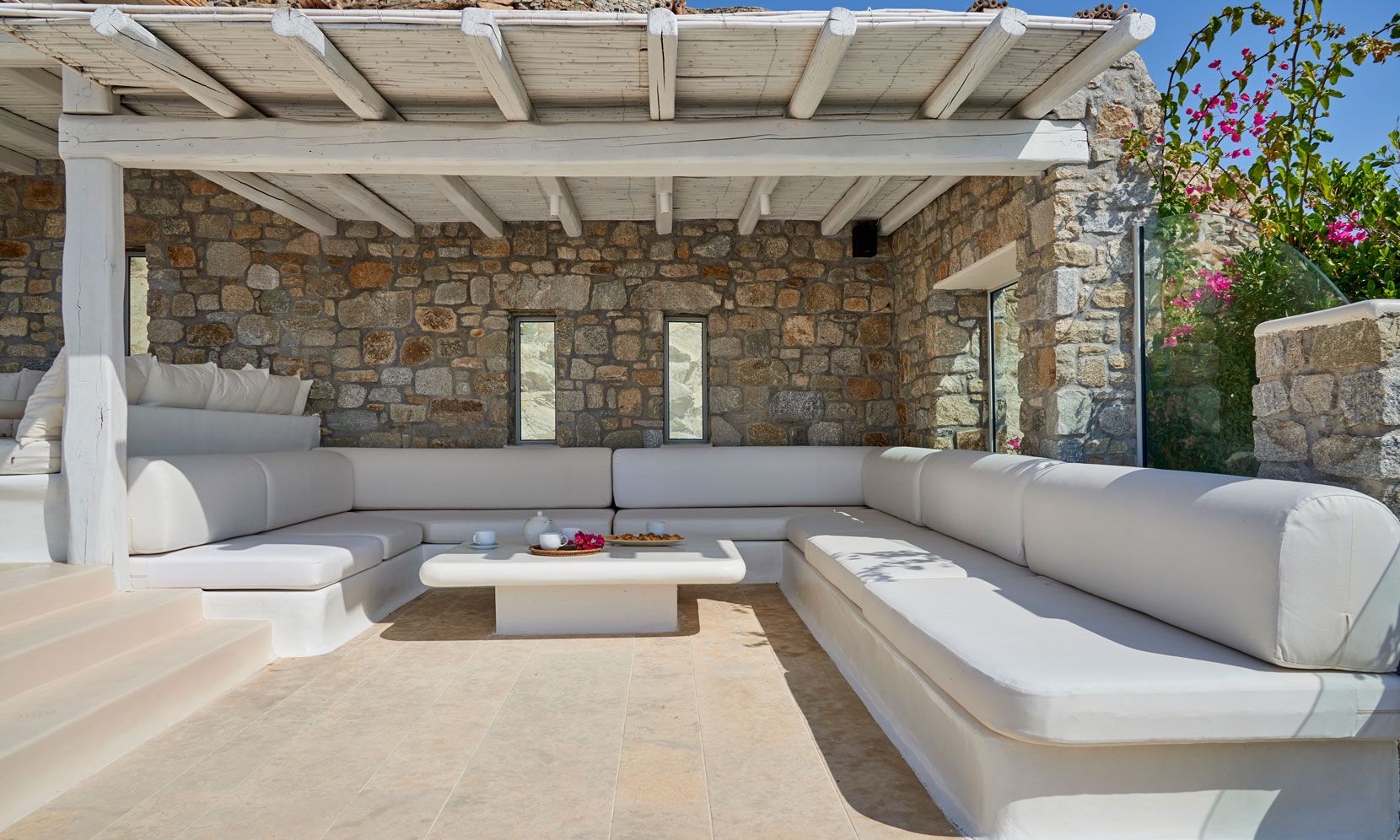 The outdoor areas fulfill every individual need in an oasis-like environment, from every aspect. The deck, almost floating above the waves and equipped with sun loungers, is perfect for leisure days soaking up the sun and the secluded pergola ideal for shaded peaceful afternoons. The upper level consists of another pergola-covered lounge together with an outdoor dining table. After a day of exploring Mykonos, probably you will gather around, enjoying iced cocktails, staring at the spectacular sunset colors. Later at night, you will relax to the sound of sea, tranquil although the sight of Ornos with the luminous yachts will definitely remind you that you are at one of the most cosmopolitan places in the world.