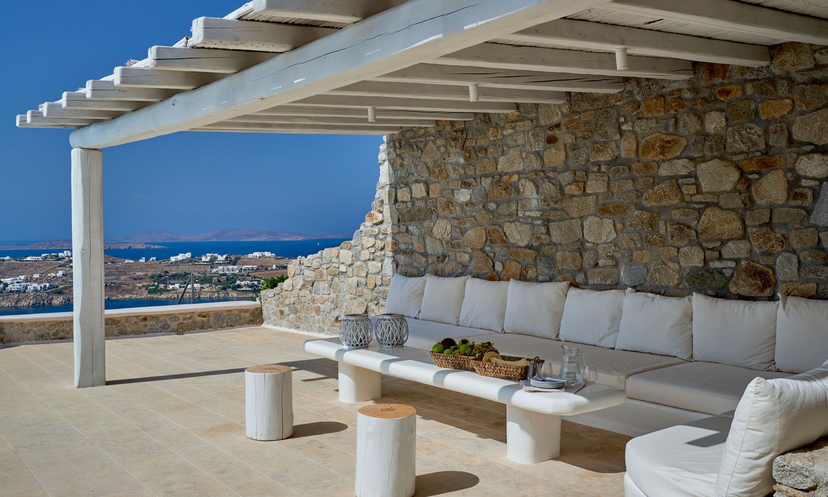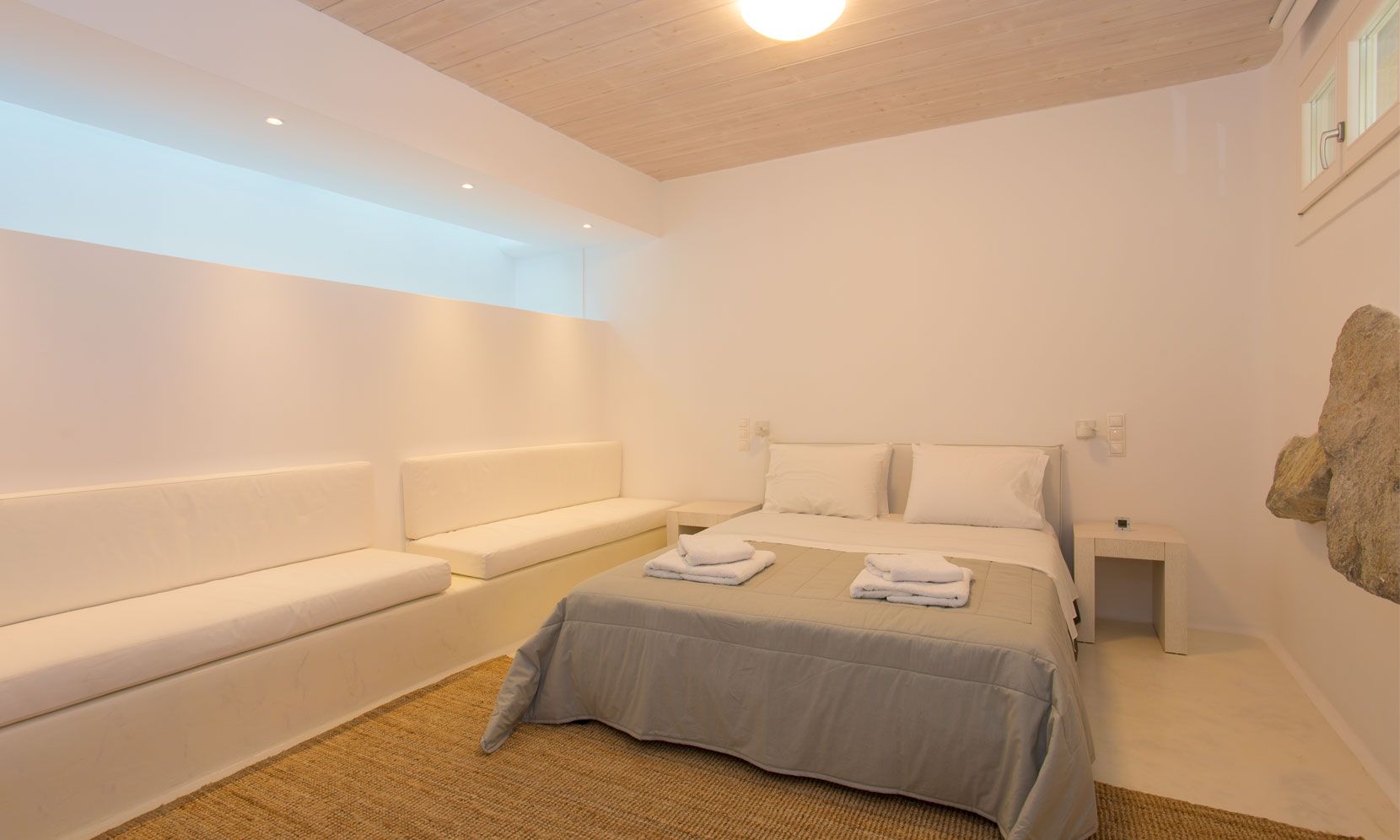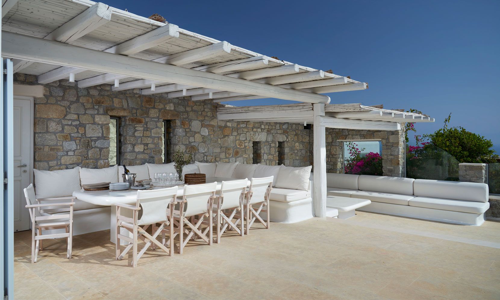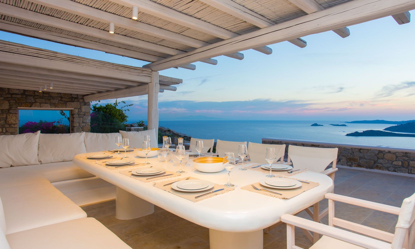 The outdoor areas fulfill every individual need in an oasis-like environment, from every aspect. The deck, almost floating above the waves and equipped with sun loungers, is perfect for leisure days soaking up the sun and the secluded pergola ideal for shaded peaceful afternoons. The upper level consists of another pergola-covered lounge together with an outdoor dining table. After a day of exploring Mykonos, probably you will gather around, enjoying iced cocktails, staring at the spectacular sunset colors. Later at night, you will relax to the sound of sea, tranquil although the sight of Ornos with the luminous yachts will definitely remind you that you are at one of the most cosmopolitan places in the world.