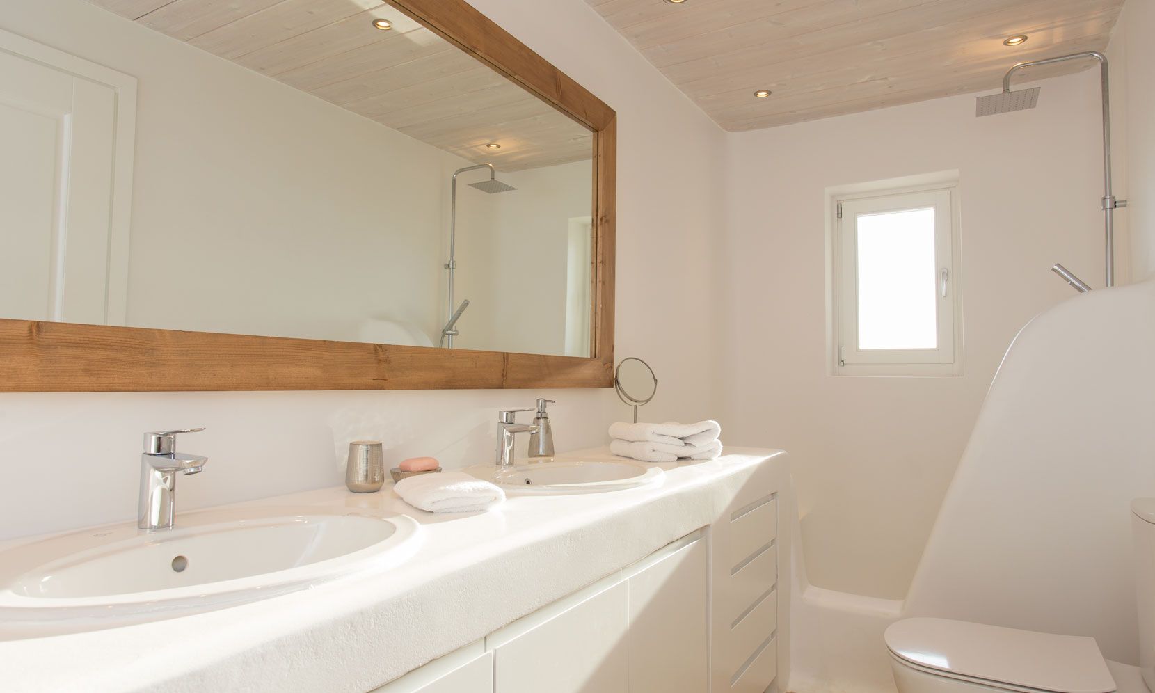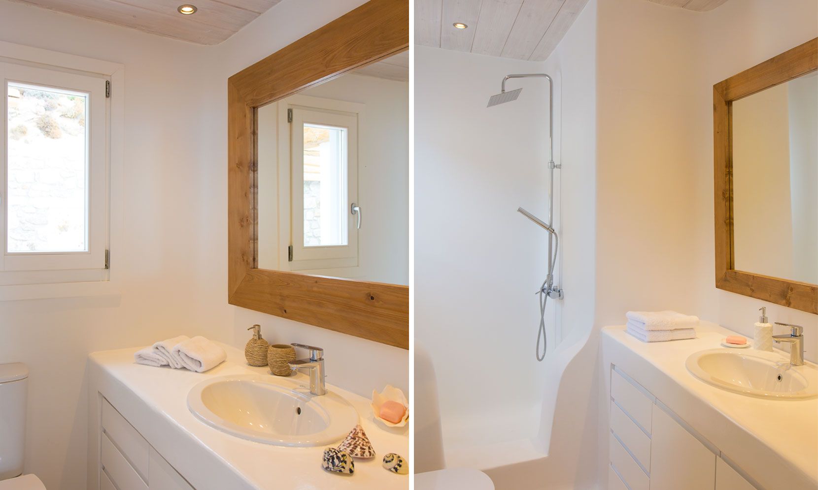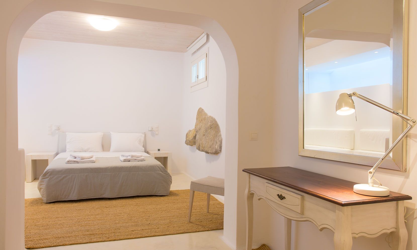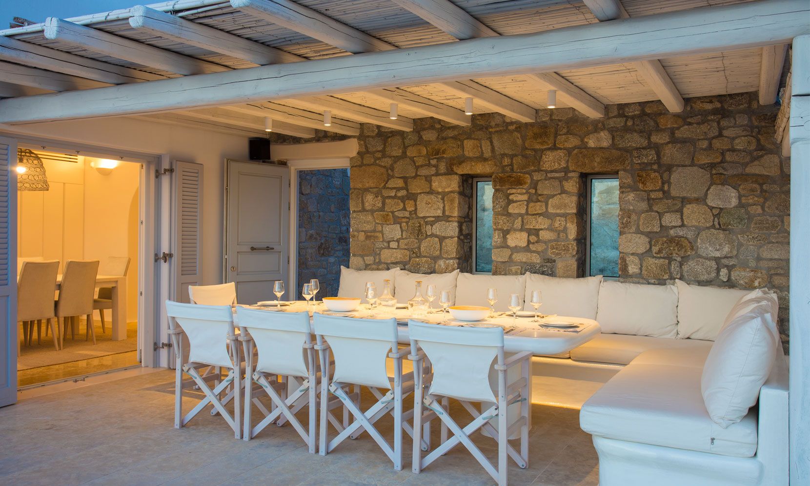 The outdoor areas fulfill every individual need in an oasis-like environment, from every aspect. The deck, almost floating above the waves and equipped with sun loungers, is perfect for leisure days soaking up the sun and the secluded pergola ideal for shaded peaceful afternoons. The upper level consists of another pergola-covered lounge together with an outdoor dining table. After a day of exploring Mykonos, probably you will gather around, enjoying iced cocktails, staring at the spectacular sunset colors. Later at night, you will relax to the sound of sea, tranquil although the sight of Ornos with the luminous yachts will definitely remind you that you are at one of the most cosmopolitan places in the world.