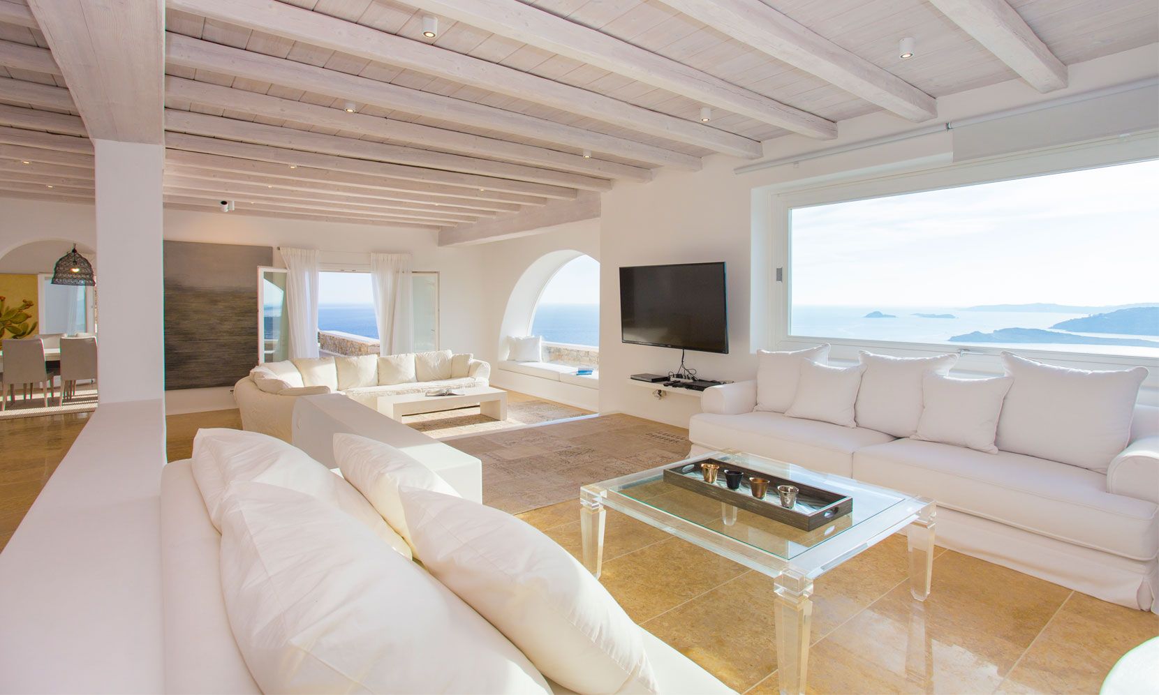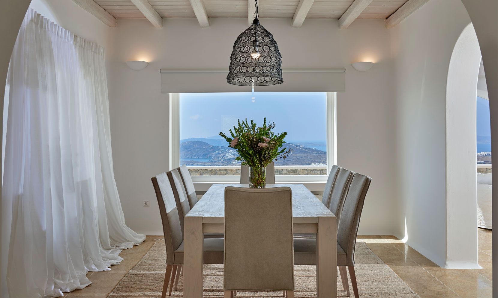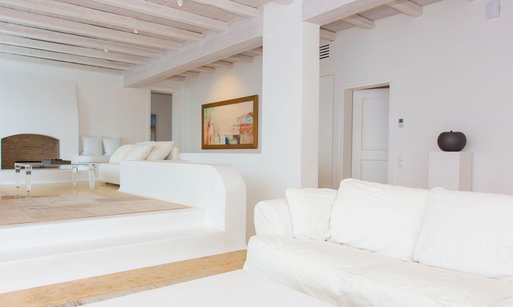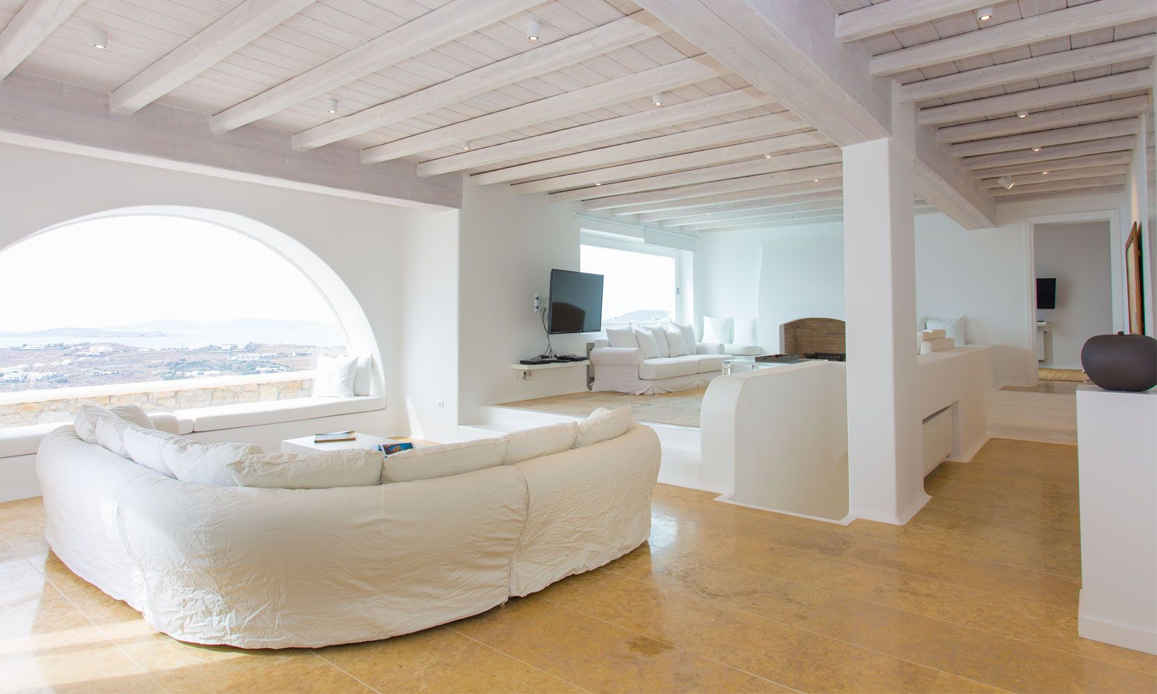 The elegant interiors, with meticulous attention to detail, blend harmoniously the Cycladic architecture with minimal aesthetics and modern art. All white-washed and generously sized with large picture windows, traditional wooden beams on the ceilings and sandy marbles on the floors, compose an impressive scenery. Even more the authentic paintings and sculptures determine the inviting atmosphere of the villa: Both calm and luxurious for you who are longing for a unique vacation home! The open plan living room around the fireplace, with white sofas and hand-made carpets is the first to start the inspiring composition. The nearby dining room and the fully equipped kitchen will undoubtedly attract you to spend time also indoors. As for the six bedrooms, all with en-suite bathrooms, they are suitable for sleeping in comfort and style, looking directly at the sea even when you are lying in bed. Decorated and furnished in earth light tones, each one differs from the others, tailored to meet the highest expectations.