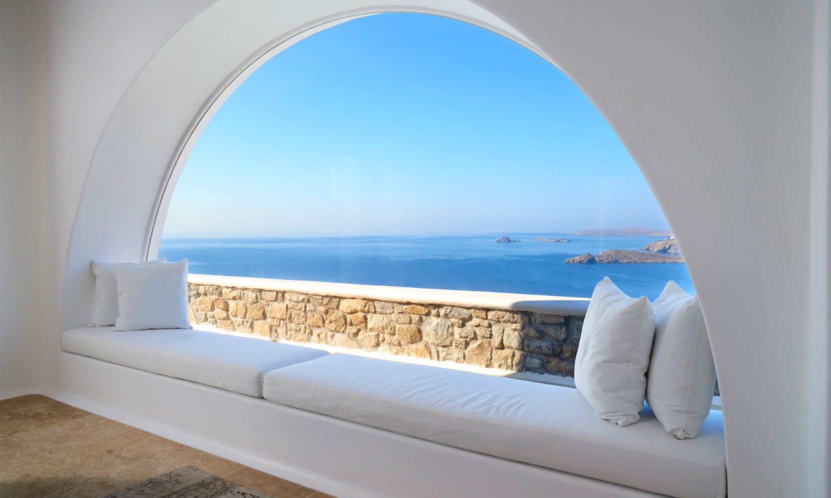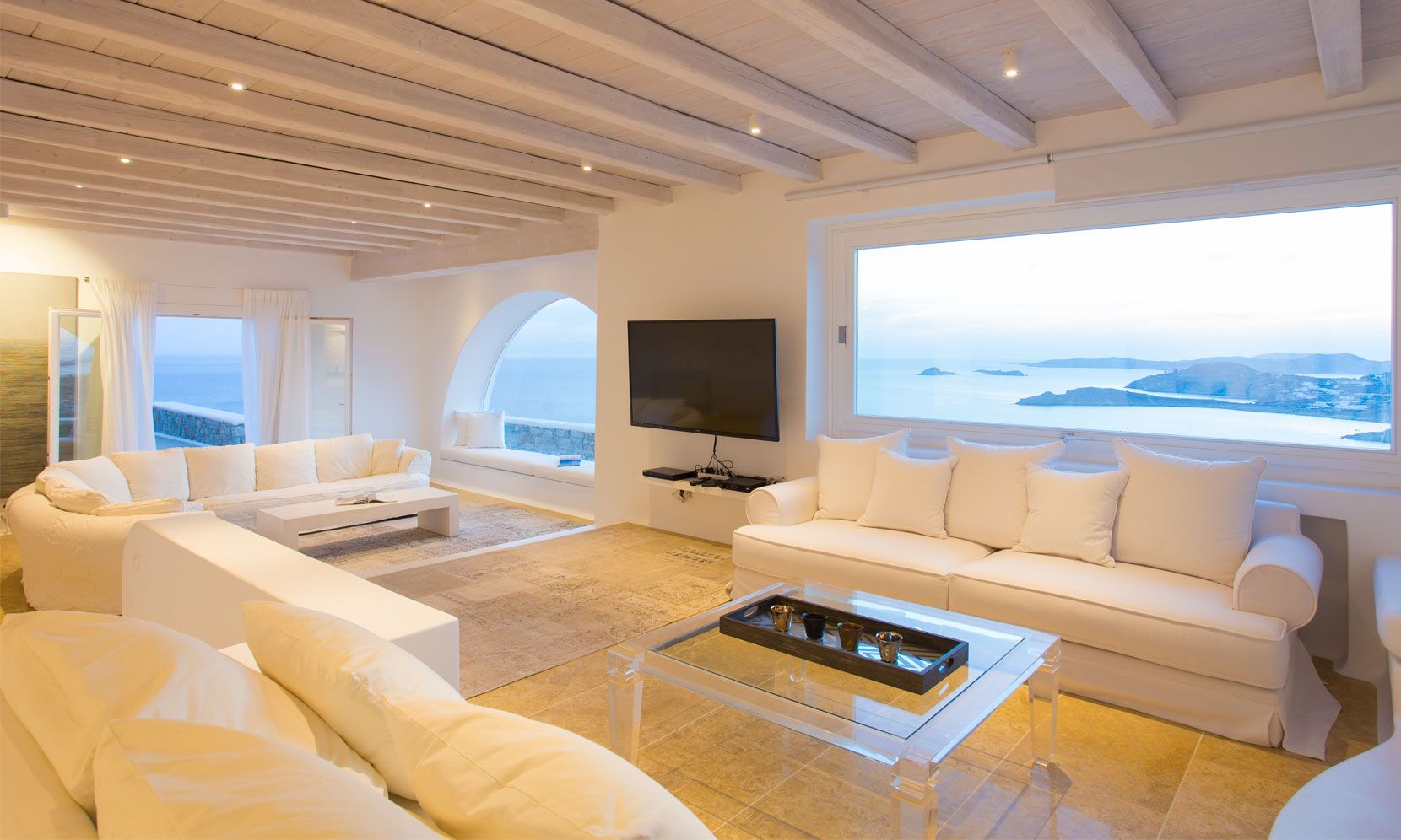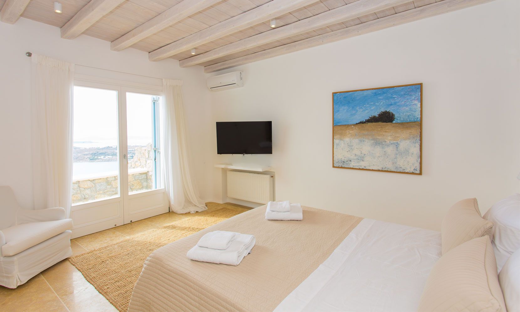 The elegant interiors, with meticulous attention to detail, blend harmoniously the Cycladic architecture with minimal aesthetics and modern art. All white-washed and generously sized with large picture windows, traditional wooden beams on the ceilings and sandy marbles on the floors, compose an impressive scenery. Even more the authentic paintings and sculptures determine the inviting atmosphere of the villa: Both calm and luxurious for you who are longing for a unique vacation home! The open plan living room around the fireplace, with white sofas and hand-made carpets is the first to start the inspiring composition. The nearby dining room and the fully equipped kitchen will undoubtedly attract you to spend time also indoors. As for the six bedrooms, all with en-suite bathrooms, they are suitable for sleeping in comfort and style, looking directly at the sea even when you are lying in bed. Decorated and furnished in earth light tones, each one differs from the others, tailored to meet the highest expectations.