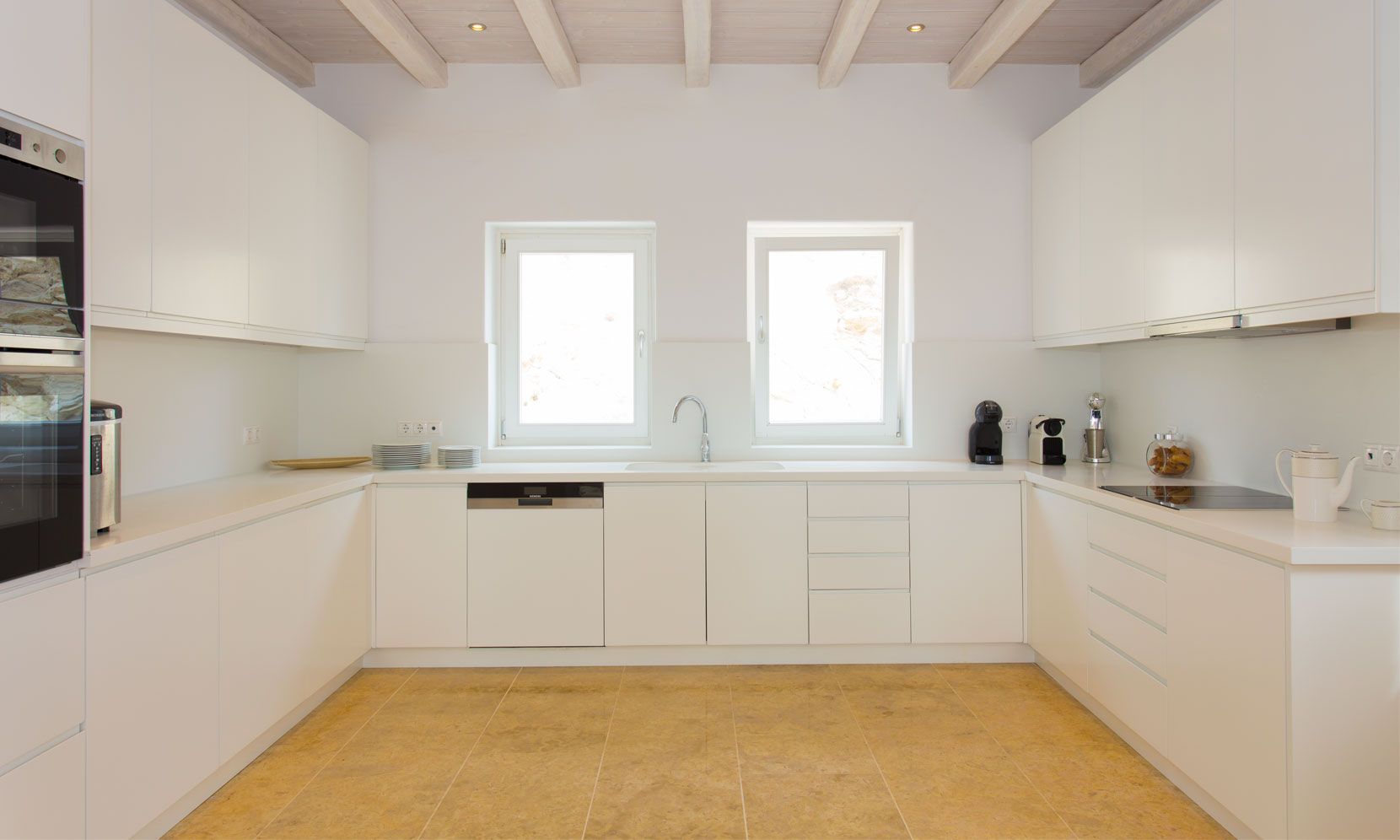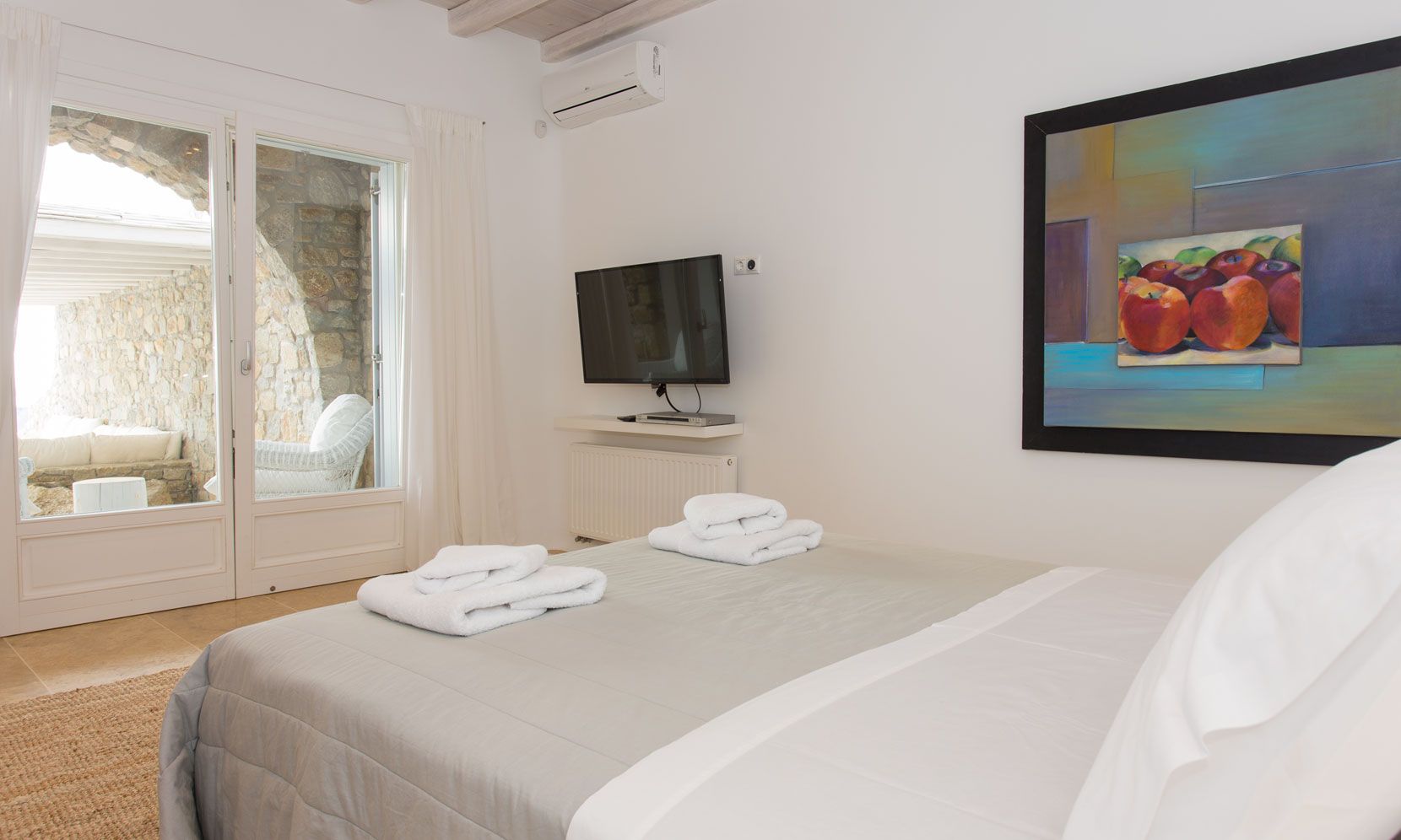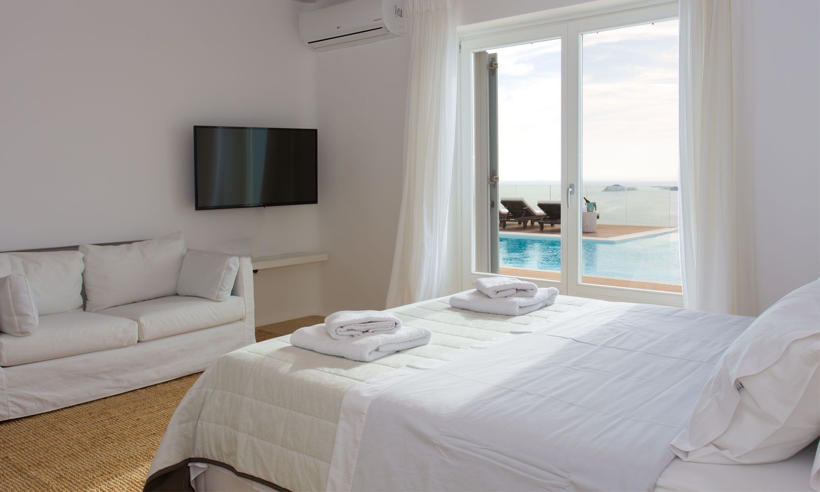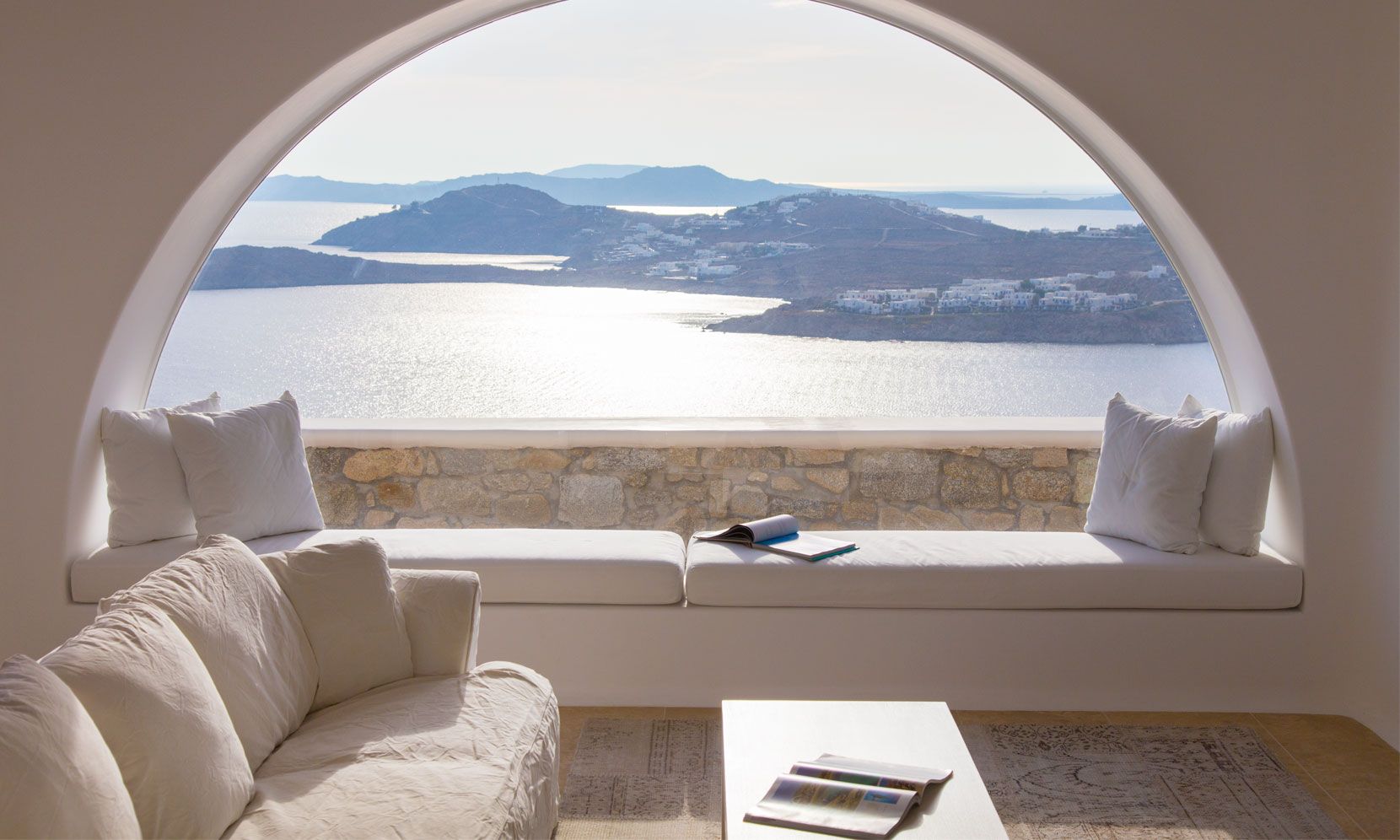 The elegant interiors, with meticulous attention to detail, blend harmoniously the Cycladic architecture with minimal aesthetics and modern art. All white-washed and generously sized with large picture windows, traditional wooden beams on the ceilings and sandy marbles on the floors, compose an impressive scenery. Even more the authentic paintings and sculptures determine the inviting atmosphere of the villa: Both calm and luxurious for you who are longing for a unique vacation home! The open plan living room around the fireplace, with white sofas and hand-made carpets is the first to start the inspiring composition. The nearby dining room and the fully equipped kitchen will undoubtedly attract you to spend time also indoors. As for the six bedrooms, all with en-suite bathrooms, they are suitable for sleeping in comfort and style, looking directly at the sea even when you are lying in bed. Decorated and furnished in earth light tones, each one differs from the others, tailored to meet the highest expectations.