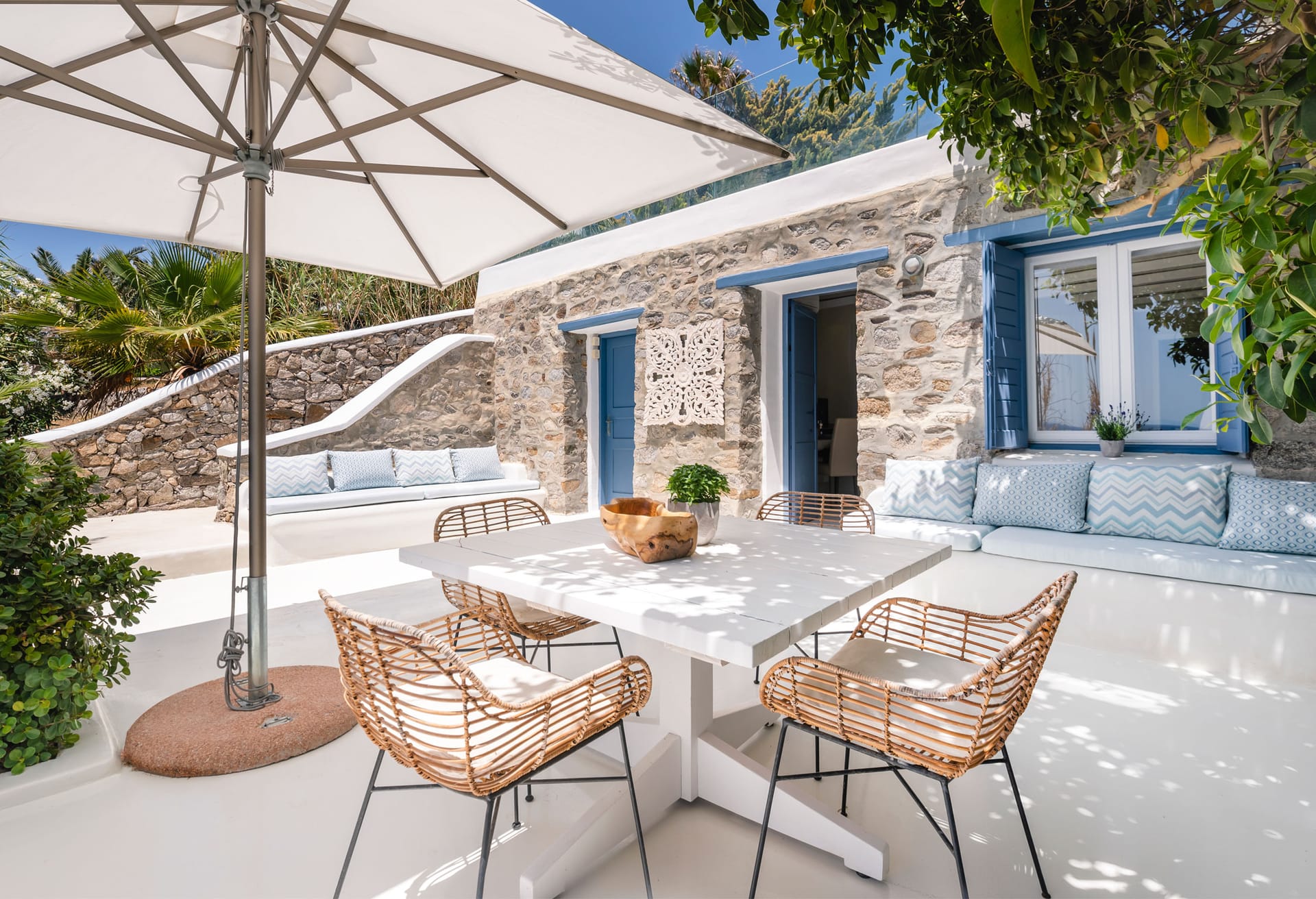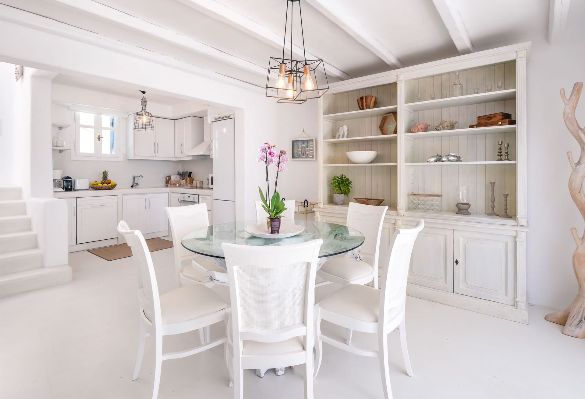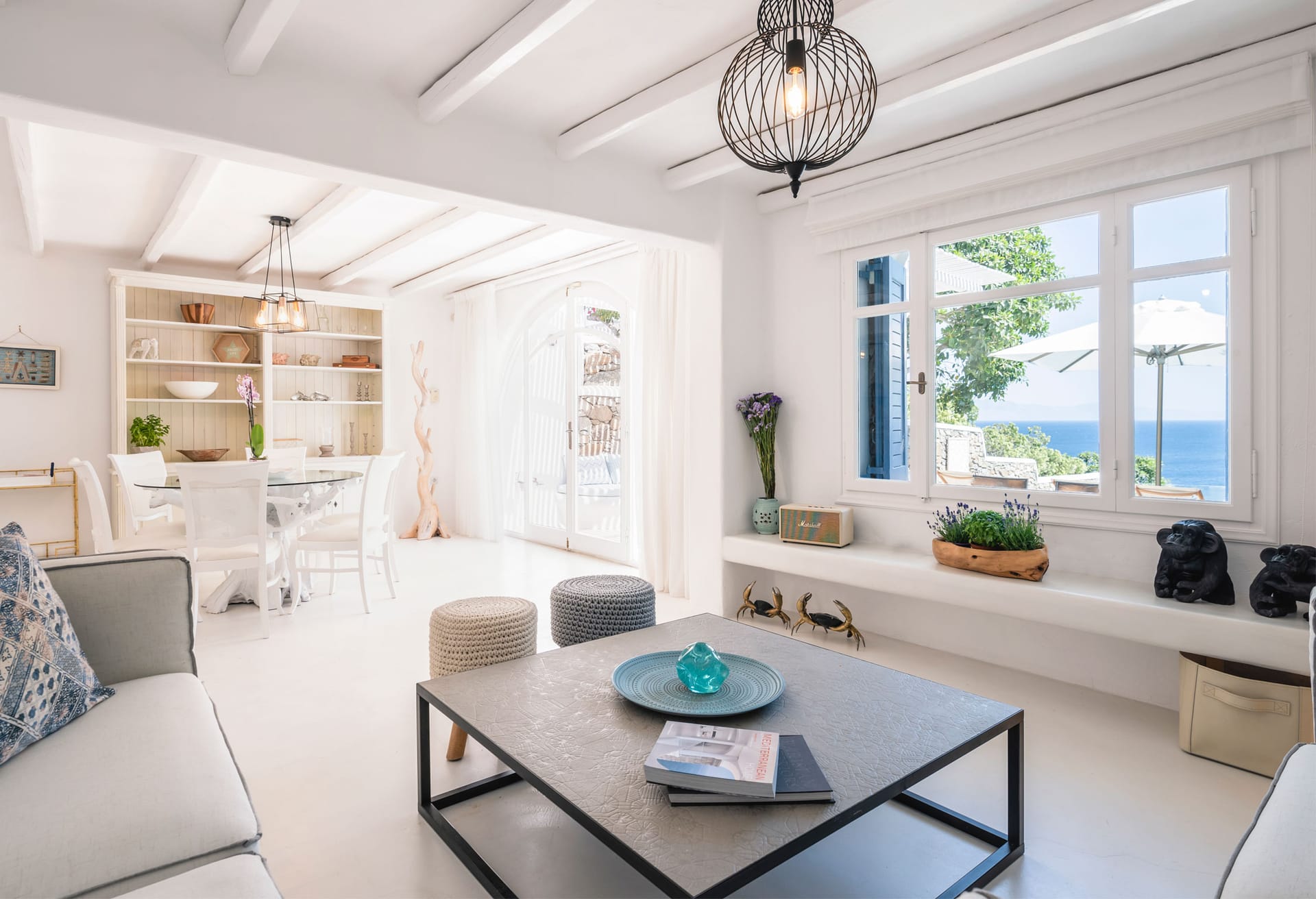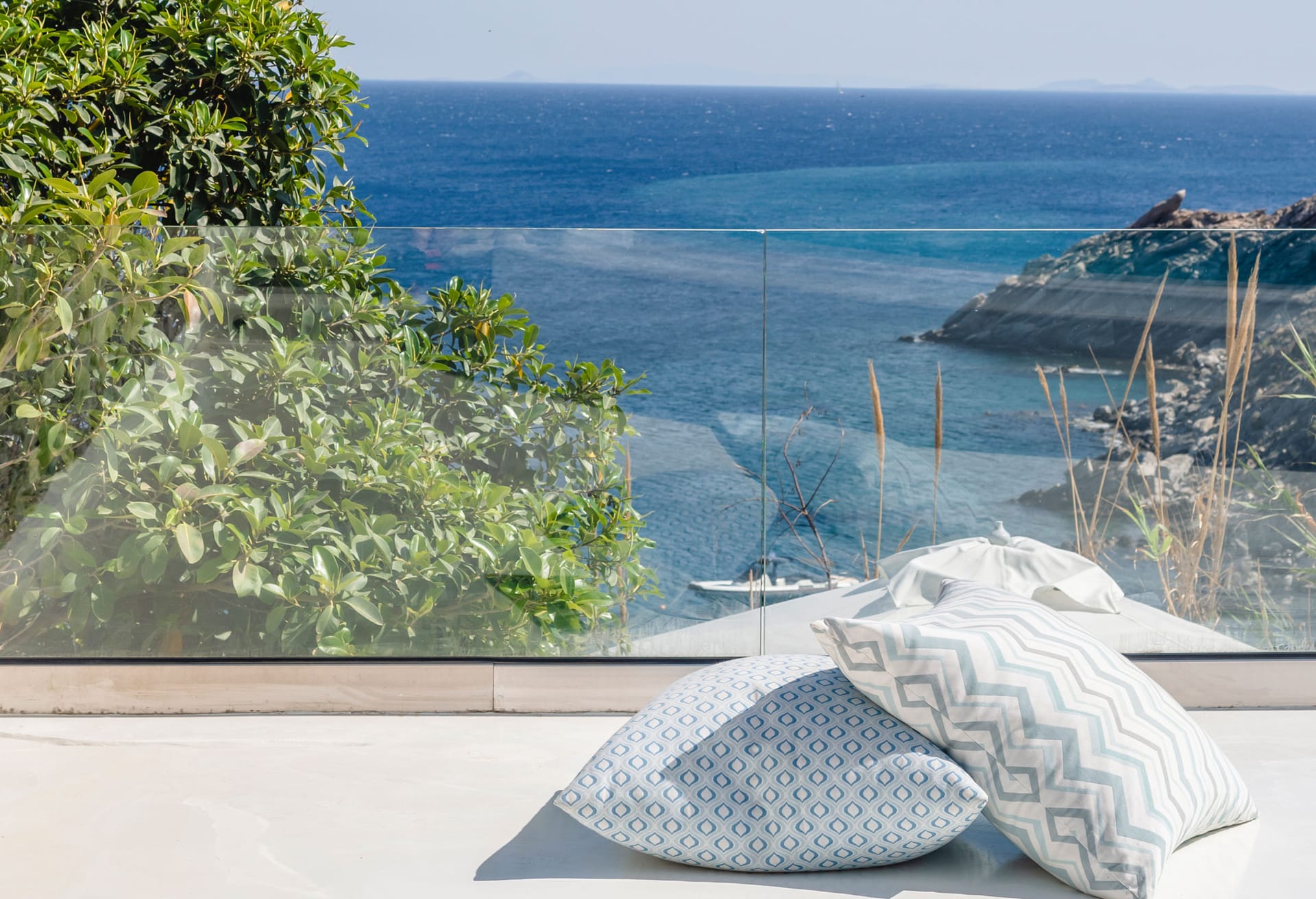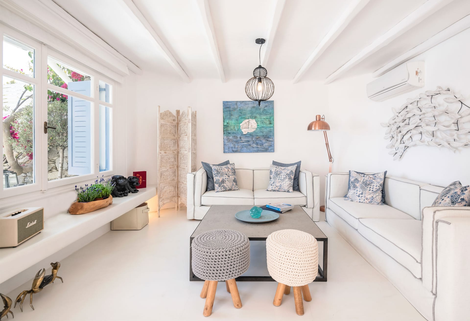 Influenced by traditional tone, the bright white colors mixed with natural stones and decorative details, vastly incorporating natural materials and focusing on simple geometric shapes result to an easy and breezy ambience; providing fashionable elegance, absolute comfort and tranquility. The exclusive Aleomandra peninsula lies at the southwestern shore of Mykonos facing the island of Delos. Villa Lucy is located at a seaside spot in Aleomandra overlooking the Aegean Sea.The renowned beaches of Ornos and Agios Ioannis are in a short distance while the cosmopolitan Mykonos town lies about 4km away.