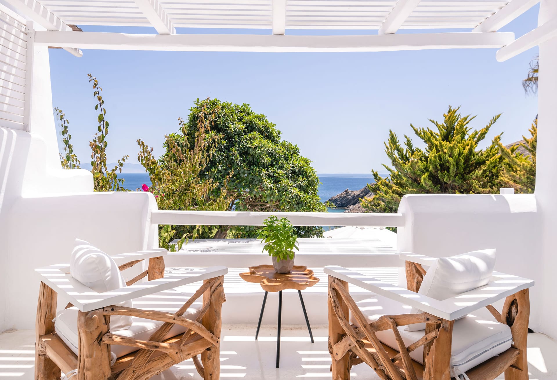 Junior Suite 23 with sea view. 1 Open private patio. Queen size bed, Independent entrance. Living area. The room is equipped with kitchenet, fridge, coffee and tea amenities, sound system, TV, safe box, hairdryer, A/C, bathroom amenities and towels.