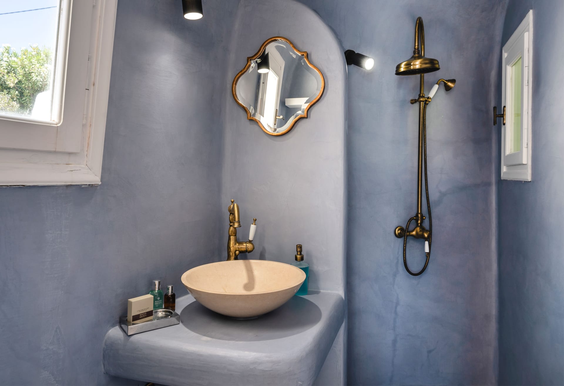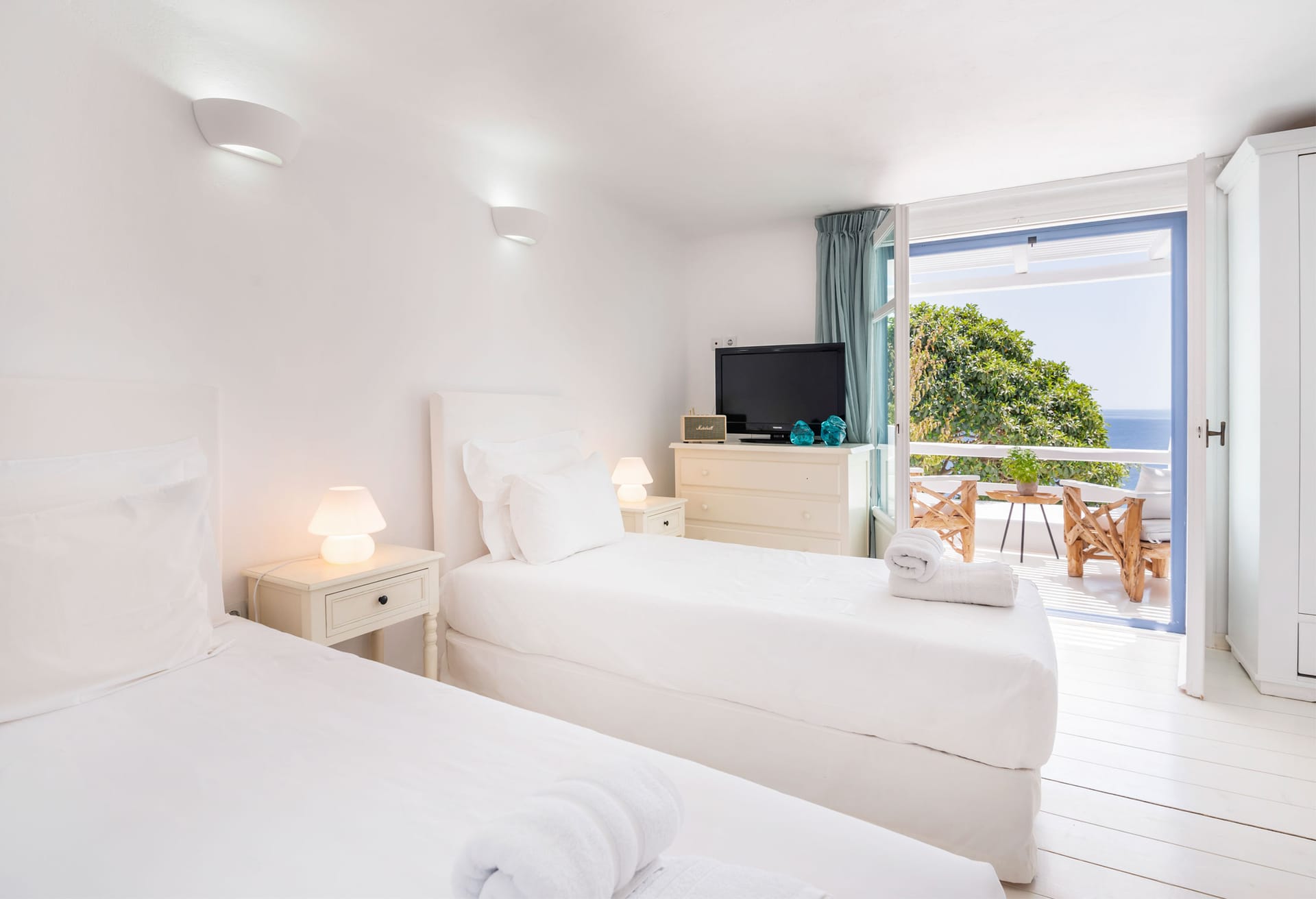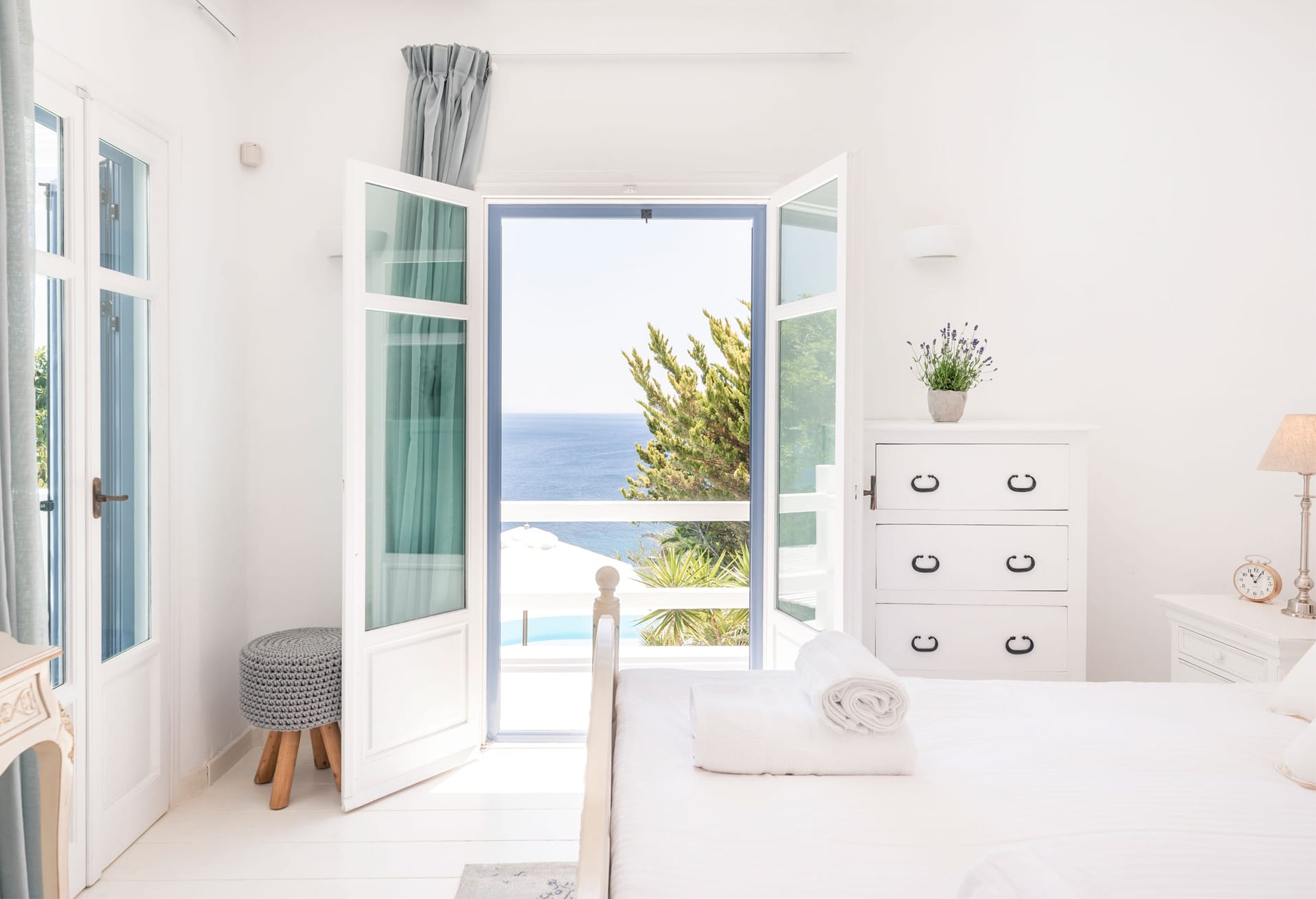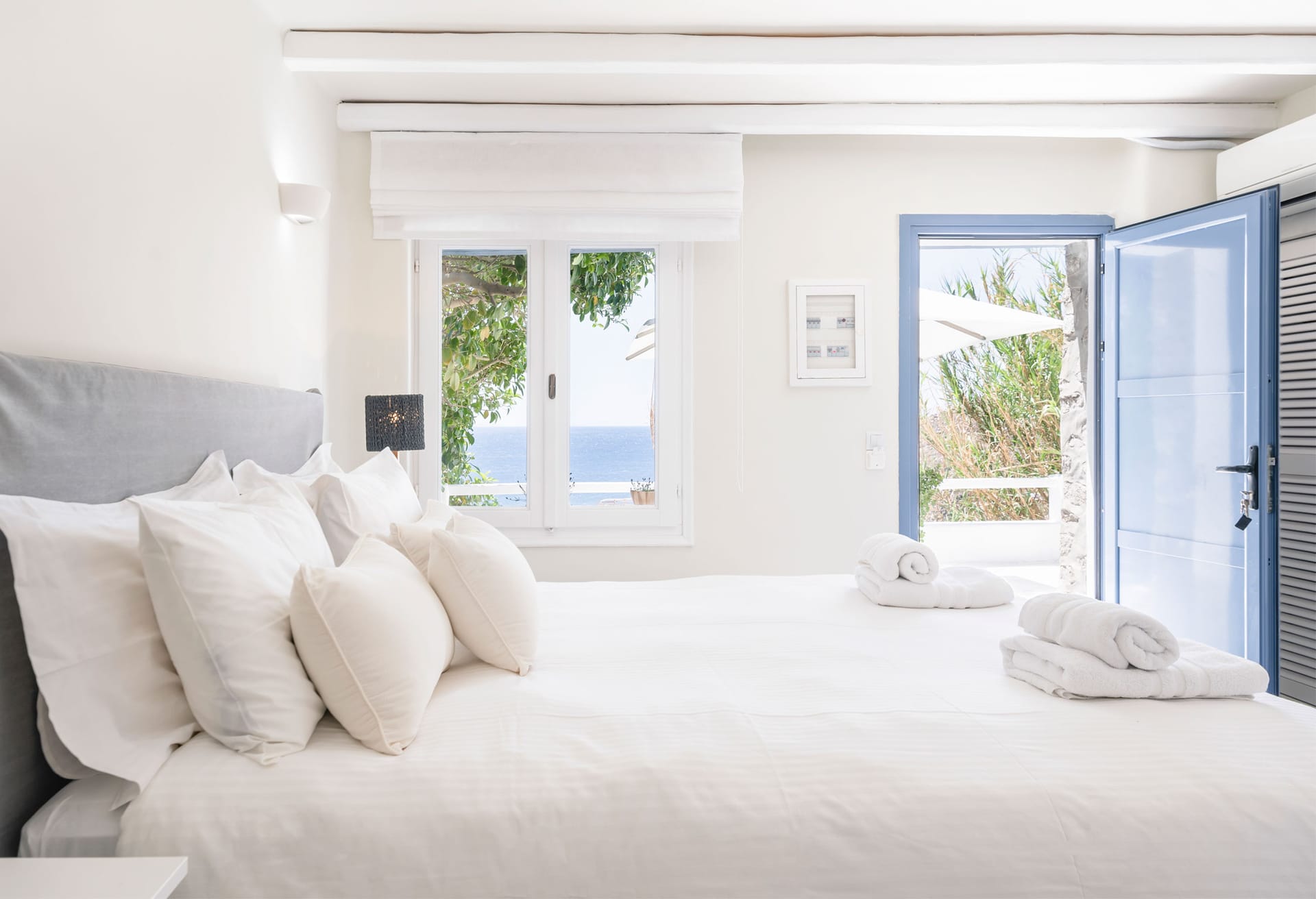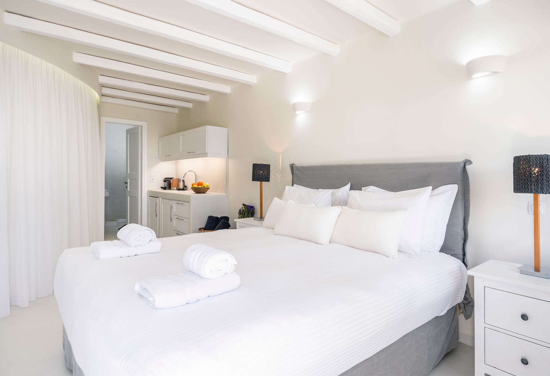 1 master bedroom 18 m2. with balcony facing the island of Delos, 1 queen size bed with. 1 hall. The room is equipped with safe box, sound system, TV, hairdryer, A/C, bathroom amenities and towels.