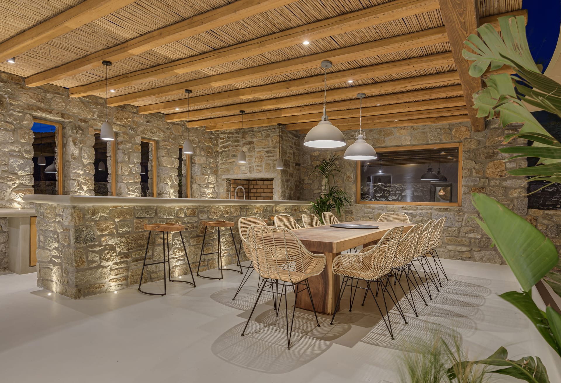 You can enjoy the magnificent view, sitting in the 10-person outdoor dining room, the stone bar with BBQ, the built-in seating areas, and the sofas on different levels.