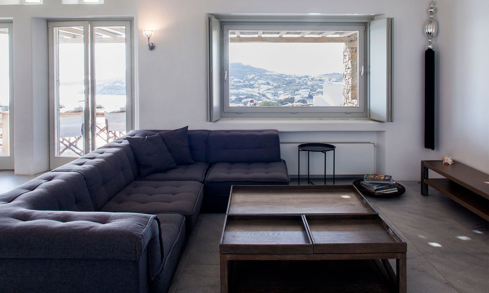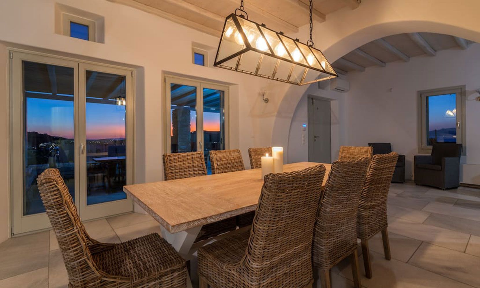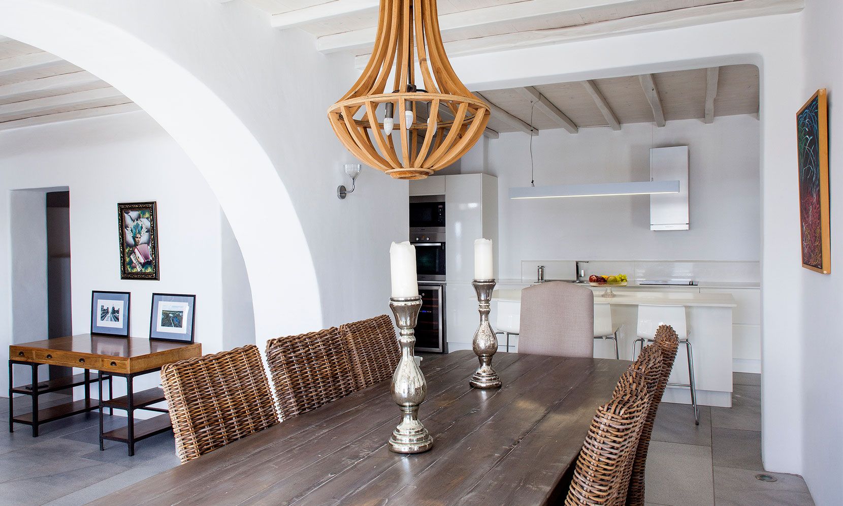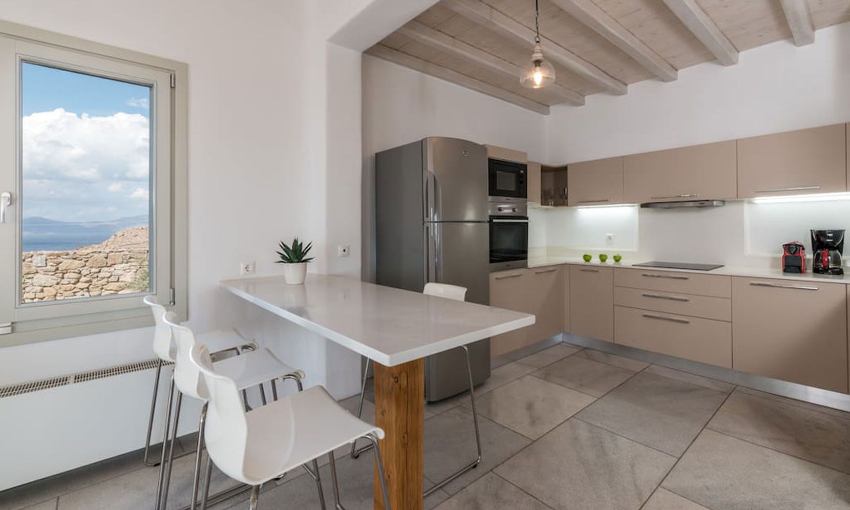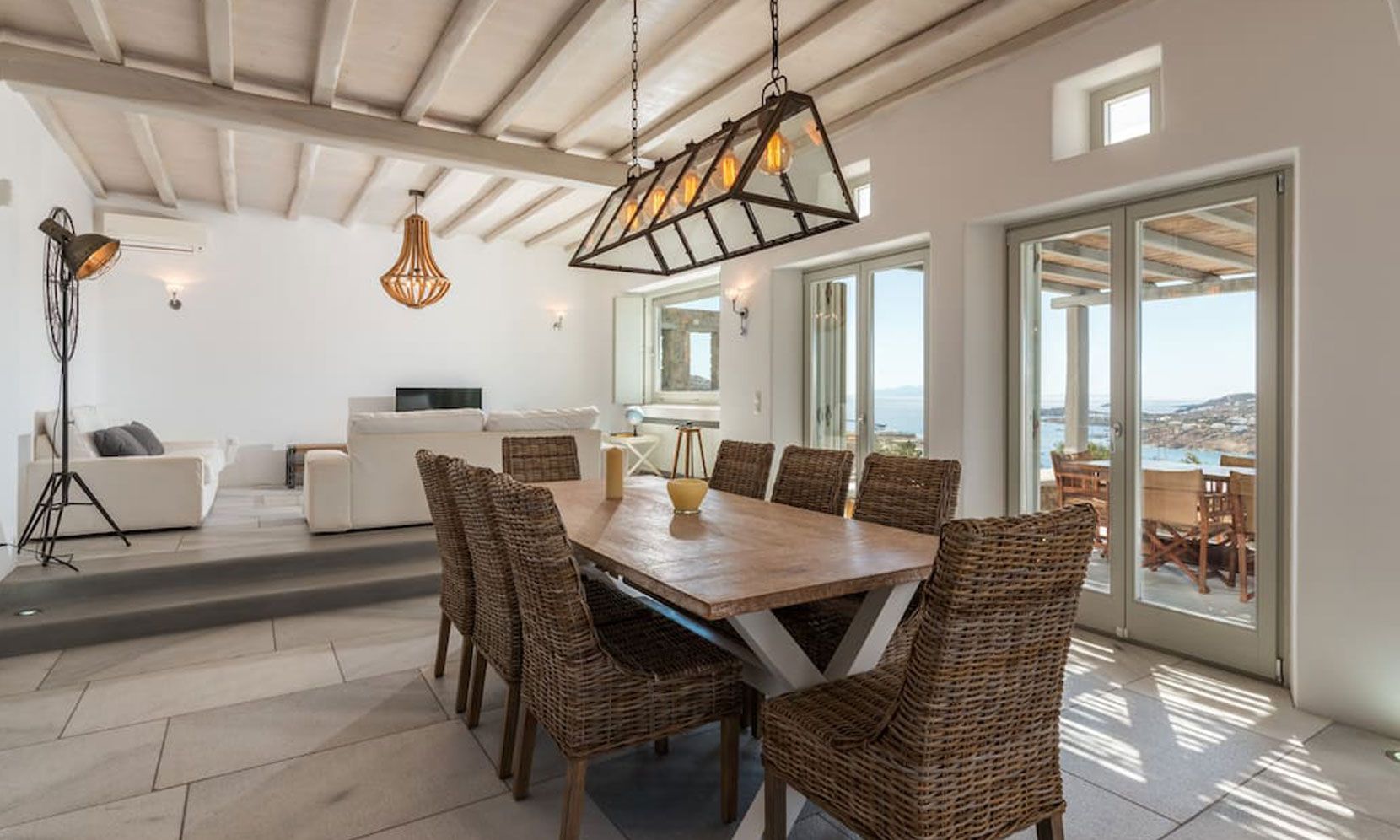 Indoor and outdoor luxury is foremost in this villa to delight in Mykonos style. The grand covered outdoor terraces commands a spectacular view which you can enjoy seated in the comfortable outdoor living areas. Inside, enjoy casual snacks or morning coffee at the breakfast table next to the modern kitchens. Fully equipped, the kitchens has everything you need to prepare a feast for your guests. The indoor dining areas and living rooms are open and spacious with windows and doors which open to the view.