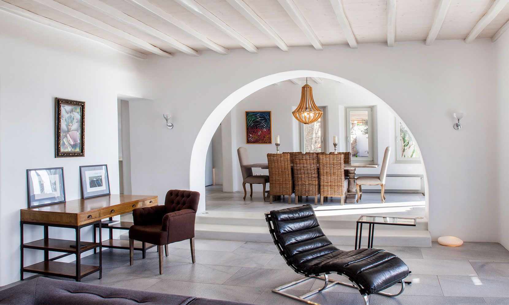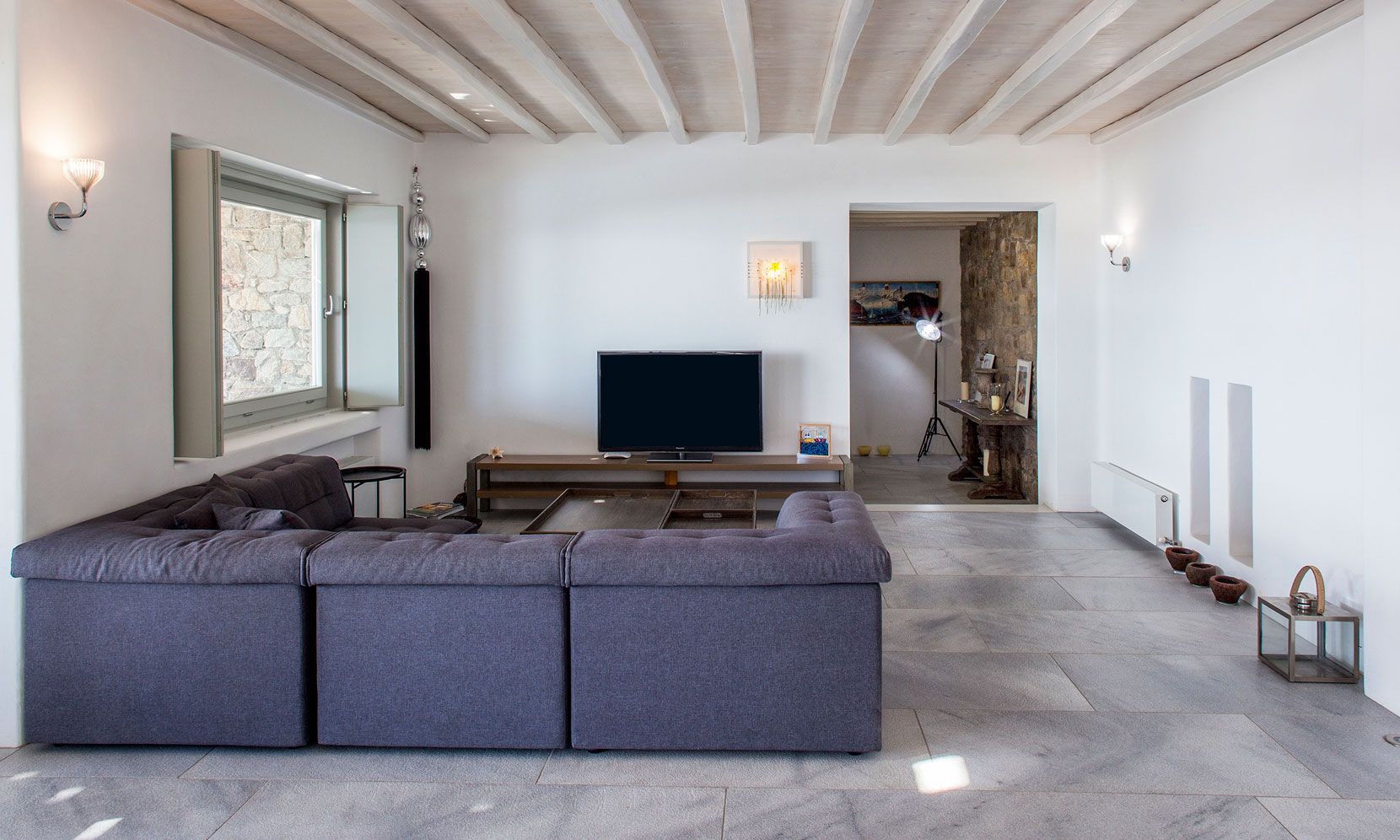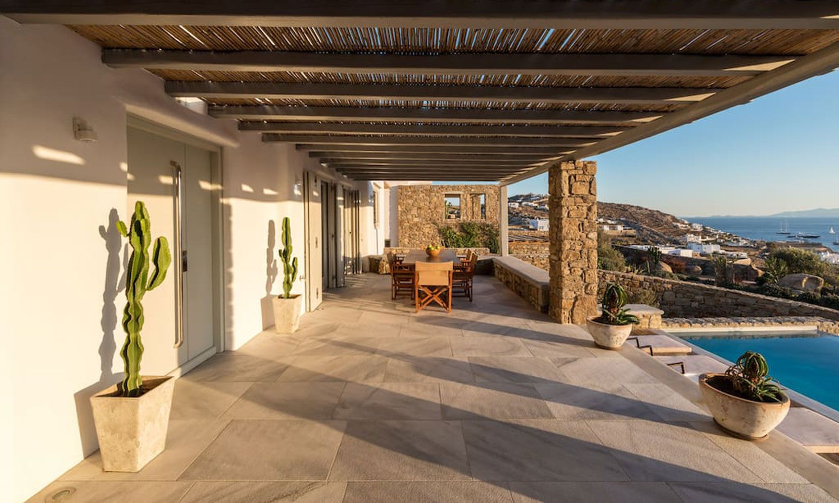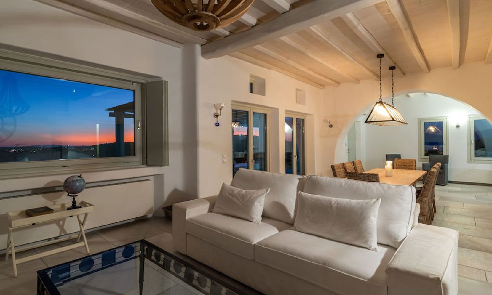 Indoor and outdoor luxury is foremost in this villa to delight in Mykonos style. The grand covered outdoor terraces commands a spectacular view which you can enjoy seated in the comfortable outdoor living areas. Inside, enjoy casual snacks or morning coffee at the breakfast table next to the modern kitchens. Fully equipped, the kitchens has everything you need to prepare a feast for your guests. The indoor dining areas and living rooms are open and spacious with windows and doors which open to the view.