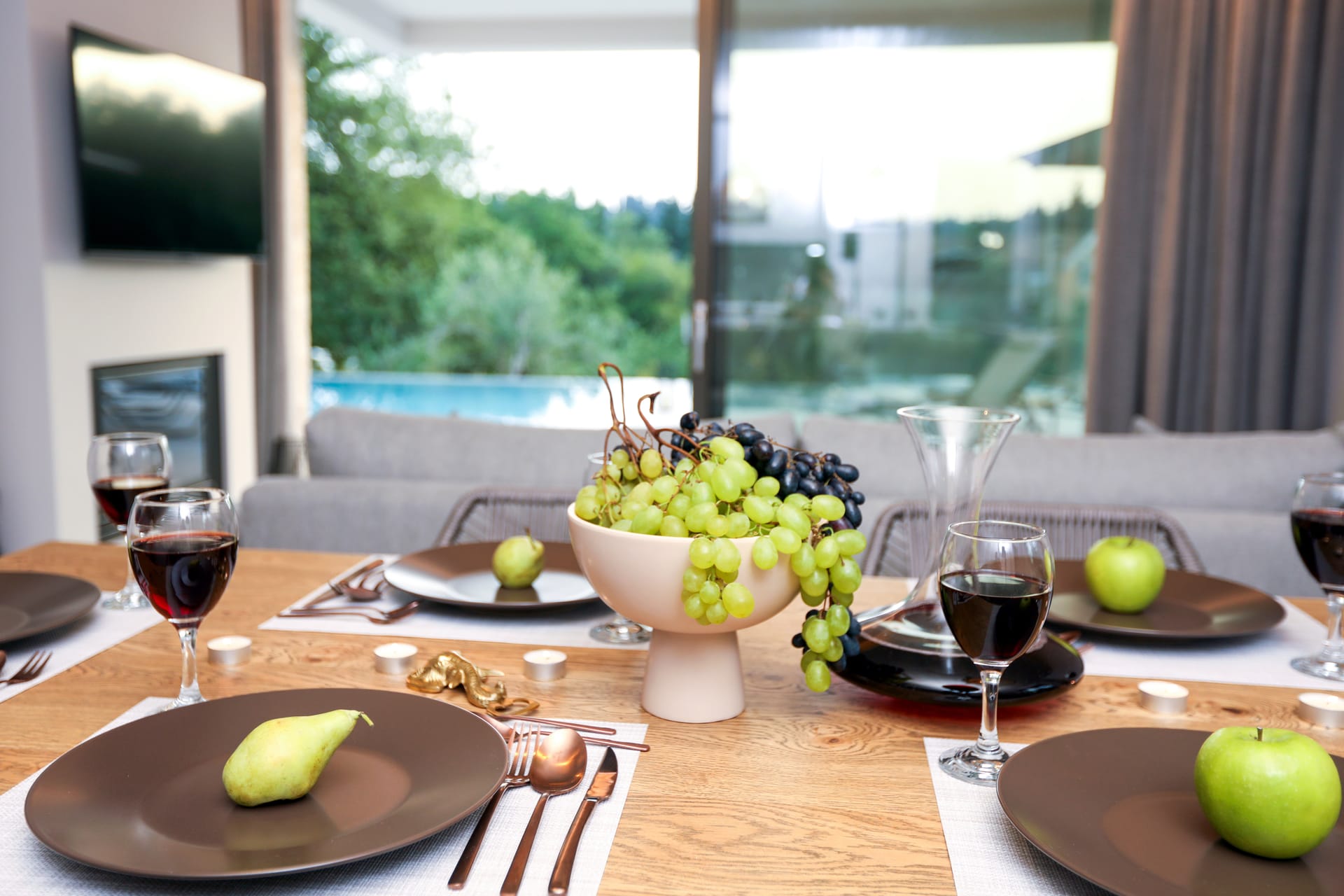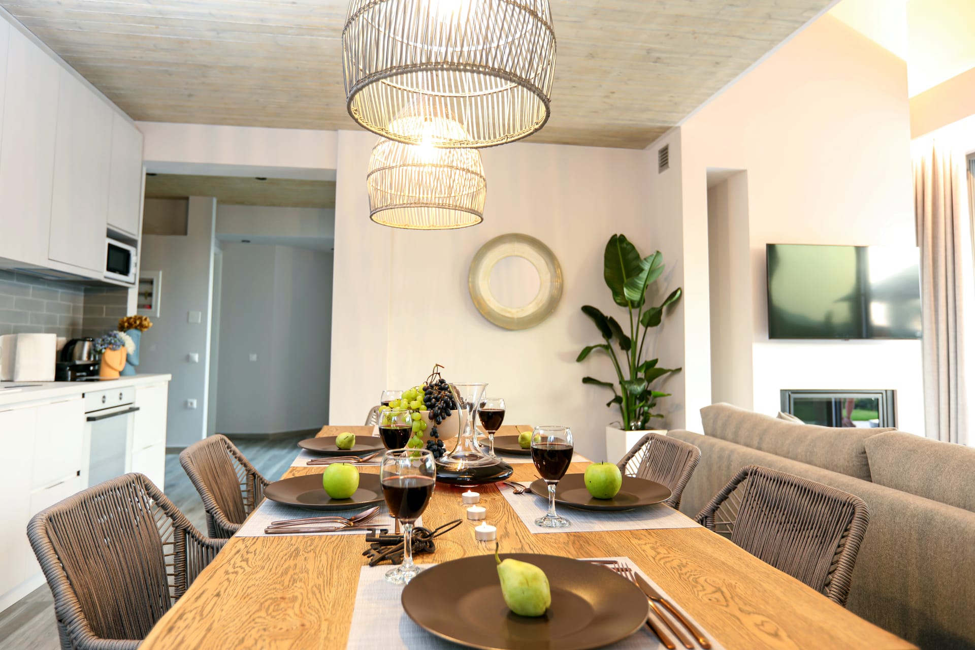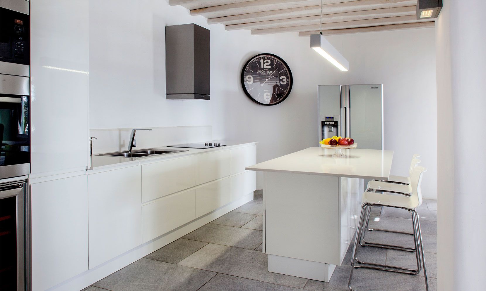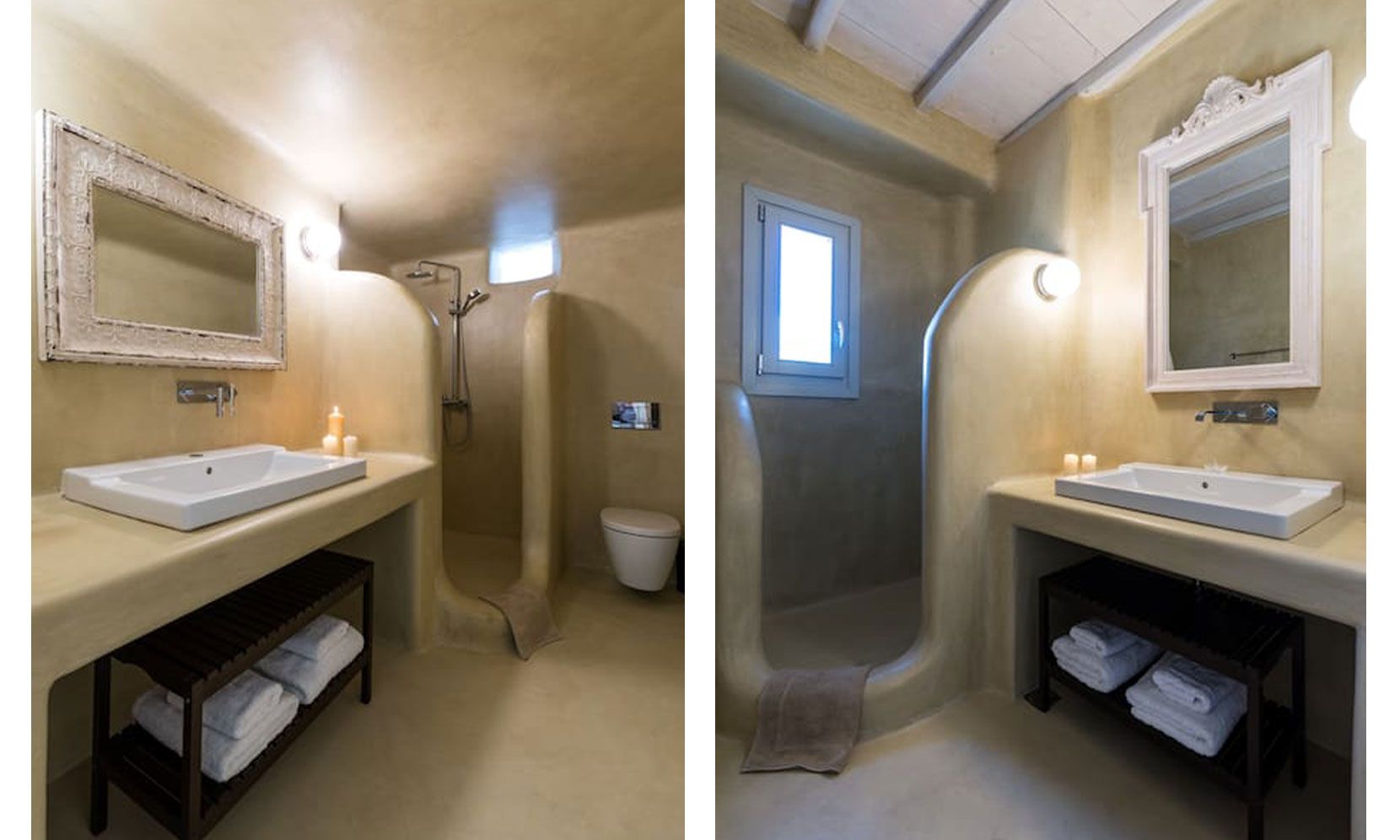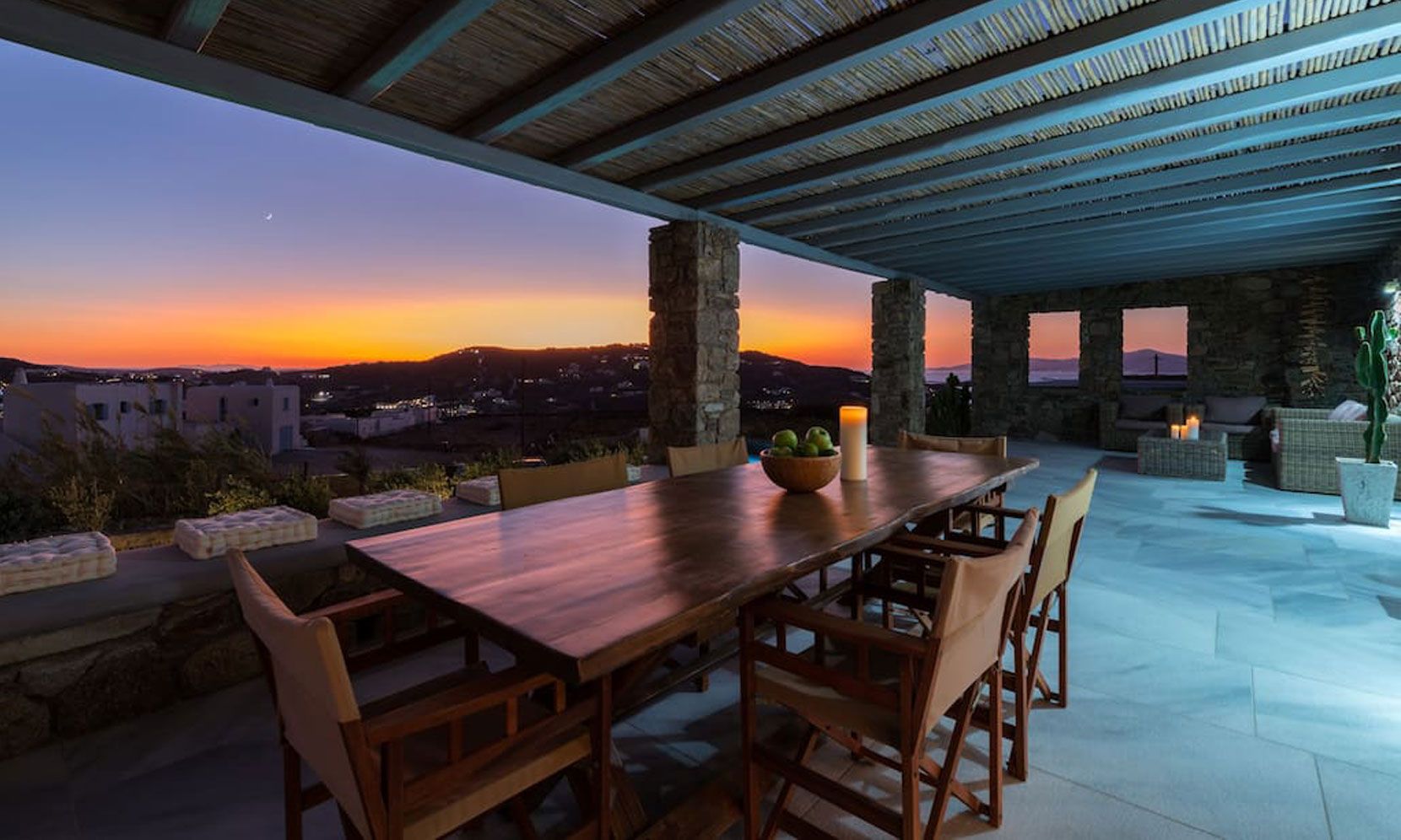 Indoor and outdoor luxury is foremost in this villa to delight in Mykonos style. The grand covered outdoor terraces commands a spectacular view which you can enjoy seated in the comfortable outdoor living areas. Inside, enjoy casual snacks or morning coffee at the breakfast table next to the modern kitchens. Fully equipped, the kitchens has everything you need to prepare a feast for your guests. The indoor dining areas and living rooms are open and spacious with windows and doors which open to the view.