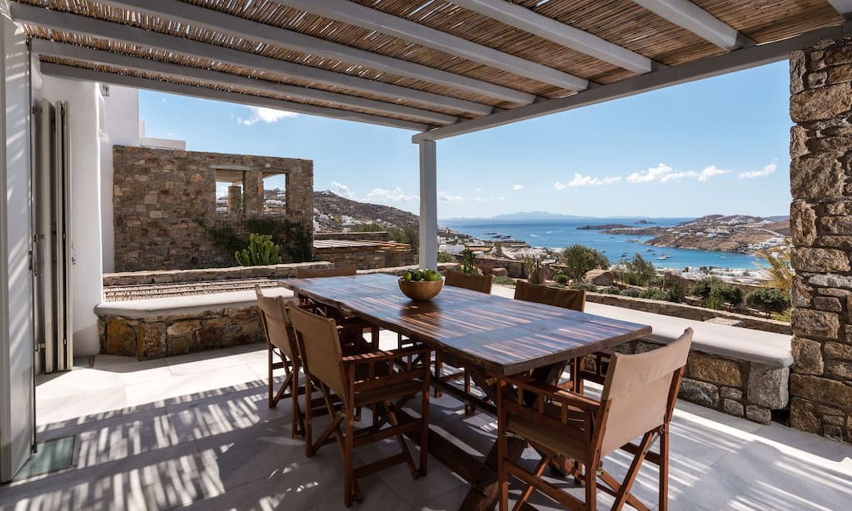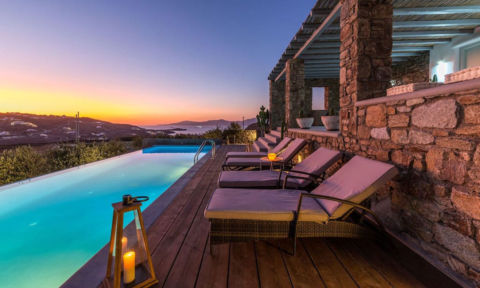 Perched on the hilltop Villa Melanie Retreat commands sweeping views of Mykonos and the blue Aegean.