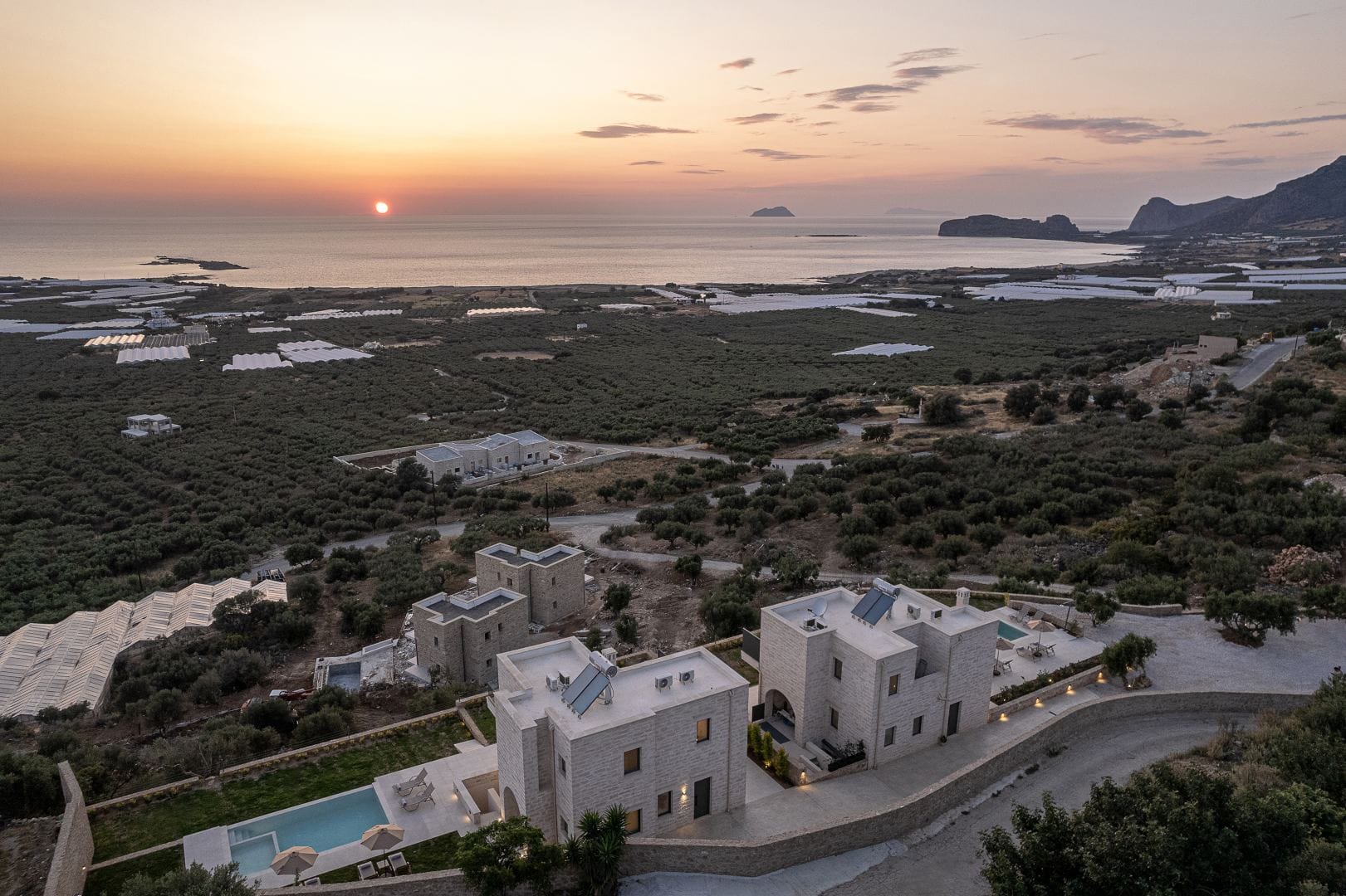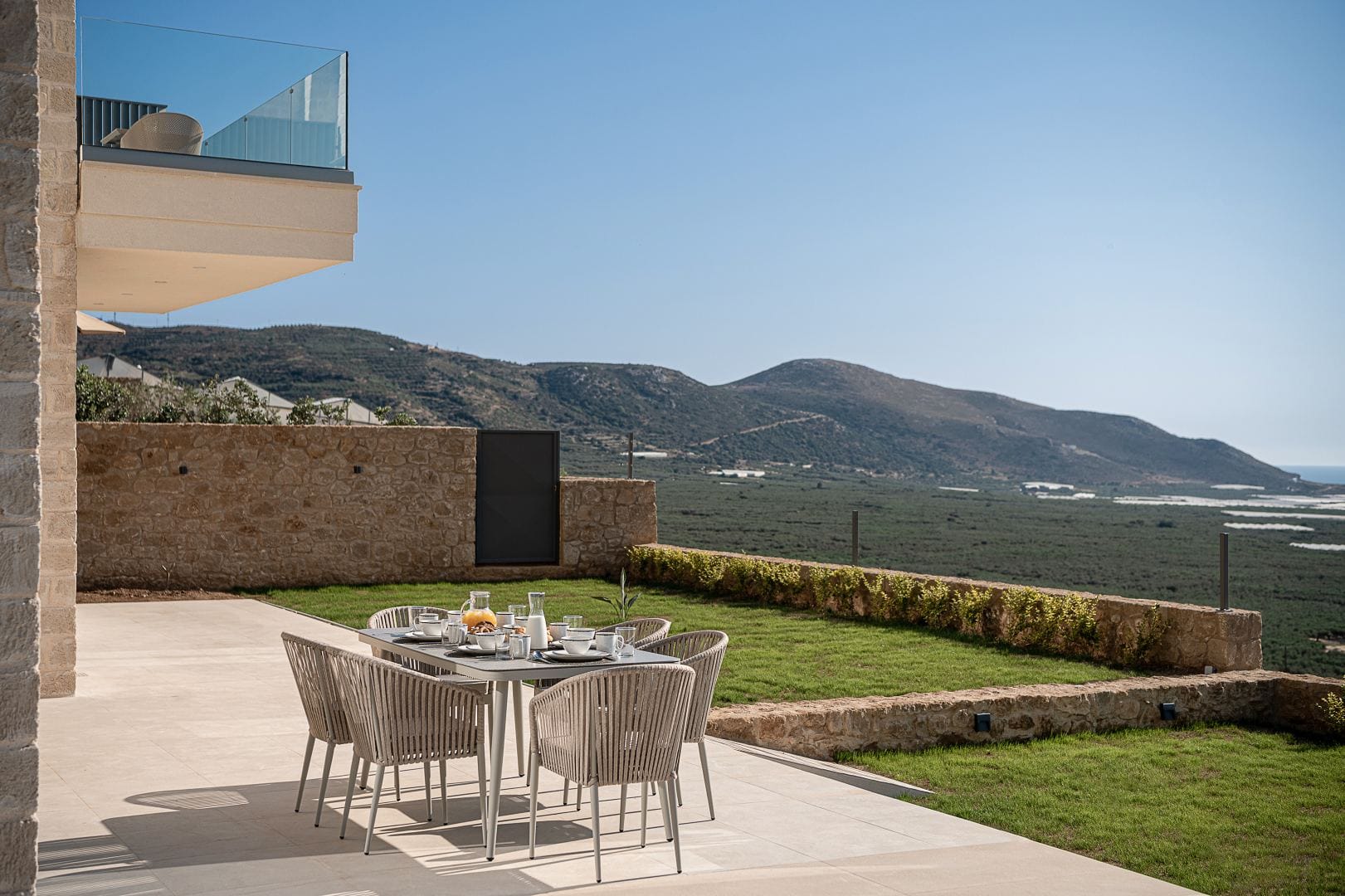 Latters are surrounded by spacious sun decks setting which includes large outdoor and pergola shaded lounge areas equipped with comfortable sofas with cushions sun beds deck chairs paired with a large dining table which predisposes guests to enjoy a delicious meal or cocktail while watching the majestic sunrise, listening to the sounds of the sea and overlooking The Aegean sea . The excellent landscaped garden is filled with a selection of flowers calming the senses and creating a romantic atmosphere of relaxation and wellness.