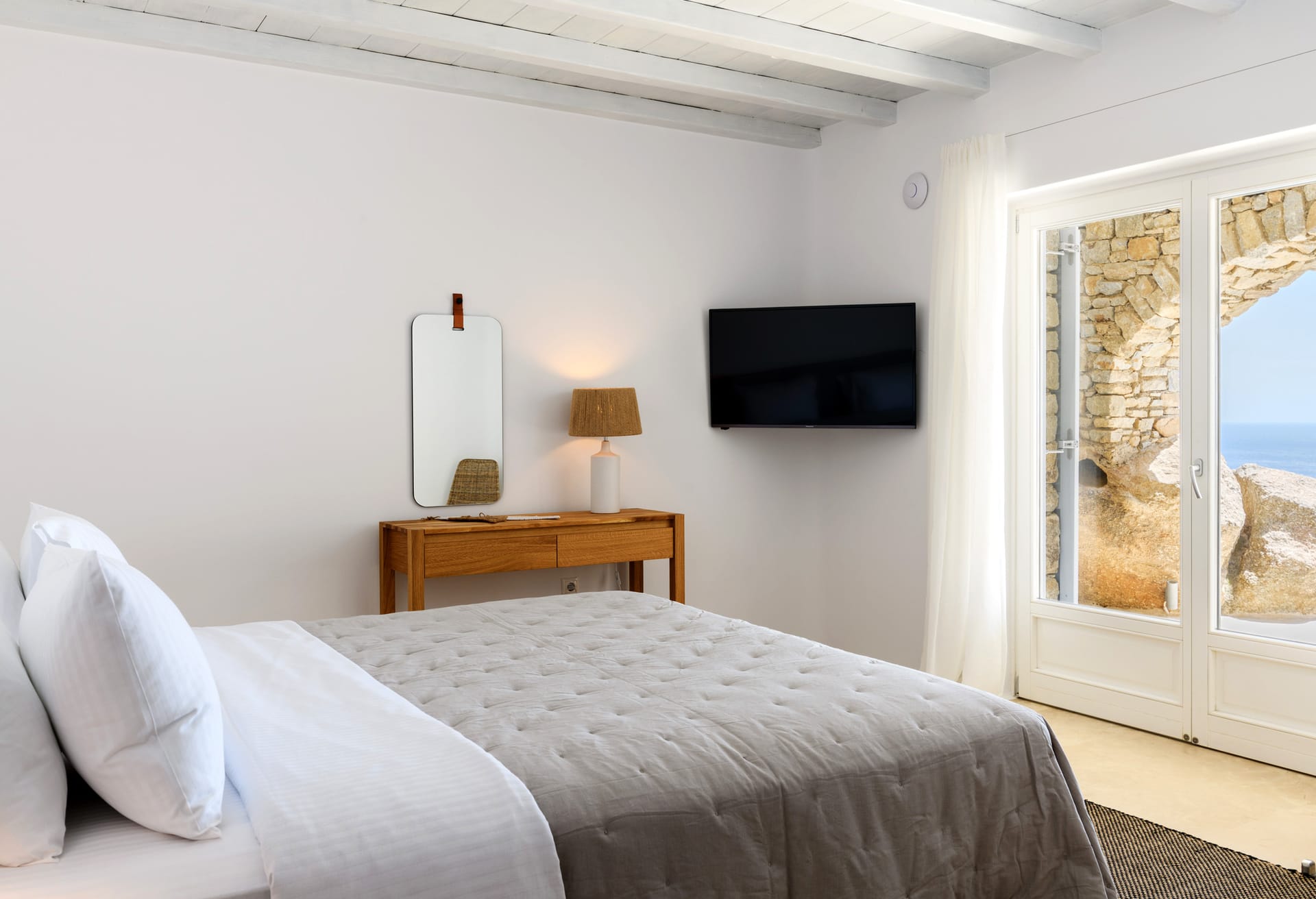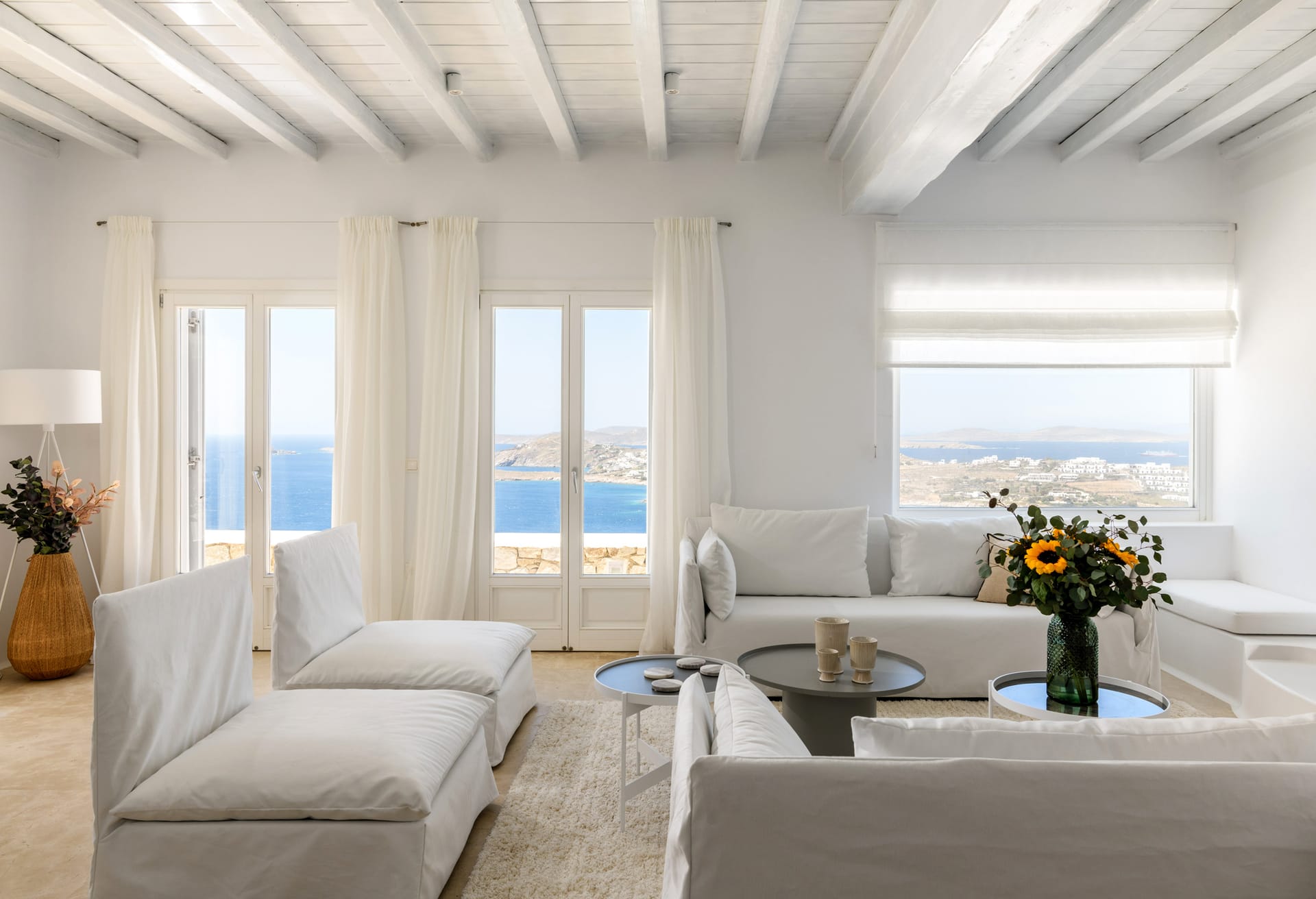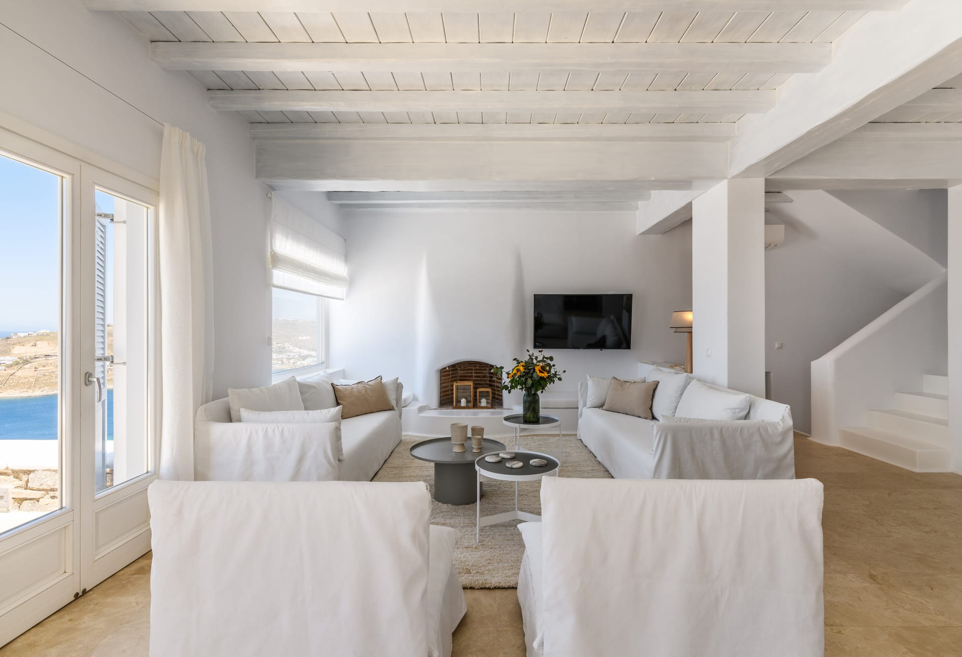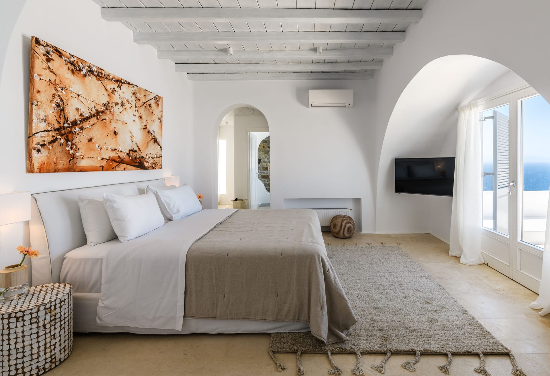 Mykonos Villa Mikaela combines state-of-the-art amenities and traditional minimal architecture with spacious living areas and terraces. The white-washed interiors, decorated to the highest of standards, combine contemporary design with art and luxury and offer plenty of cozy corners that create a relaxing ambiance.