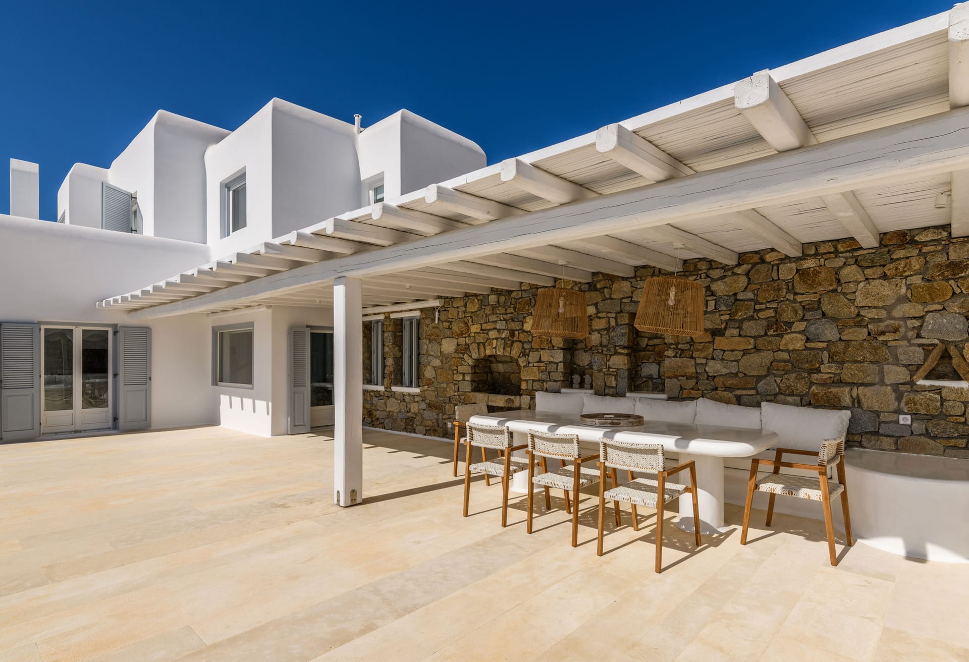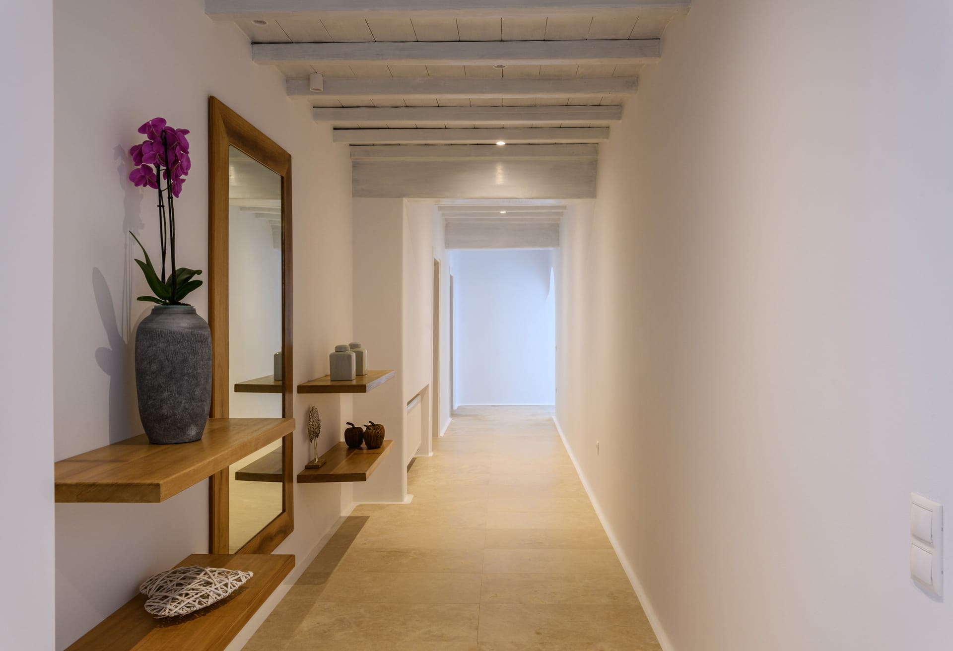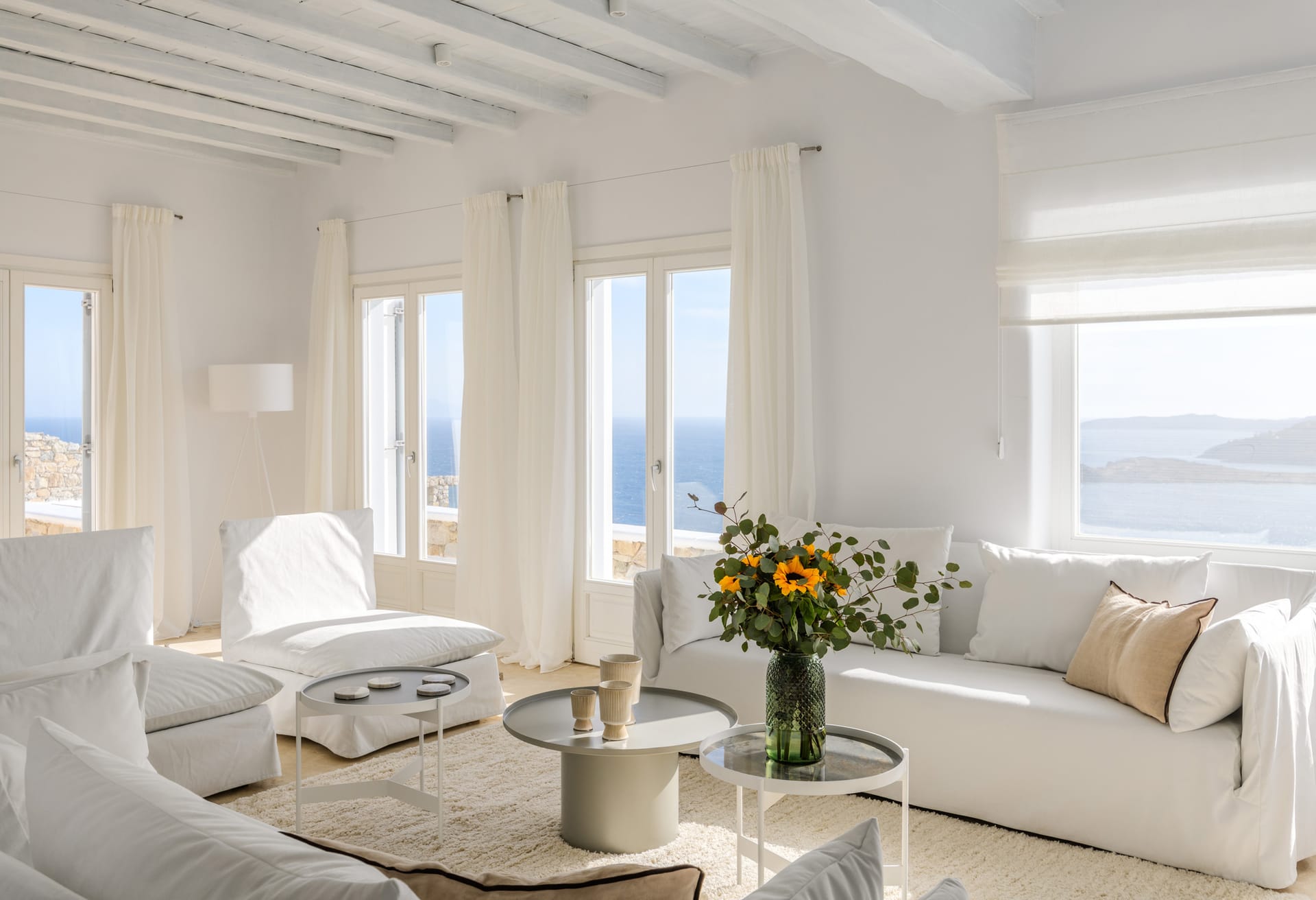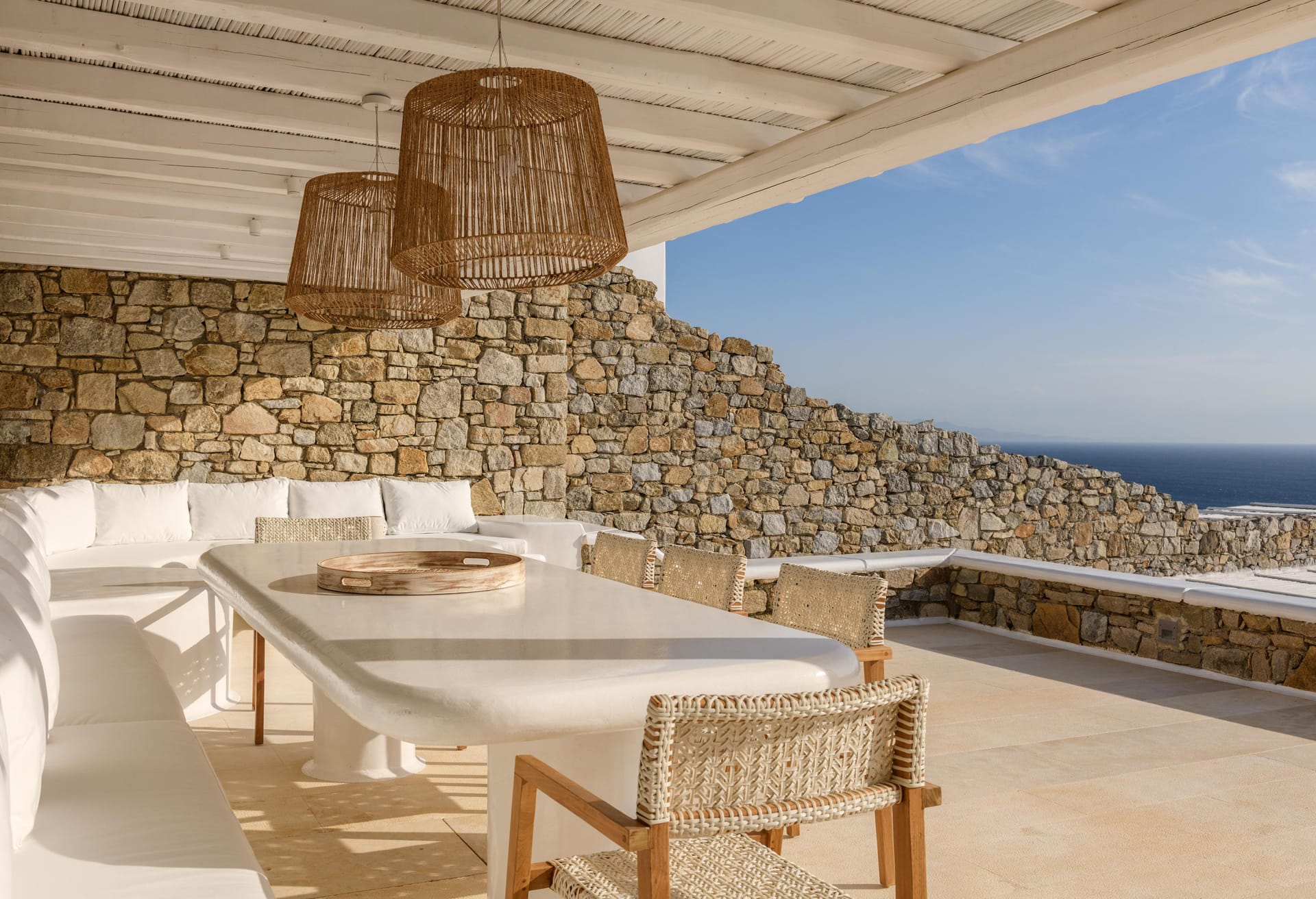 Mykonos Villa Mikaela combines state-of-the-art amenities and traditional minimal architecture with spacious living areas and terraces. The white-washed interiors, decorated to the highest of standards, combine contemporary design with art and luxury and offer plenty of cozy corners that create a relaxing ambiance.