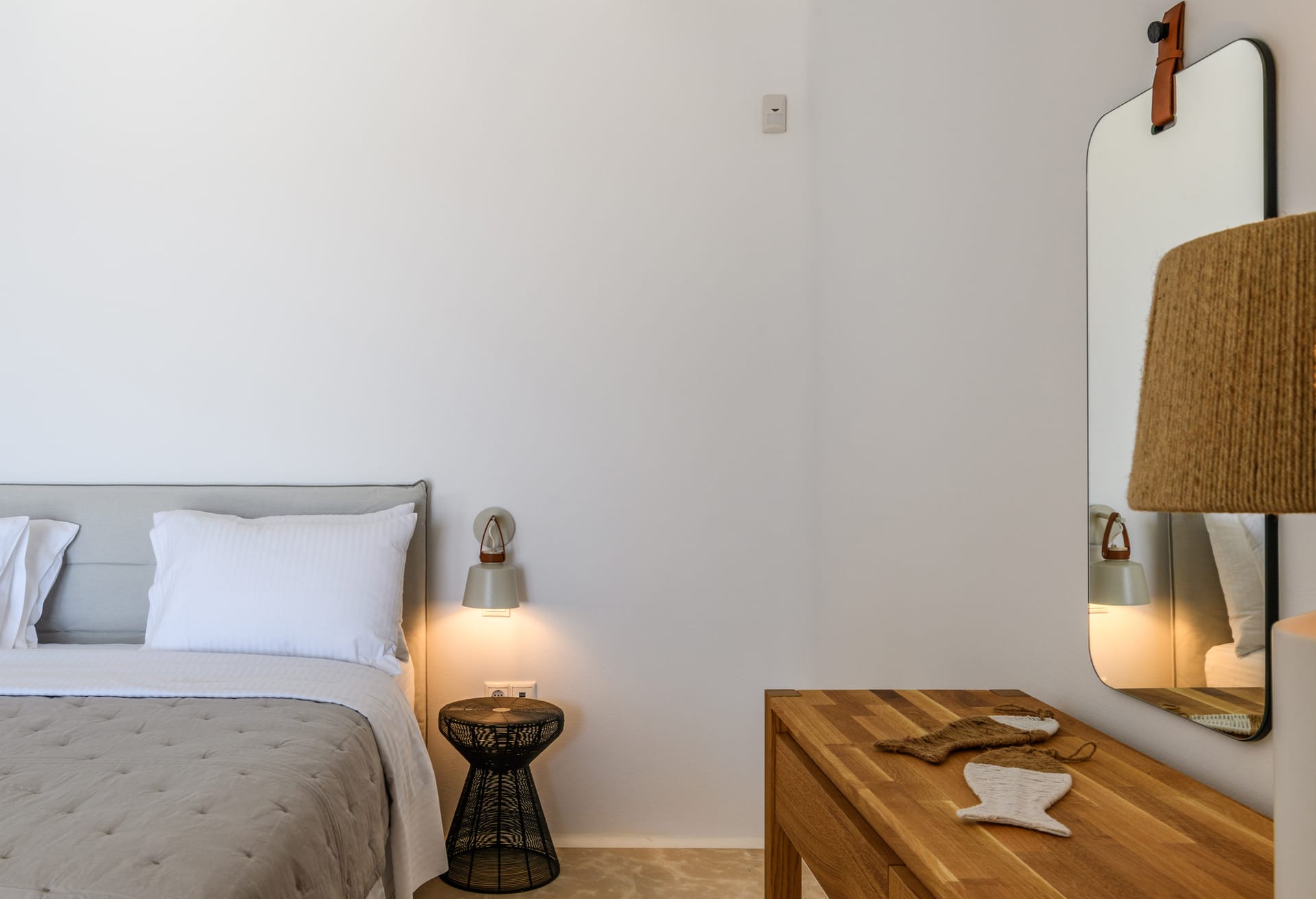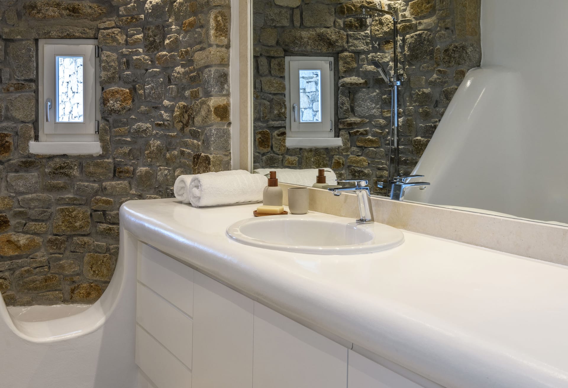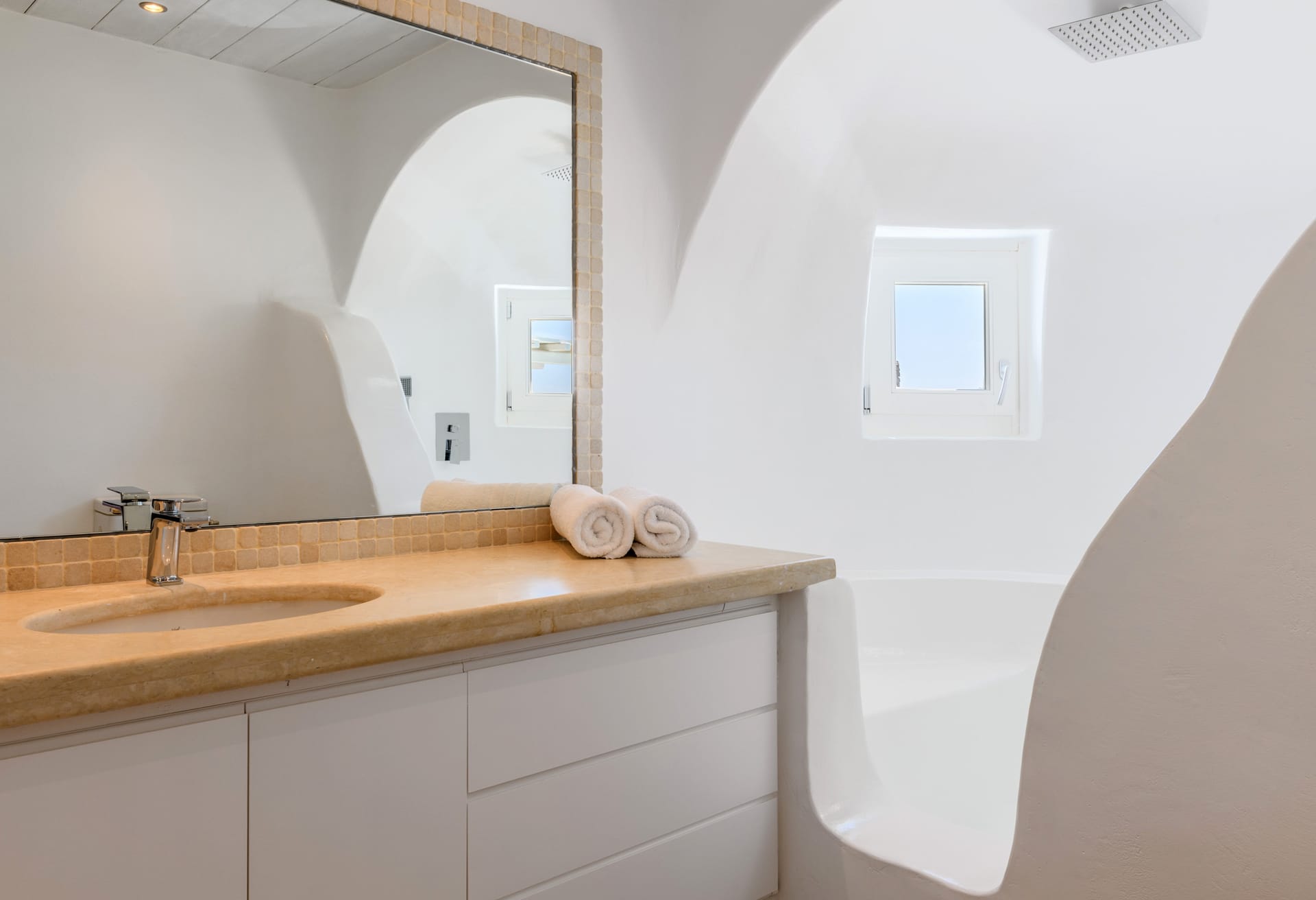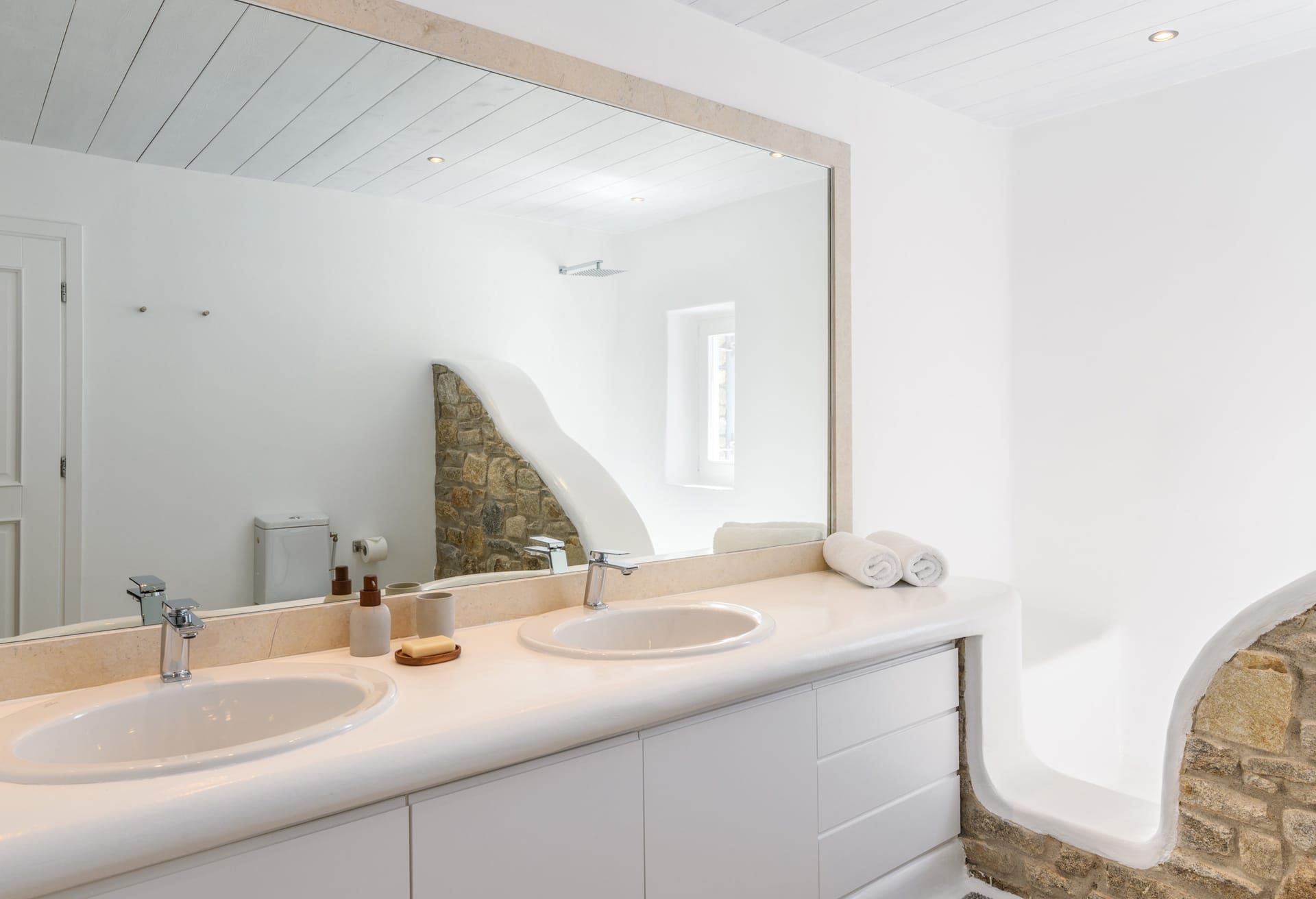 Mykonos Villa Mikaela combines state-of-the-art amenities and traditional minimal architecture with spacious living areas and terraces. The white-washed interiors, decorated to the highest of standards, combine contemporary design with art and luxury and offer plenty of cozy corners that create a relaxing ambiance.