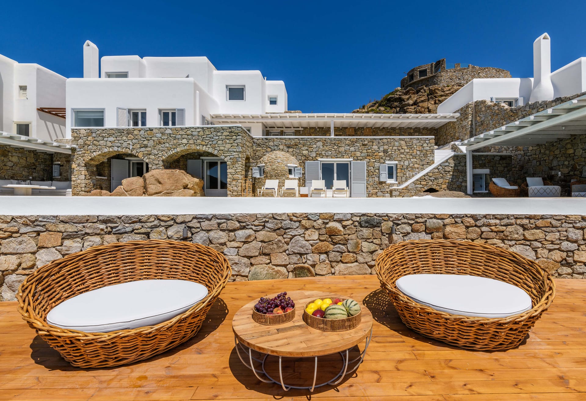 This superbly constructed is located in a unique spot of Mykonos, only 3 kilometres from the town centre and approximately 1 kilometre from the famous beach of Psarou (Nammos).