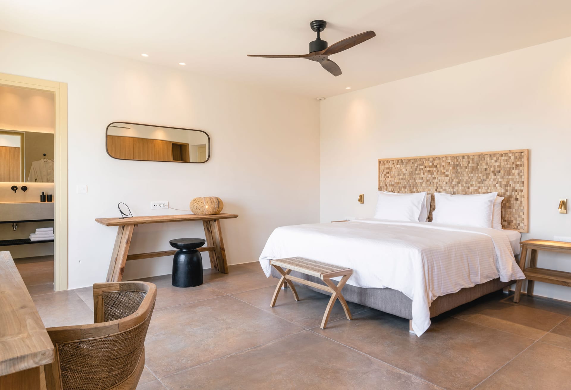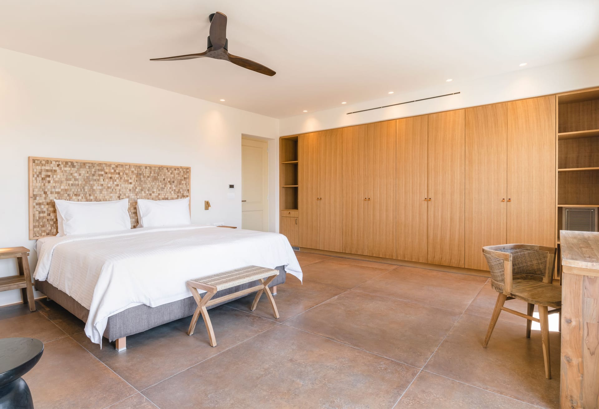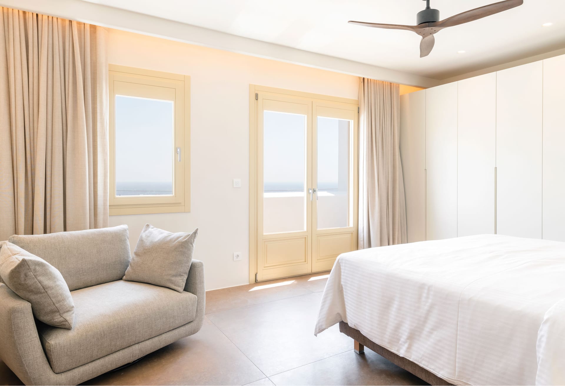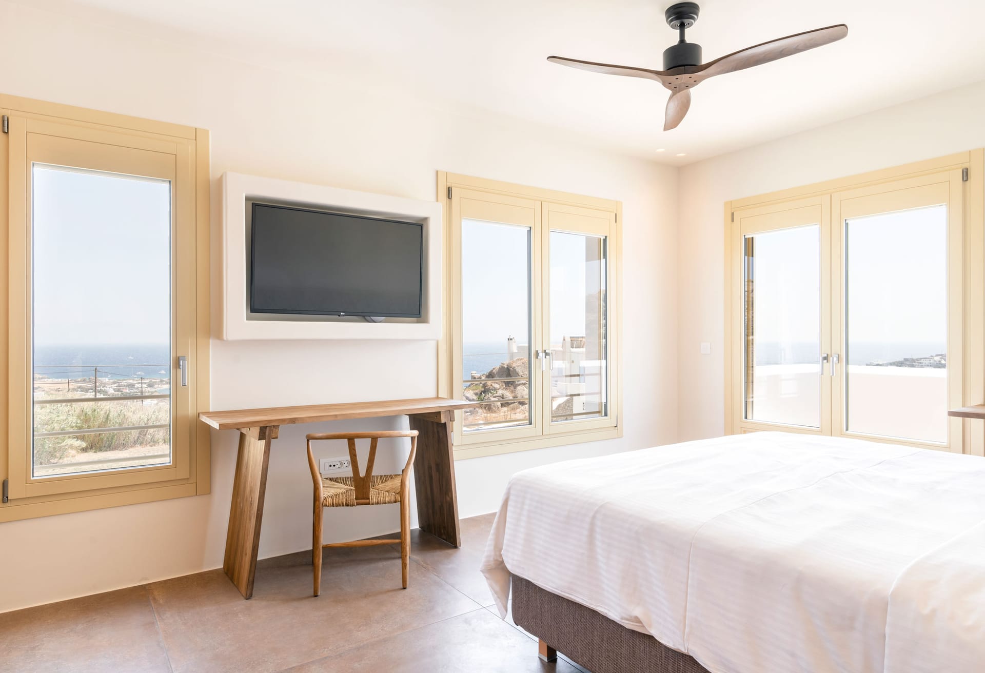 Luxury touch. Entrance floor Open plan fully equipped kitchen with Smeg appliances, spacious living room with TV, ceiling fans, an amazing pool and sea view, an indoor dining area [8 seats] -direct access to the pool and outdoor dining area, guest bathroom with shower Suite 1: master bedroom with queen-size bed, TV, small fridge, safebox, ceiling fans, en-suite bathroom with shower, direct access to terrace and pool area via balcony doors | sea view room