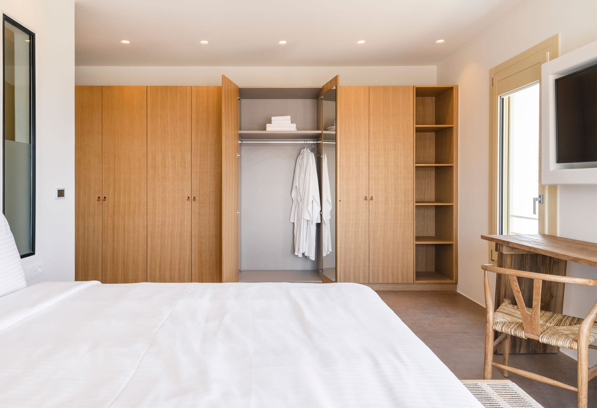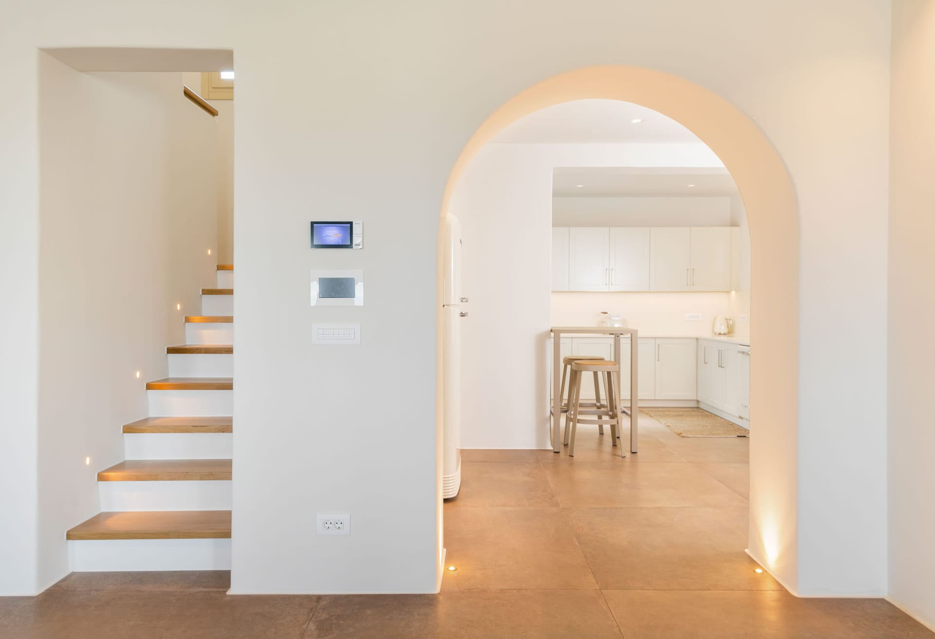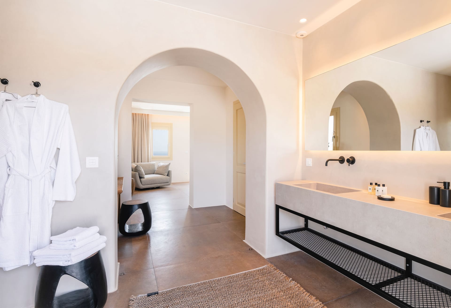 Luxury touch. Entrance floor Open plan fully equipped kitchen with Smeg appliances, spacious living room with TV, ceiling fans, an amazing pool and sea view, an indoor dining area [8 seats] -direct access to the pool and outdoor dining area, guest bathroom with shower Suite 1: master bedroom with queen-size bed, TV, small fridge, safebox, ceiling fans, en-suite bathroom with shower, direct access to terrace and pool area via balcony doors | sea view room