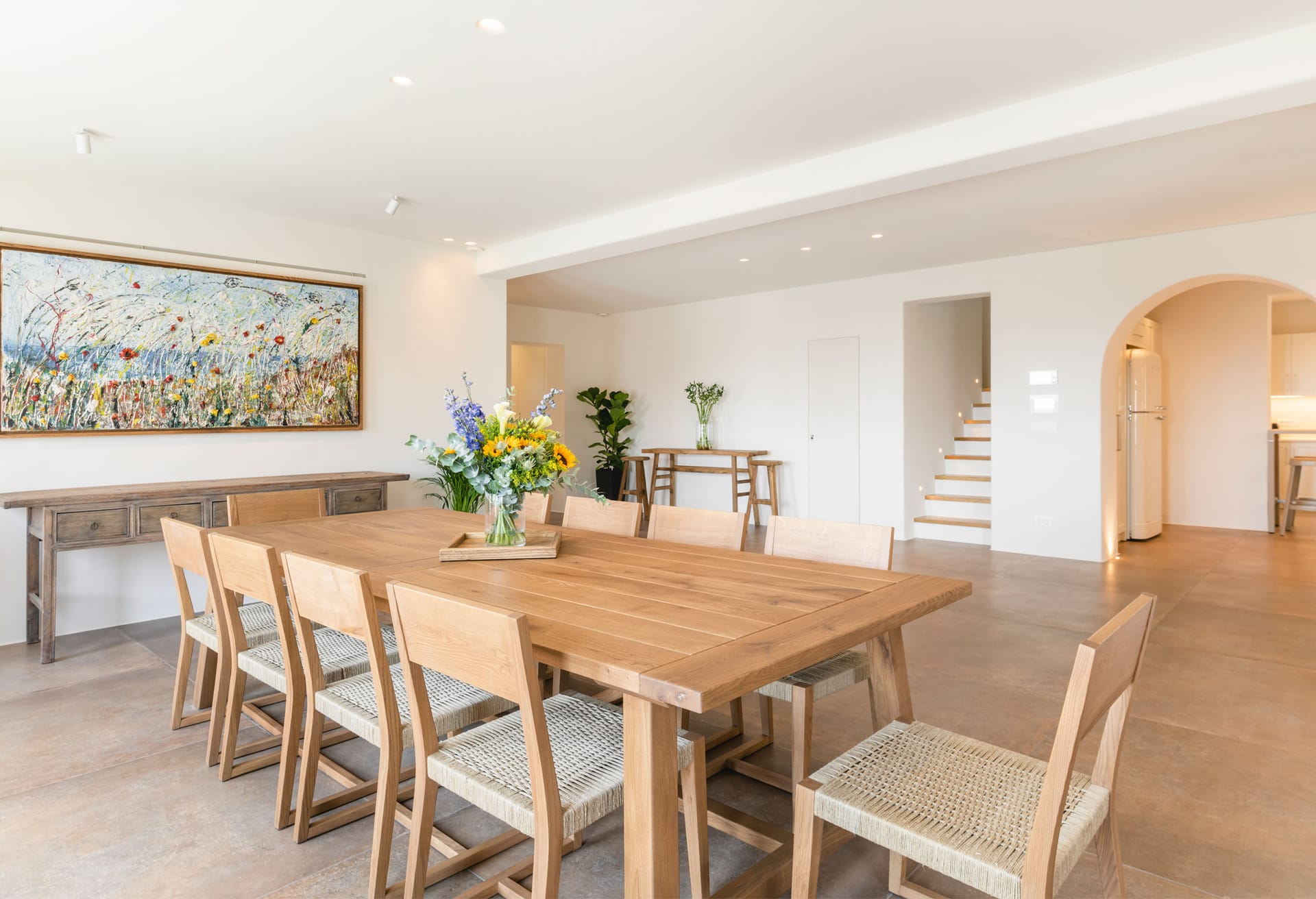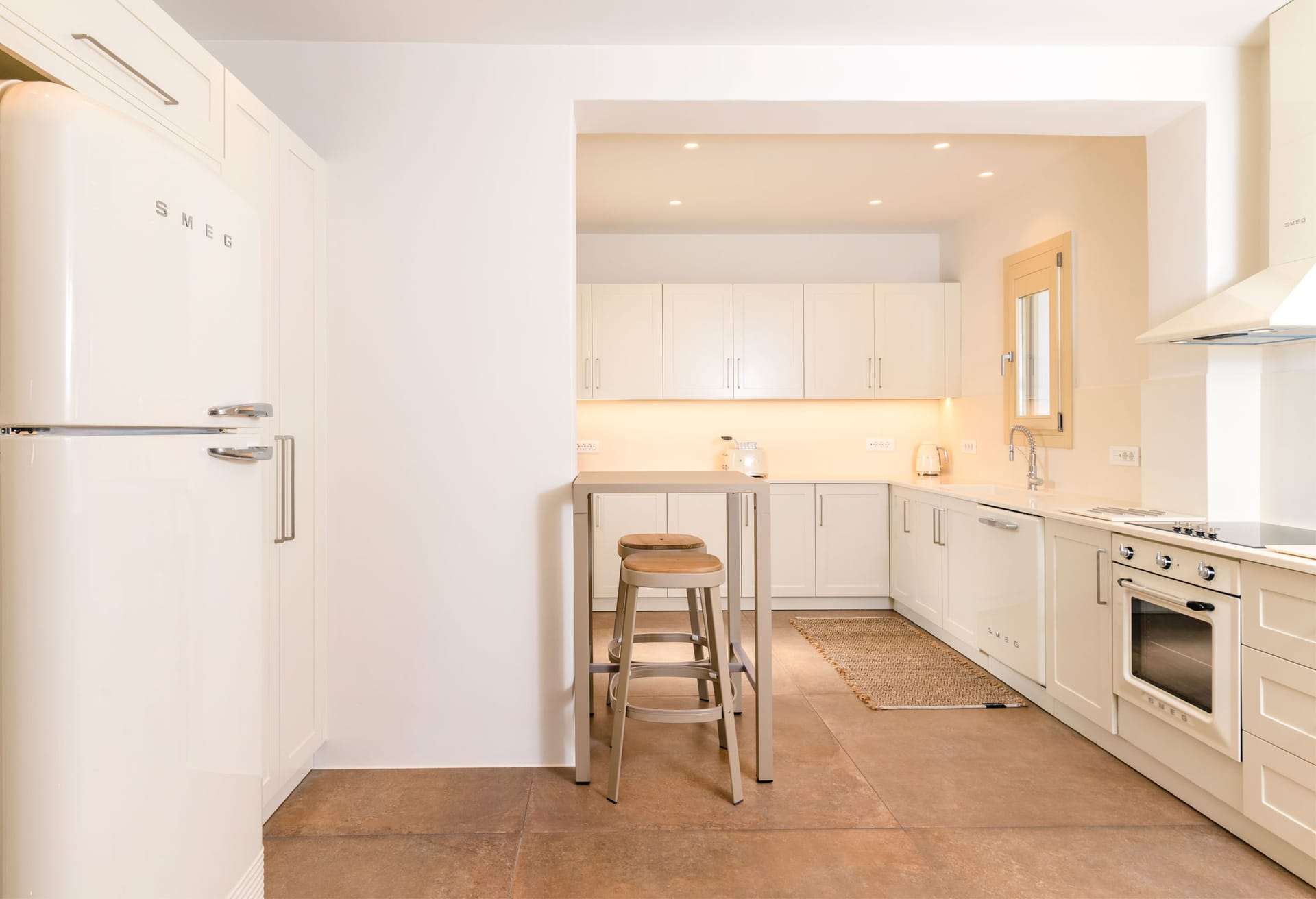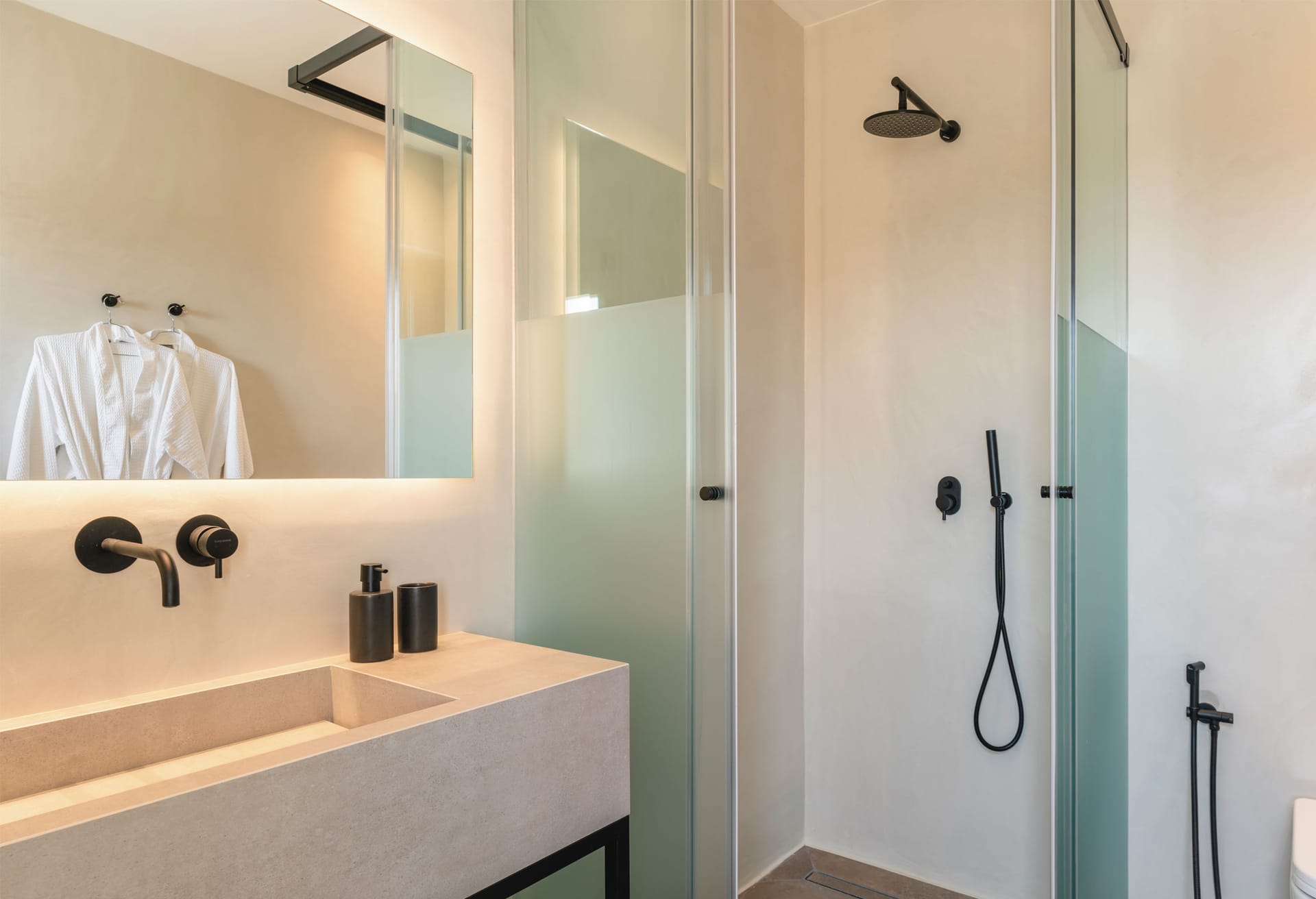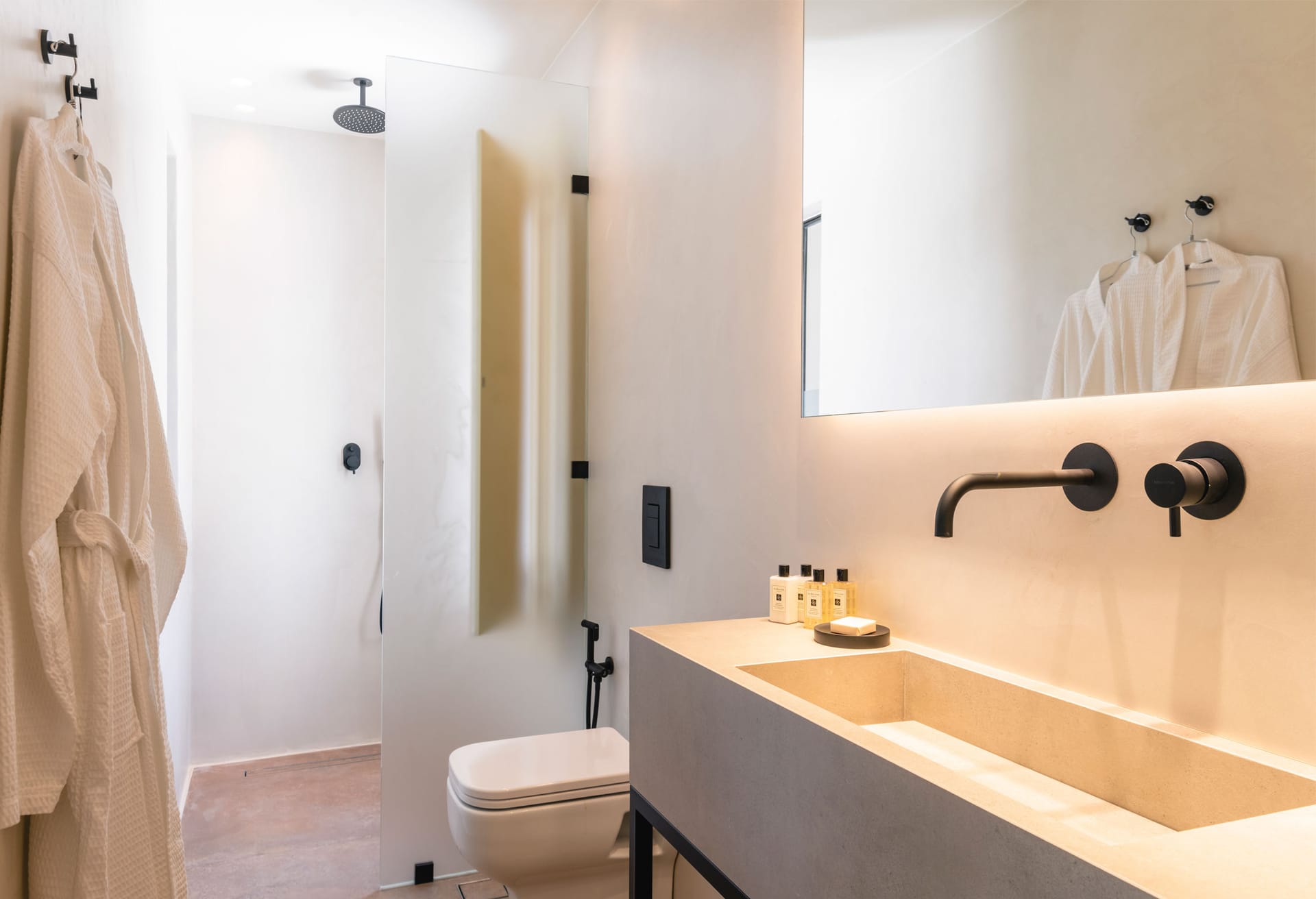 Luxury touch. Entrance floor Open plan fully equipped kitchen with Smeg appliances, spacious living room with TV, ceiling fans, an amazing pool and sea view, an indoor dining area [8 seats] -direct access to the pool and outdoor dining area, guest bathroom with shower Suite 1: master bedroom with queen-size bed, TV, small fridge, safebox, ceiling fans, en-suite bathroom with shower, direct access to terrace and pool area via balcony doors | sea view room
