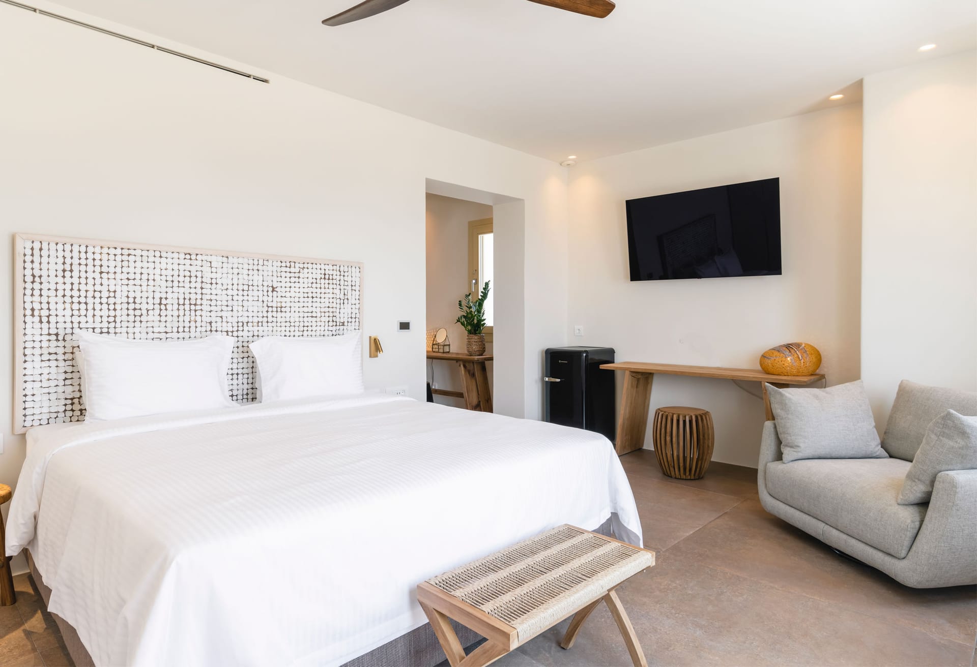 Suite 2: master bedroom with queen-size bed, TV, small fridge, safebox, ceiling fans, lounge area, open plan en-suite bathroom with double sink and raining shower, access to a small balcony via balcony doors | sea view room