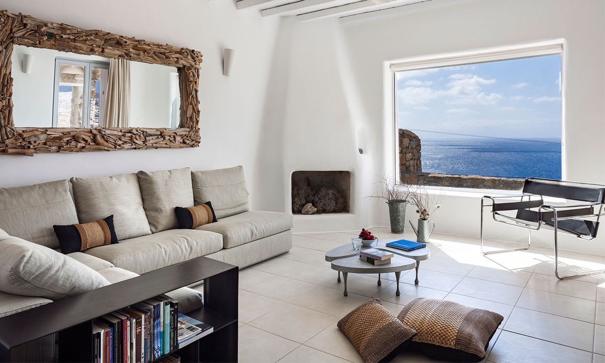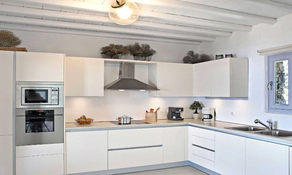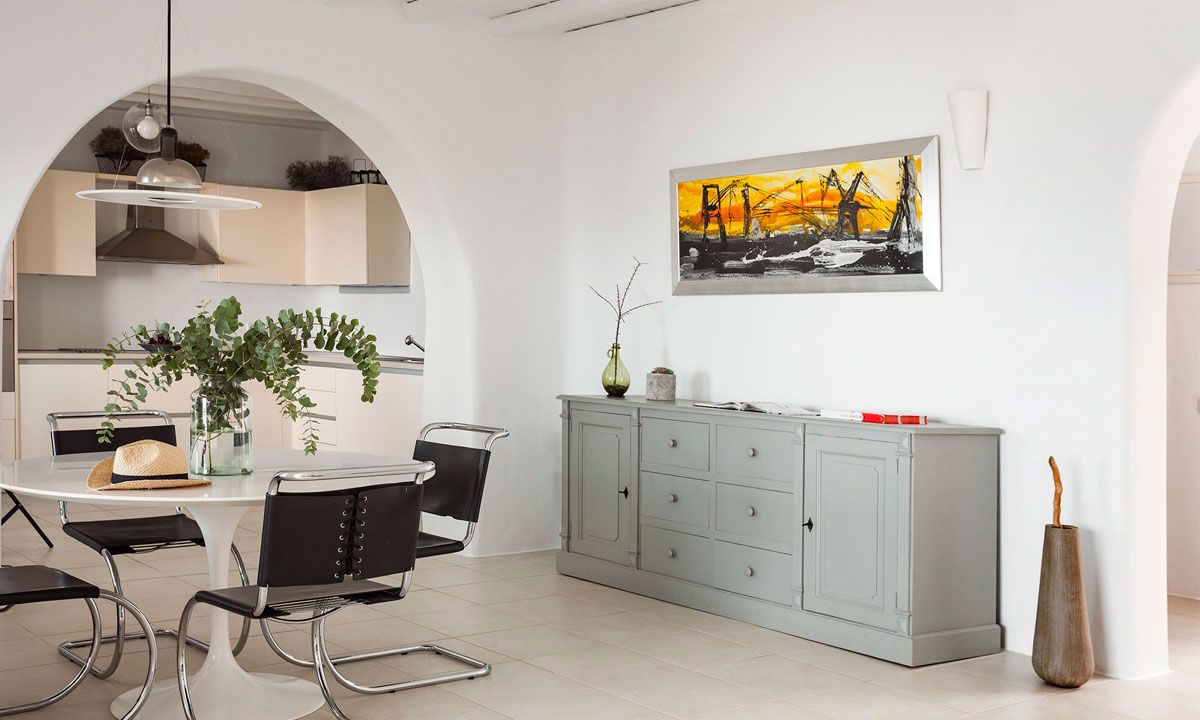 The villa has a spacious open lobby with a stylish yet comfortable living room, including a fire- place, and an elegant dining area. The Myconian style kitchen is fully equipped with state-of-the- art appliances.