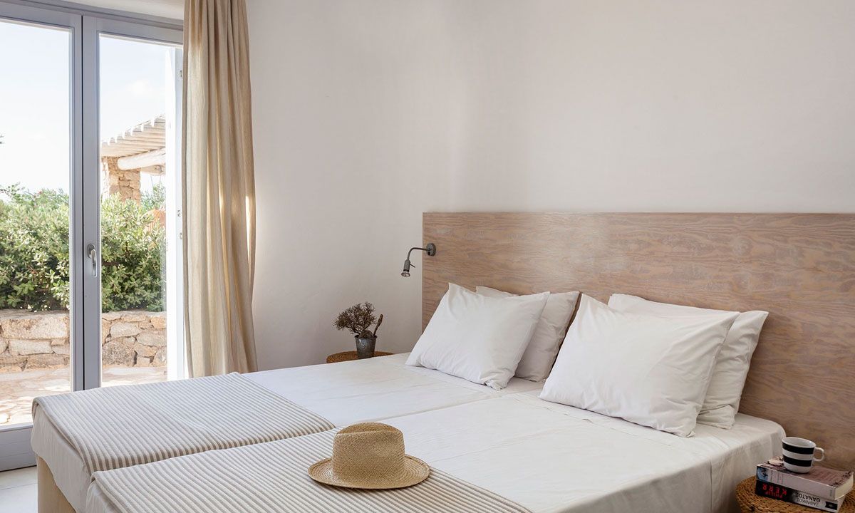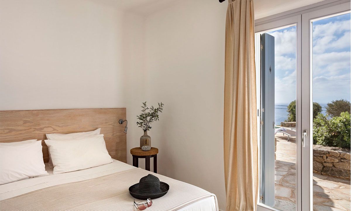 This serene and dreamy Villa Narkissos is set in the quiet and classy area above Lia beach at the south- east coast of Mykonos. The villa, designed and built in authentic Cycladic architecture (minimal aesthetic, cube-shaped, flat-roofed, whitewashed walls) offers a sense of escapism. The house is south facing in a wind sheltered location, allowing stunning views of the Tsagari, Lia and Kalafati beaches. It also offers outstanding views over the islands of Paros, Naxos and the vast Aegean Sea.