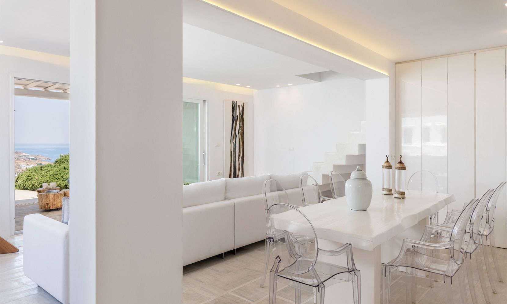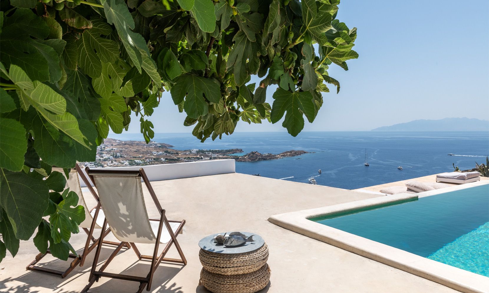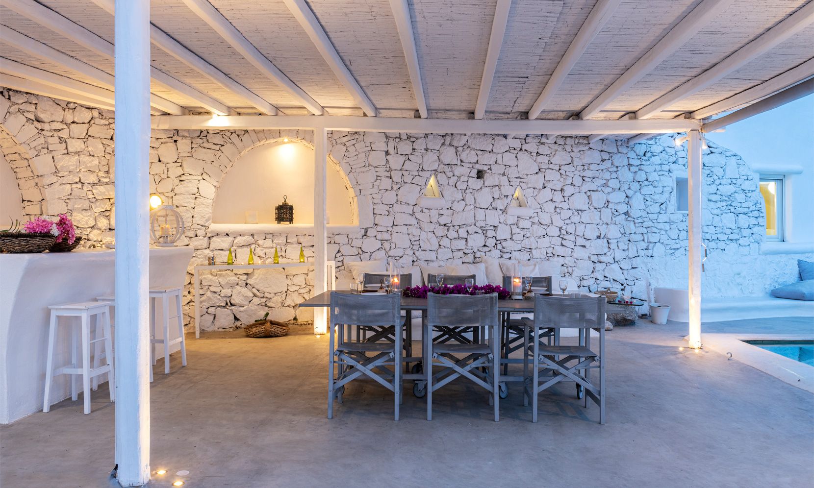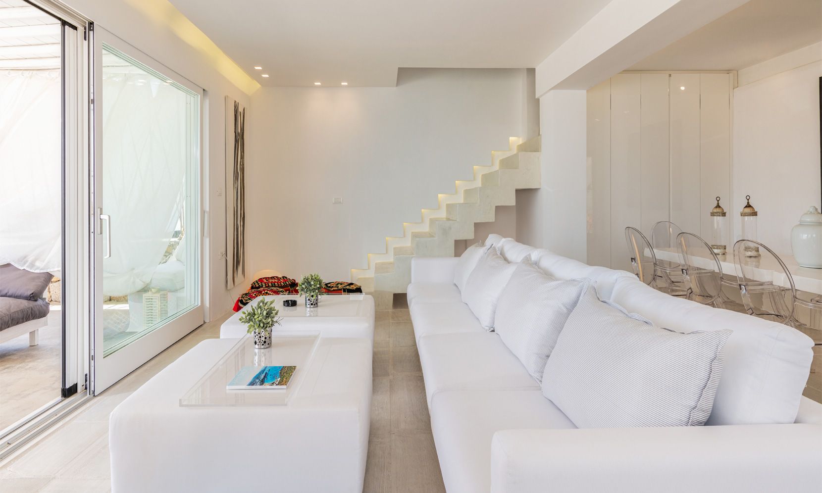 Across this Mykonos villas pool terrace and the shaded outdoor dining area, guests are welcomed into the main villa, which has just been fully renovated to the highest standard, with bespoke furniture and elements for summer 2018. This offers a spacious and stylish living room and an open-plan kitchen that together with the auxiliary bathroom are situated on this level. The living room exits to a large veranda with an additional dining/lounging area that can comfortably accommodate additionally a large group of guests. A staircase leads up to the bedroom level of the main villa, where three en suite bedrooms with double beds are located. The master bedroom is overlooking Psarou beach and Nammos Restaurant, and the other two the vibrant pool and the garden/outdoor area. All three rooms exit to a veranda that offers a splendid view of the Aegean Sea, Psarou beach and Islands at a distance.