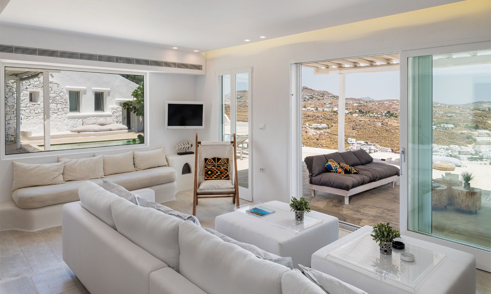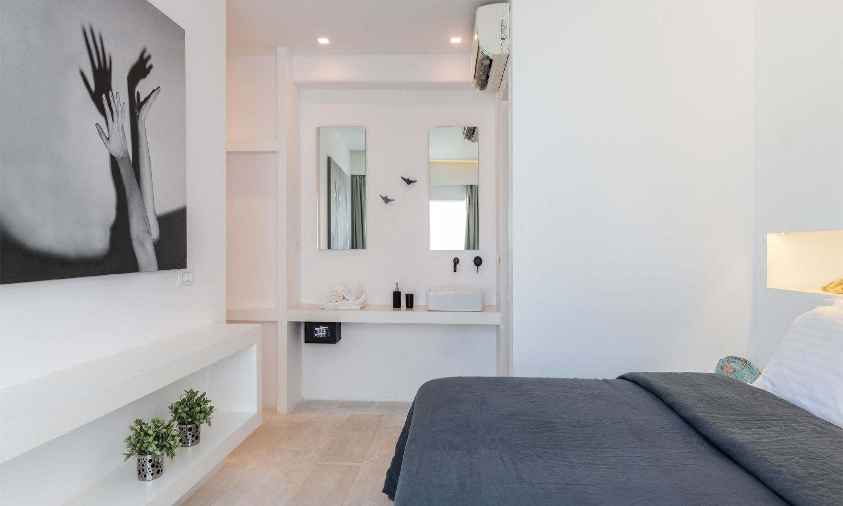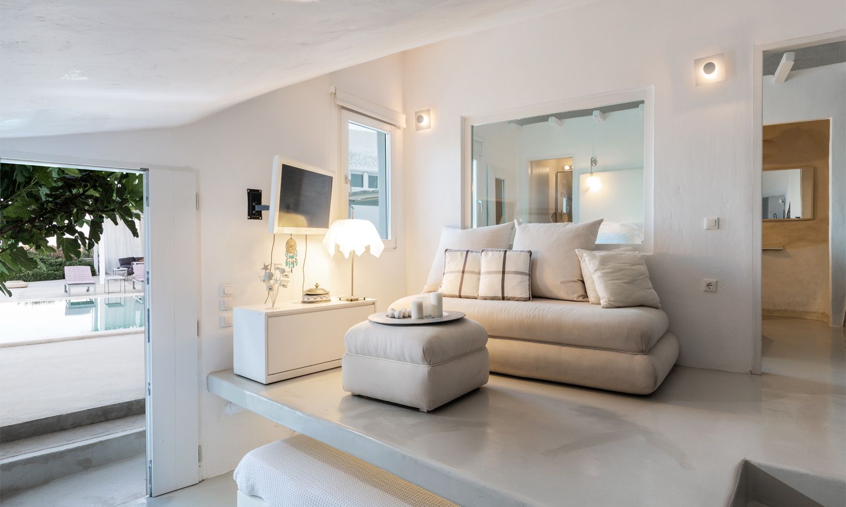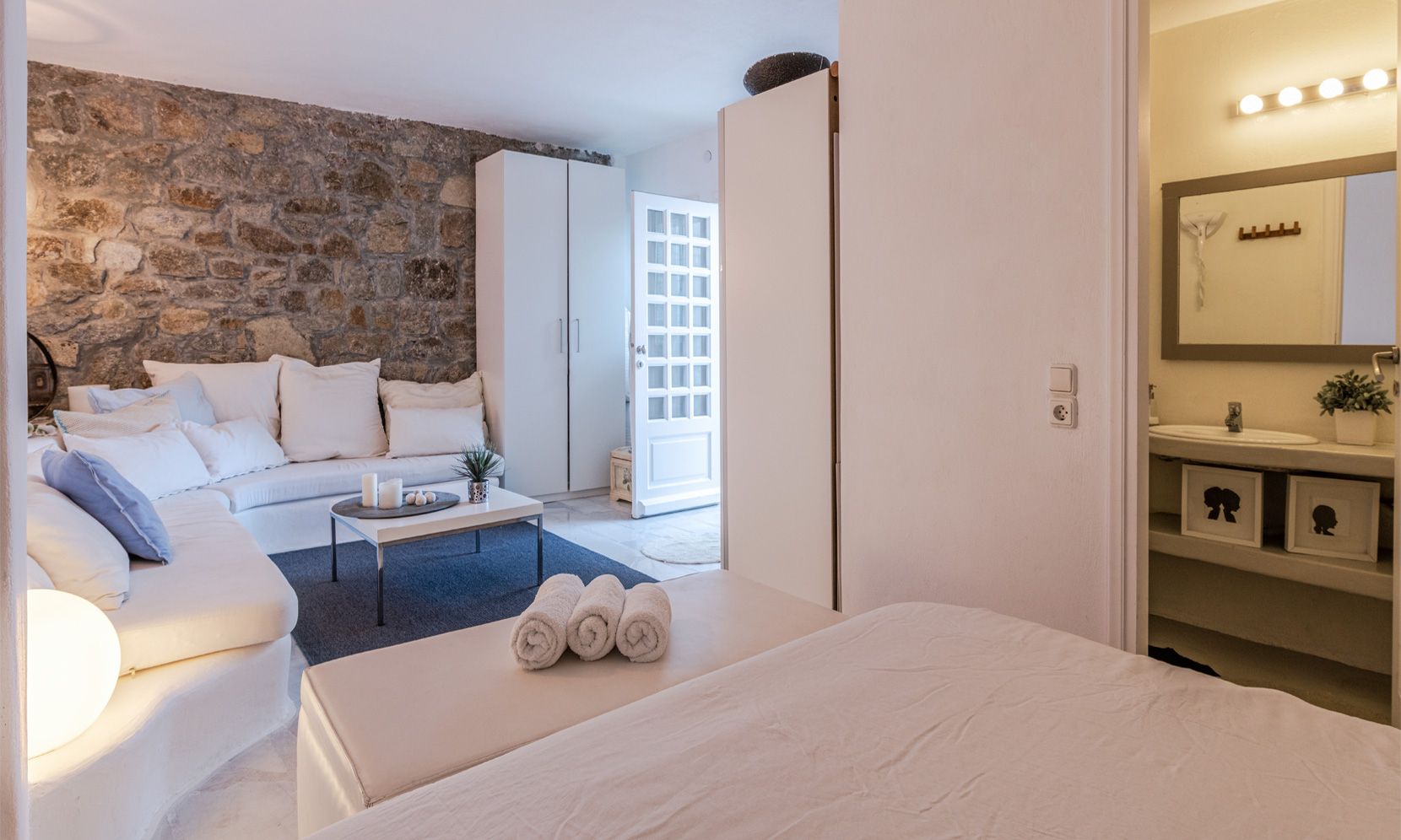 Upon entry to this Mykonos villas one finds the independent guest house composed of an en-suite bedroom with a double bed and a walk-in closet and a cozy living room that exits to the pool terrace. The guest house houses 2 adults.