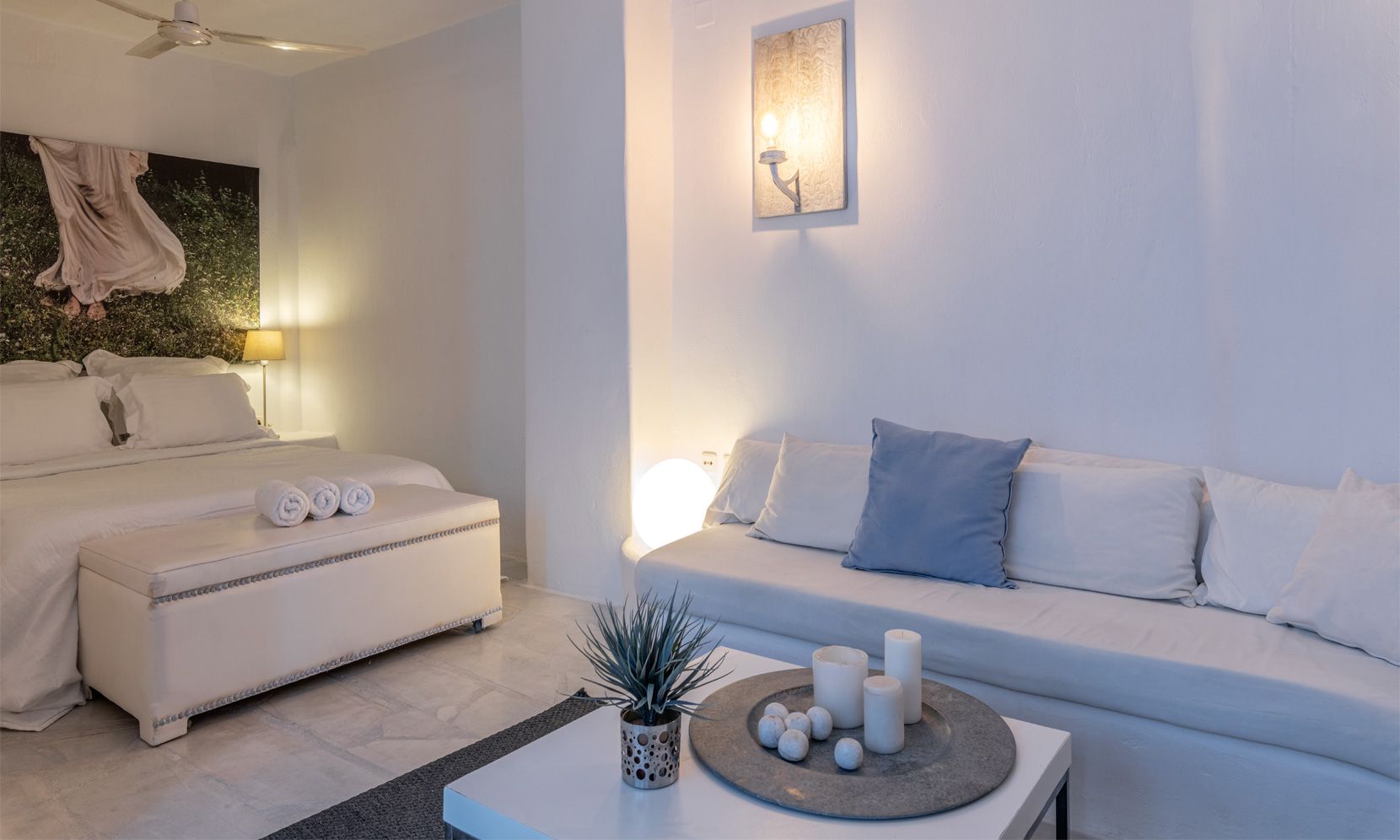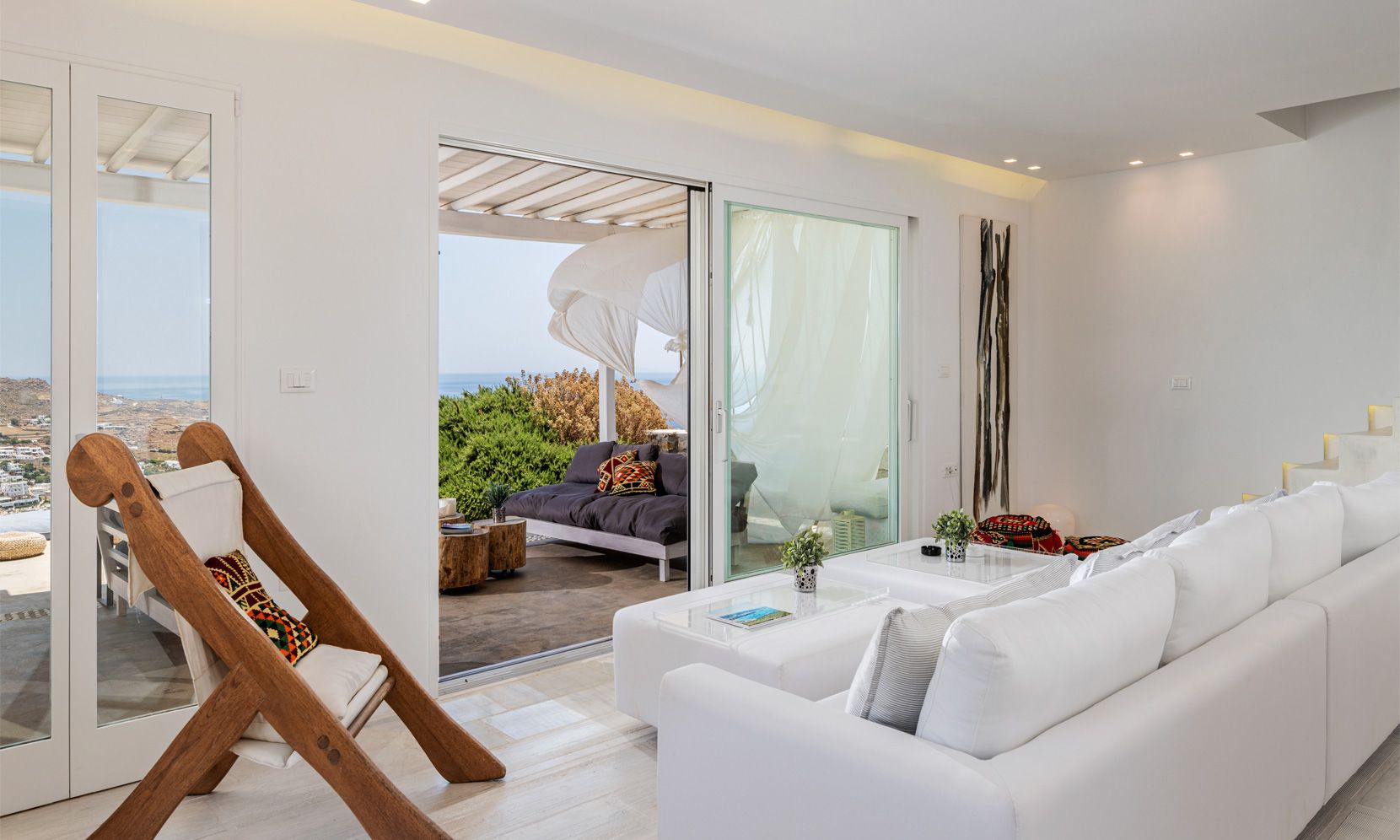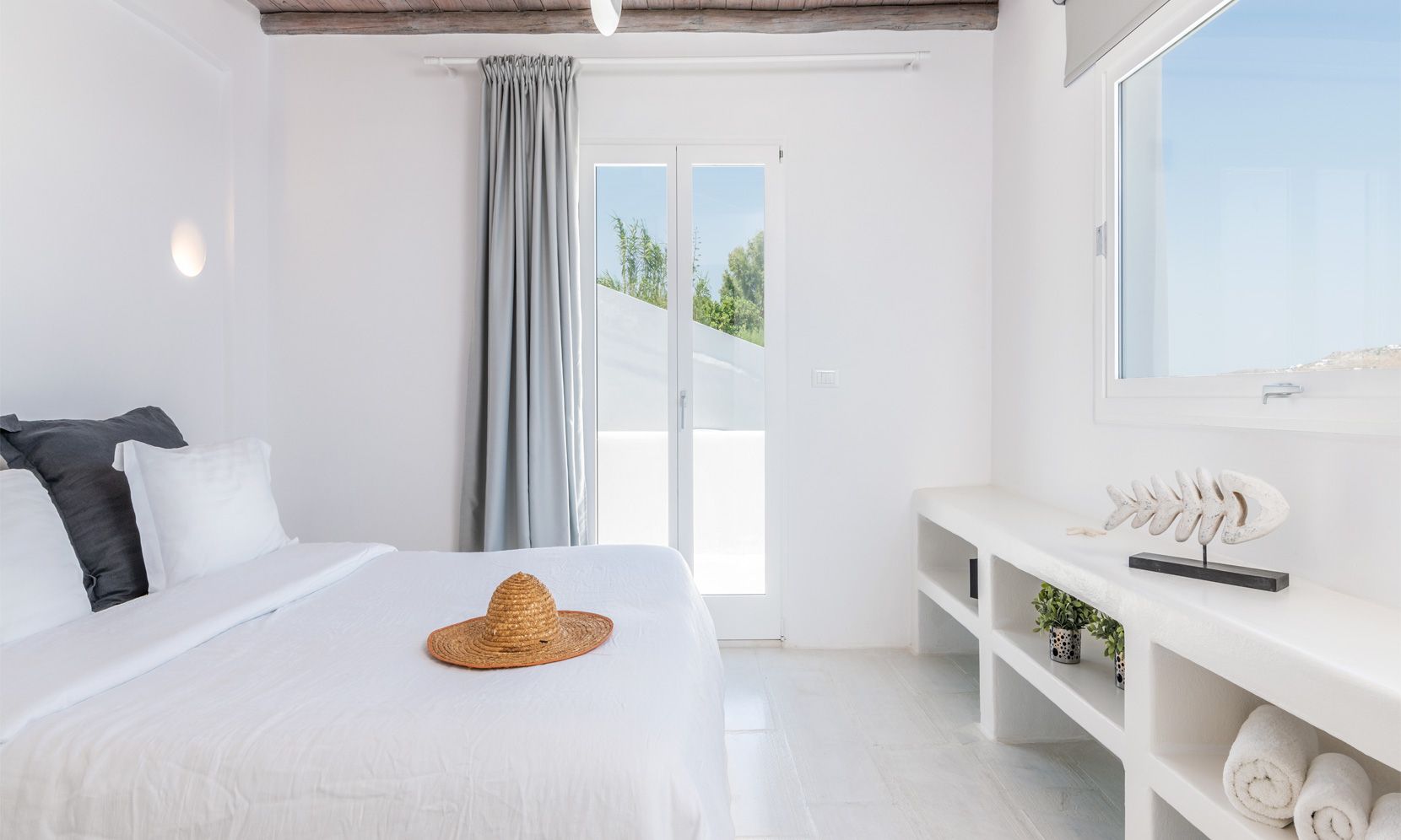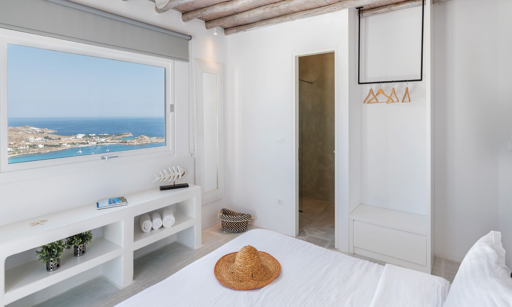 Upon entry to this Mykonos villas one finds the independent guest house composed of an en-suite bedroom with a double bed and a walk-in closet and a cozy living room that exits to the pool terrace. The guest house houses 2 adults.