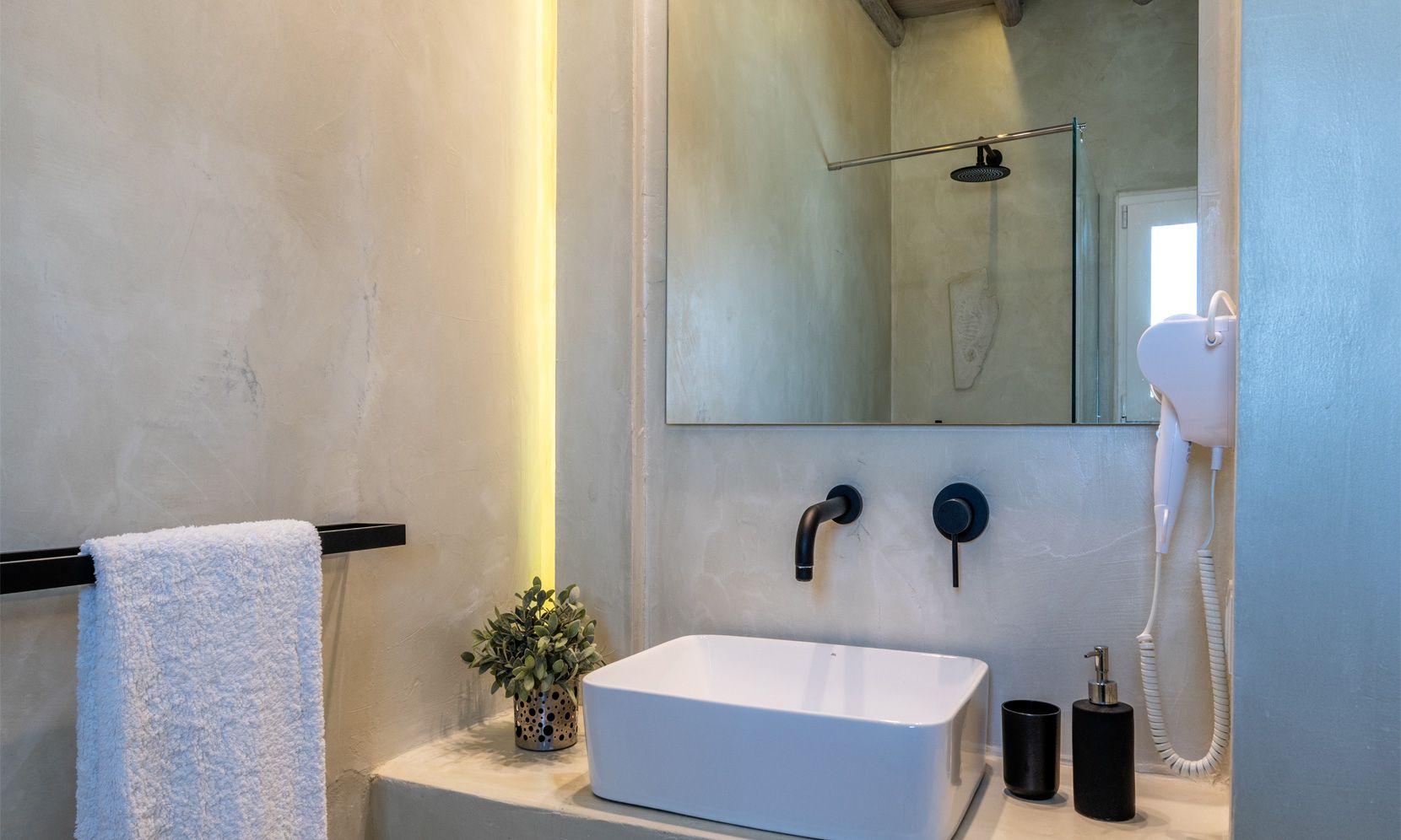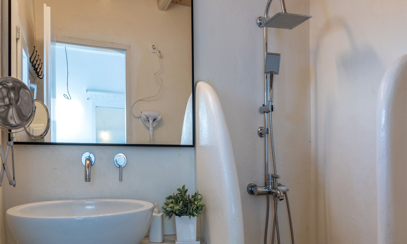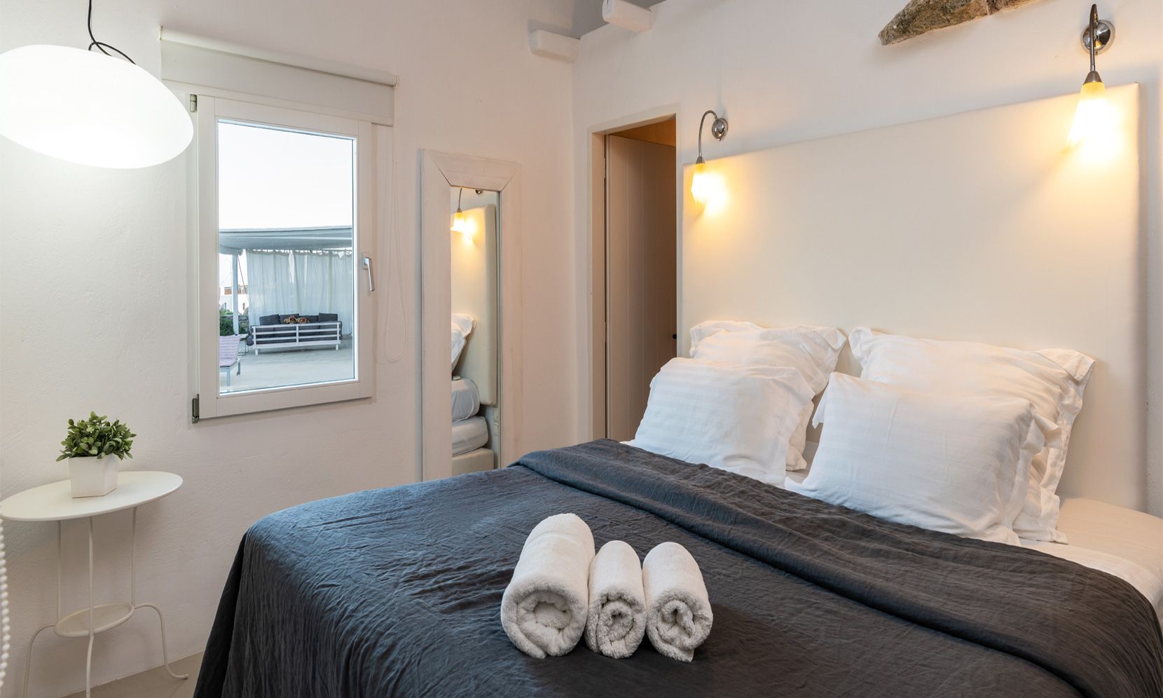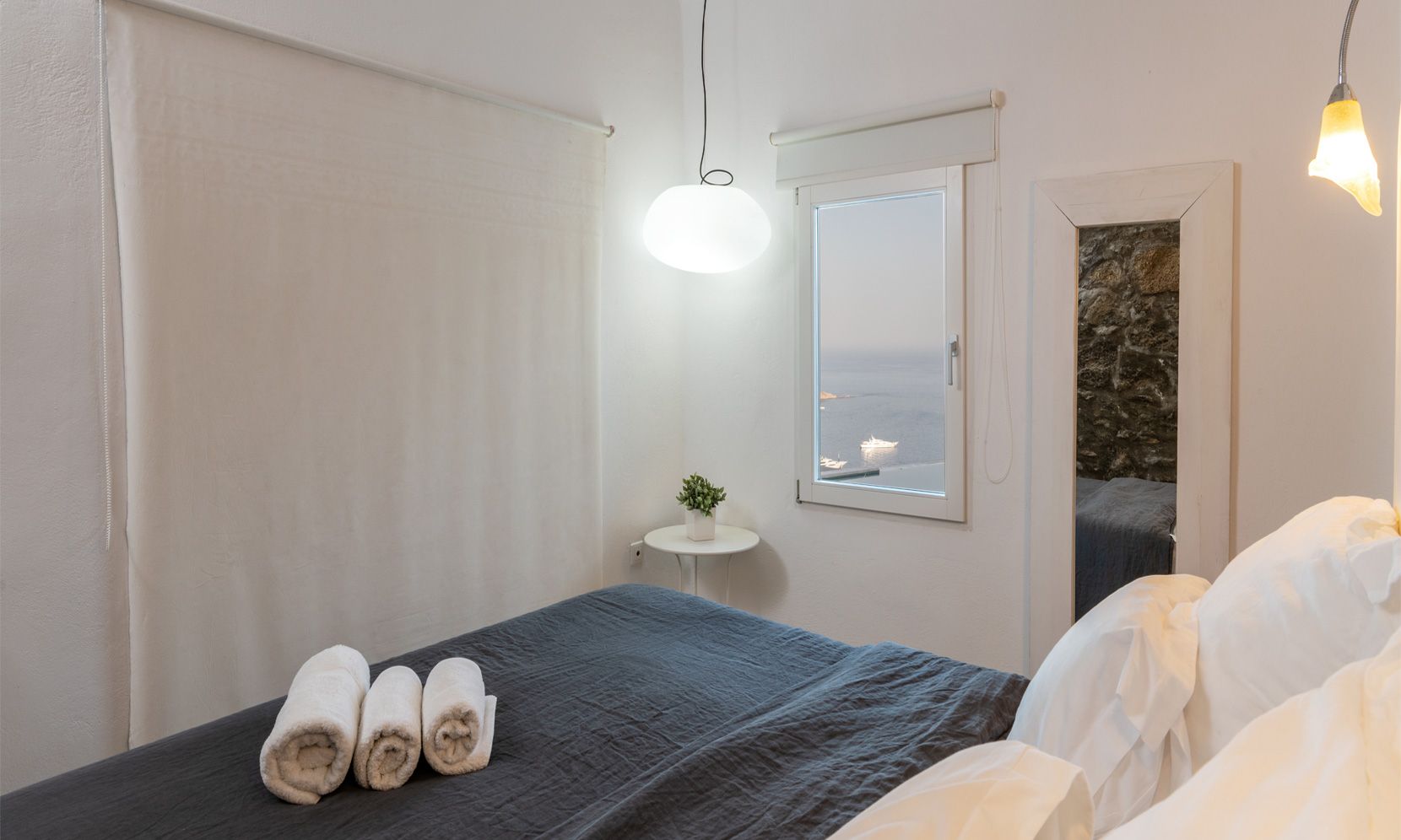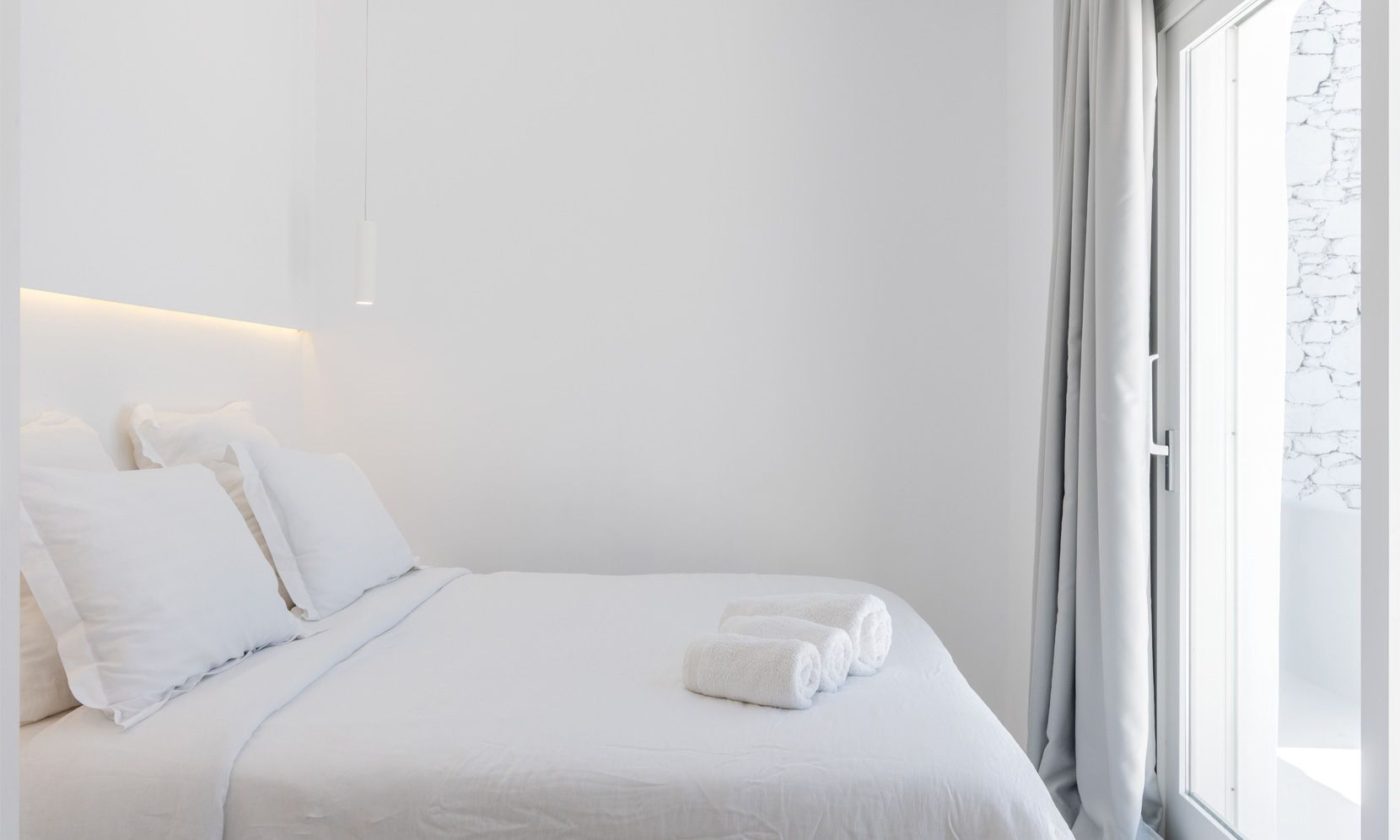 Upon entry to this Mykonos villas one finds the independent guest house composed of an en-suite bedroom with a double bed and a walk-in closet and a cozy living room that exits to the pool terrace. The guest house houses 2 adults.