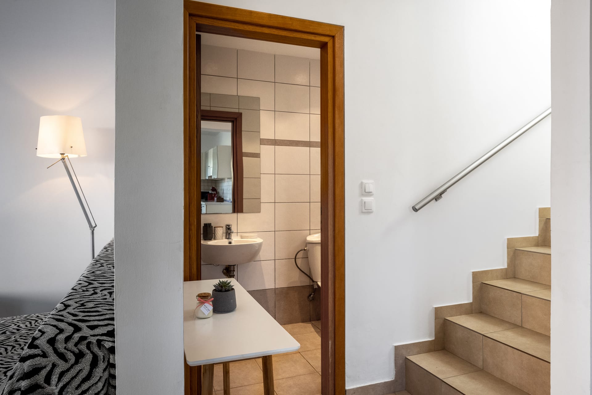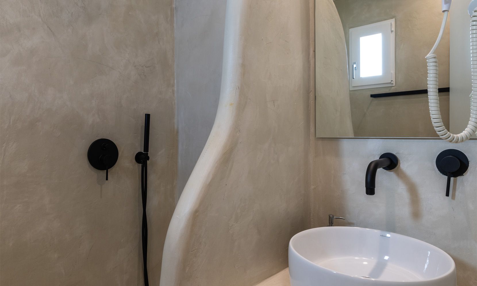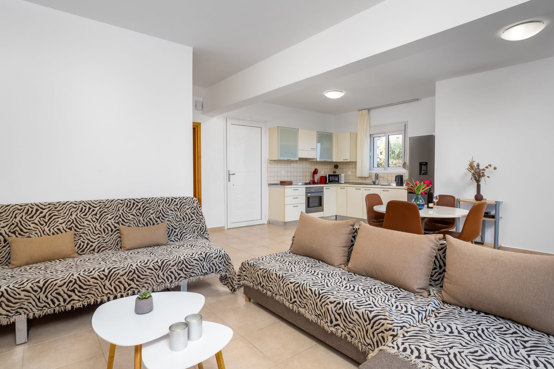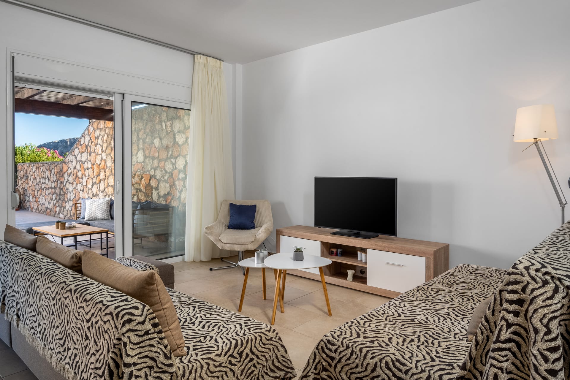 Upon entry to this Mykonos villas one finds the independent guest house composed of an en-suite bedroom with a double bed and a walk-in closet and a cozy living room that exits to the pool terrace. The guest house houses 2 adults.