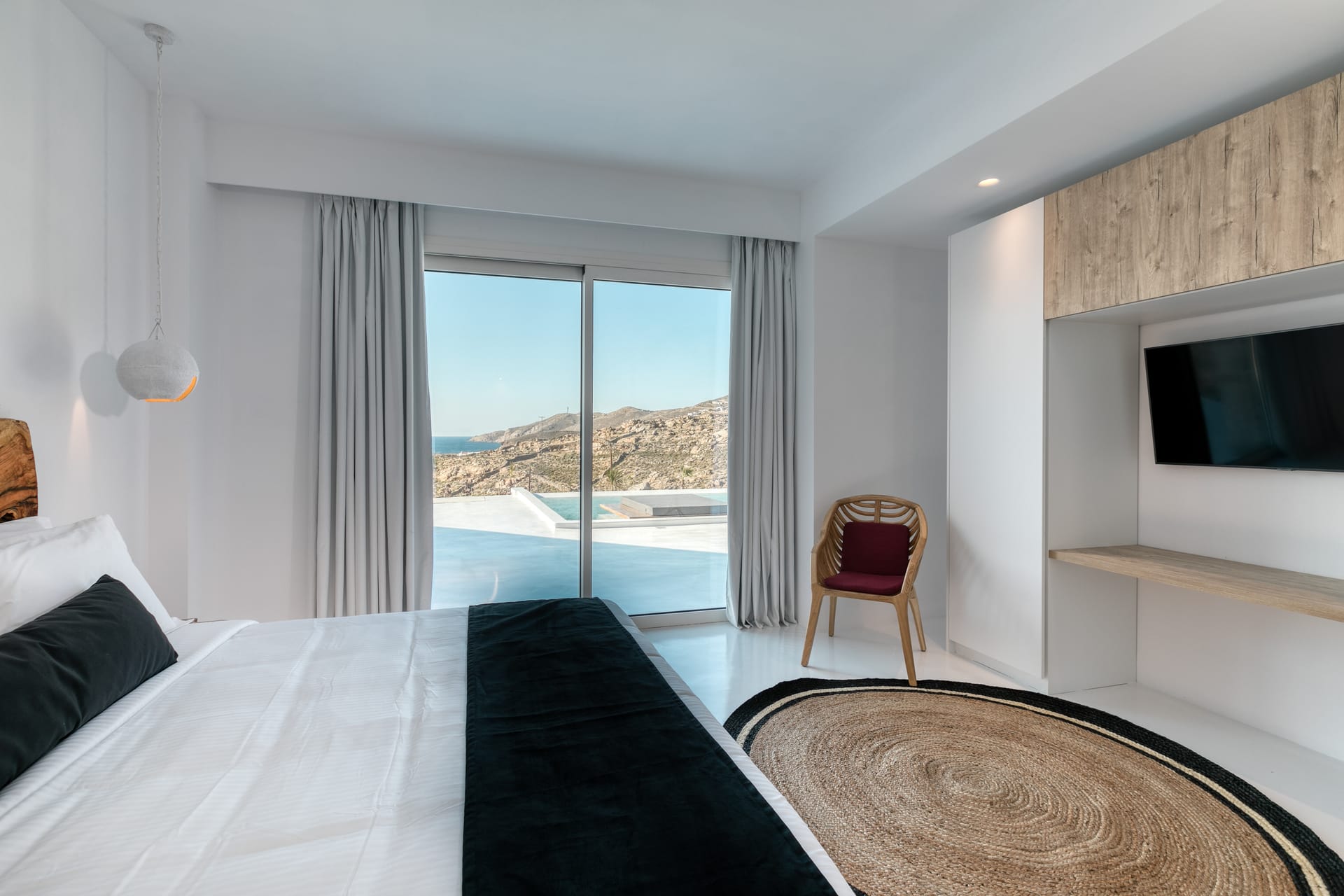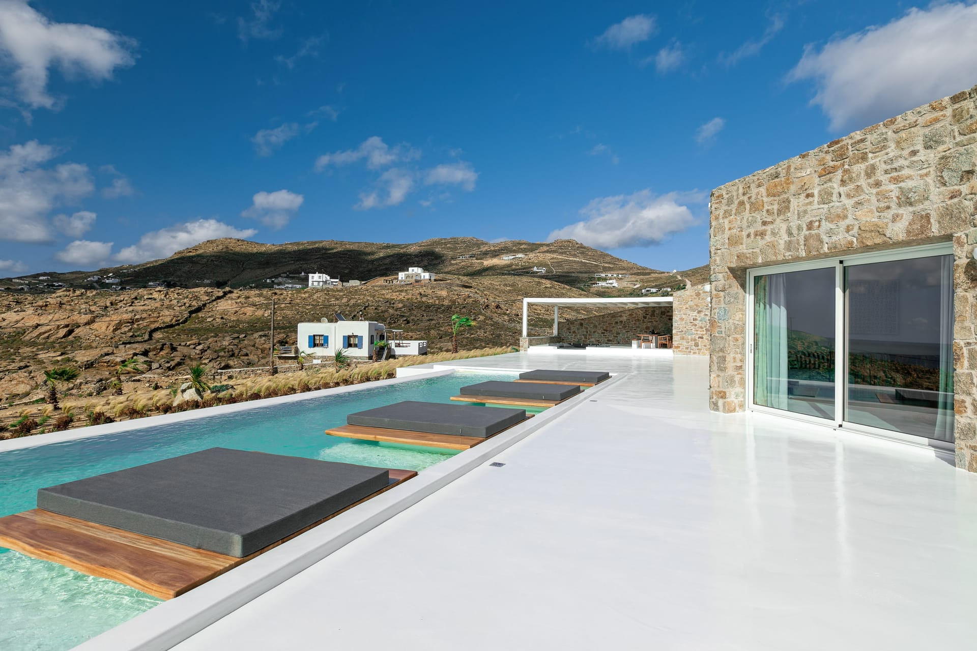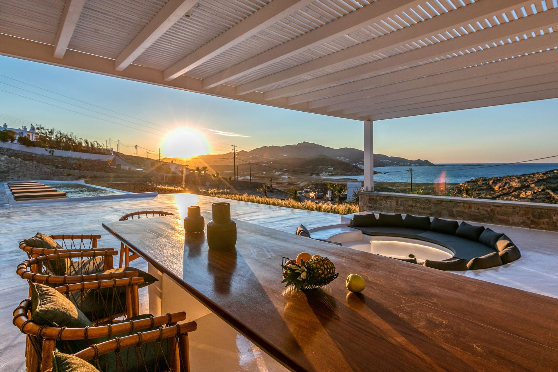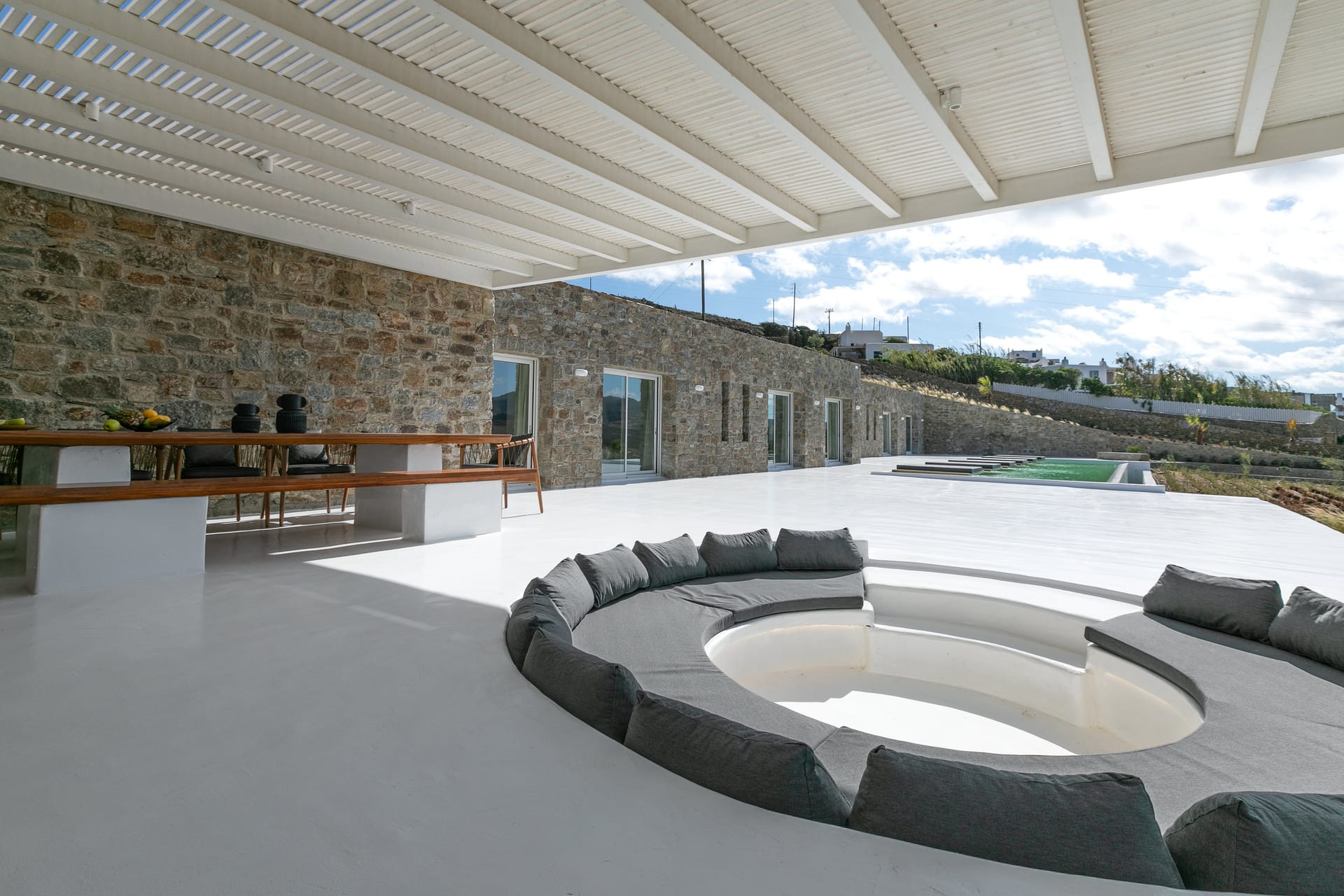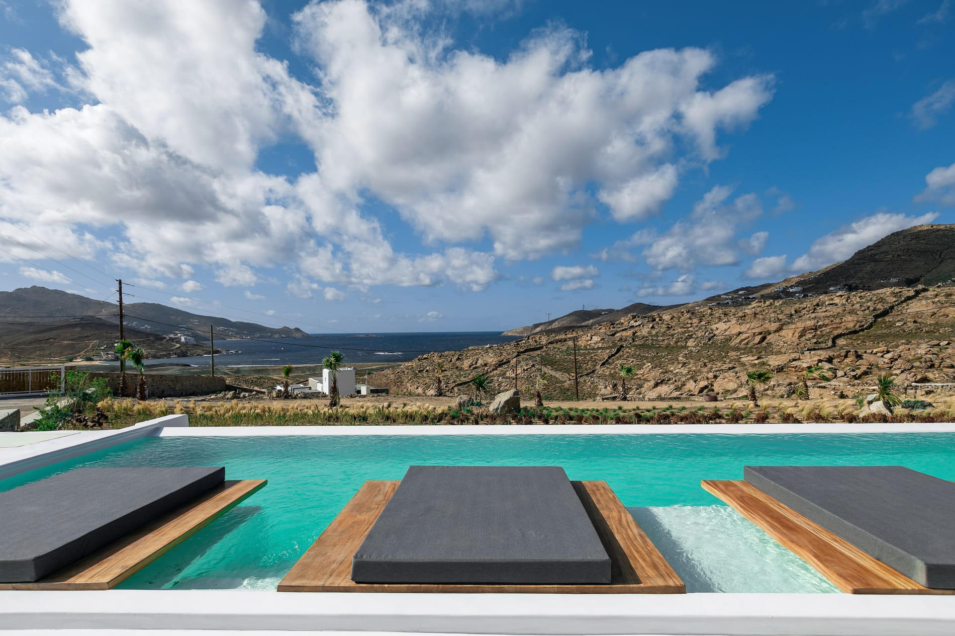 The exquisite villa alfresco areas are a sight to behold. Designed in high aesthetics and offering relaxation and lounging areas, it will be your own paradise in Mykonos to enjoy private moments of comfort, dine under the stars under pergola-protected areas, enjoy intimate swimming pool moments and take in the Mediterranean sun in the large infinity pool. Lie on the in-pool sun beds and let go in the calming moments that Villa Noir offers.