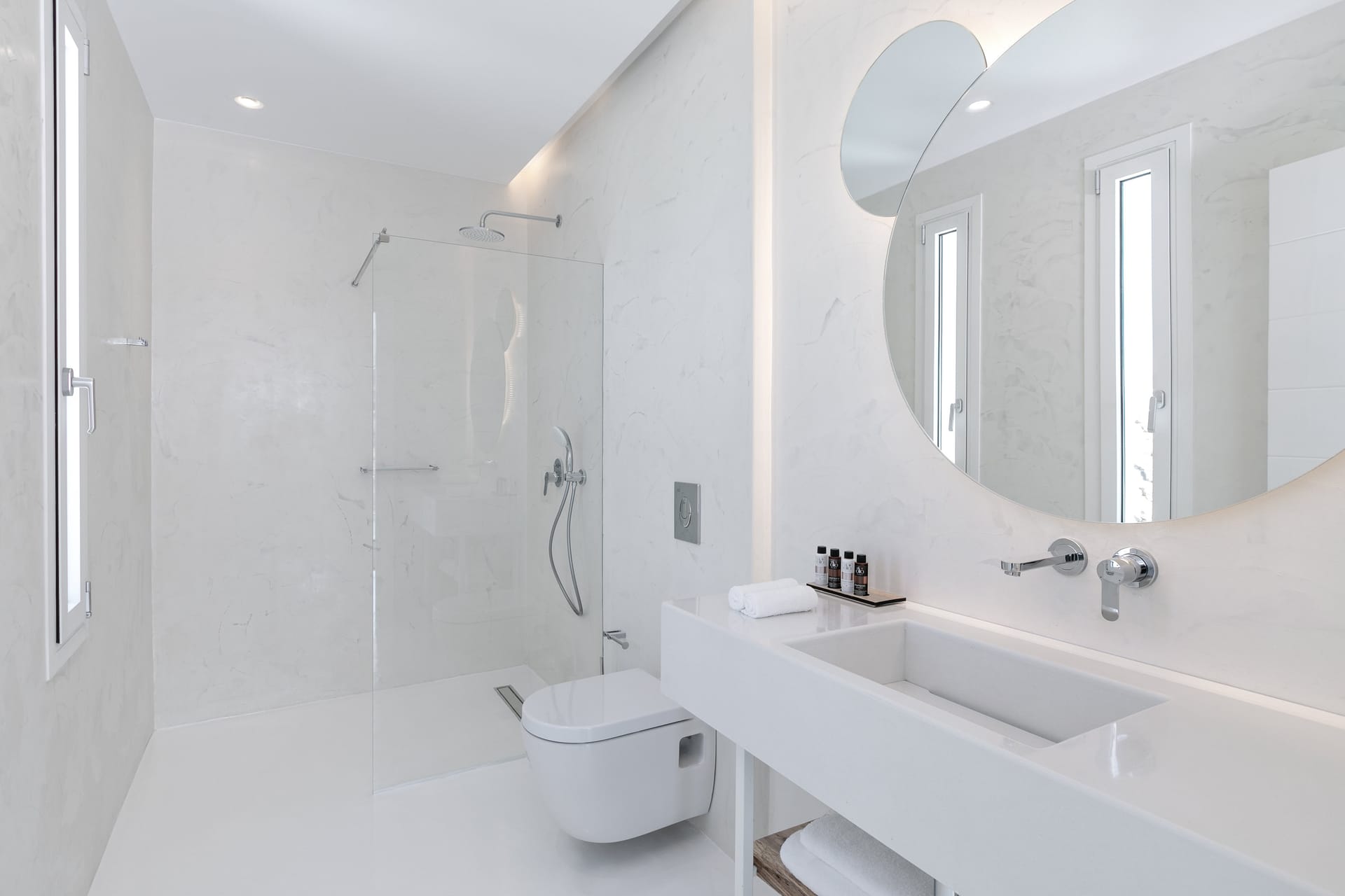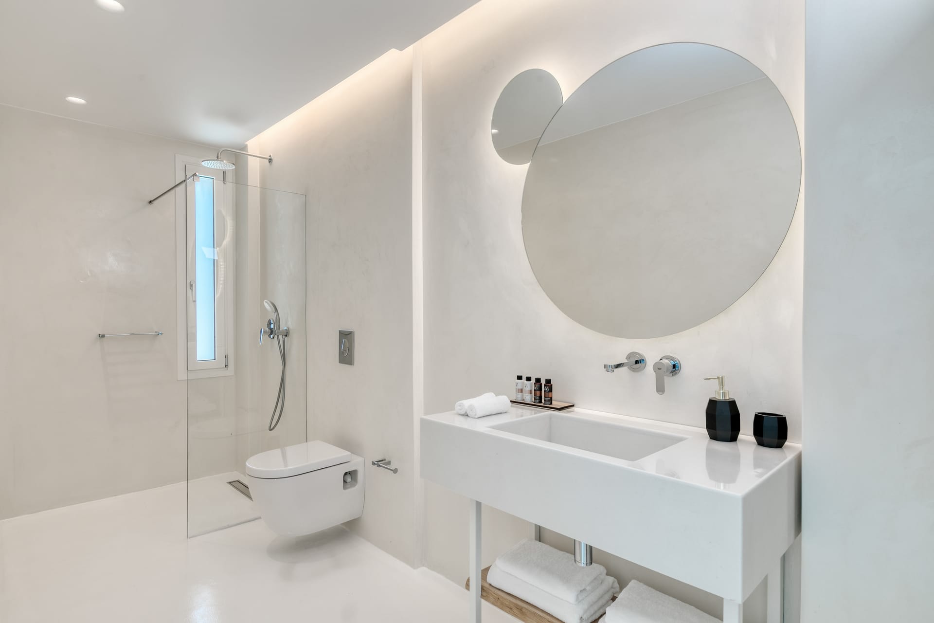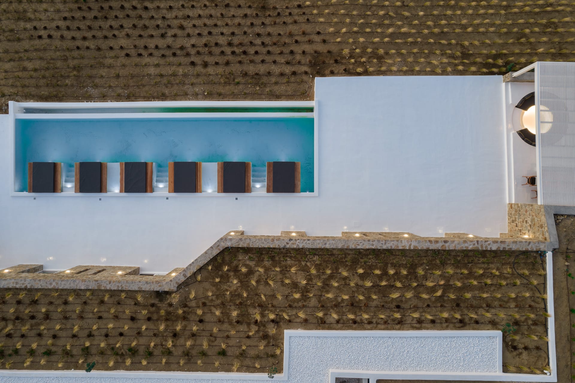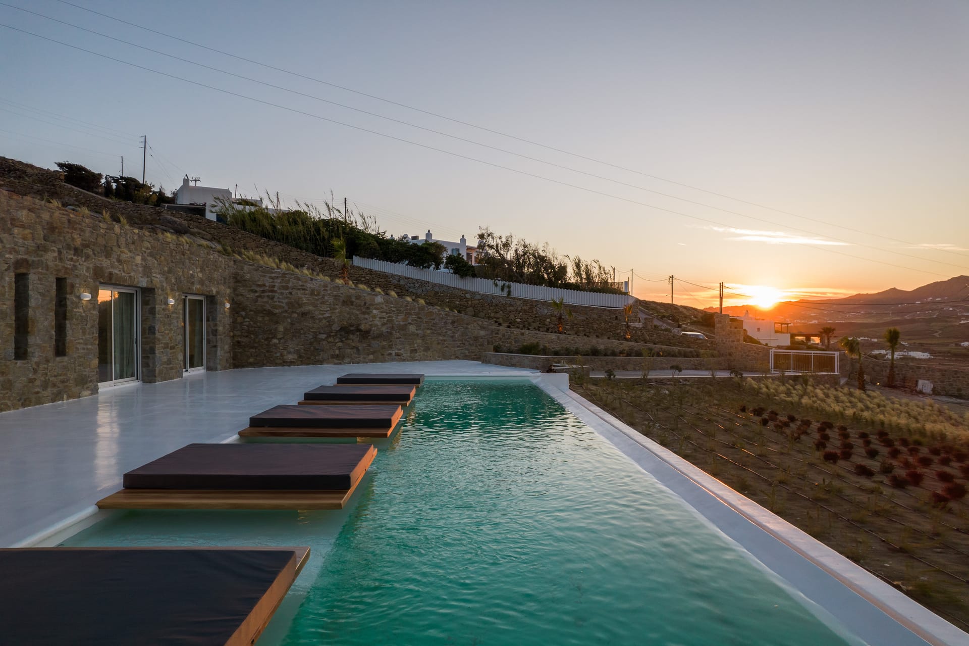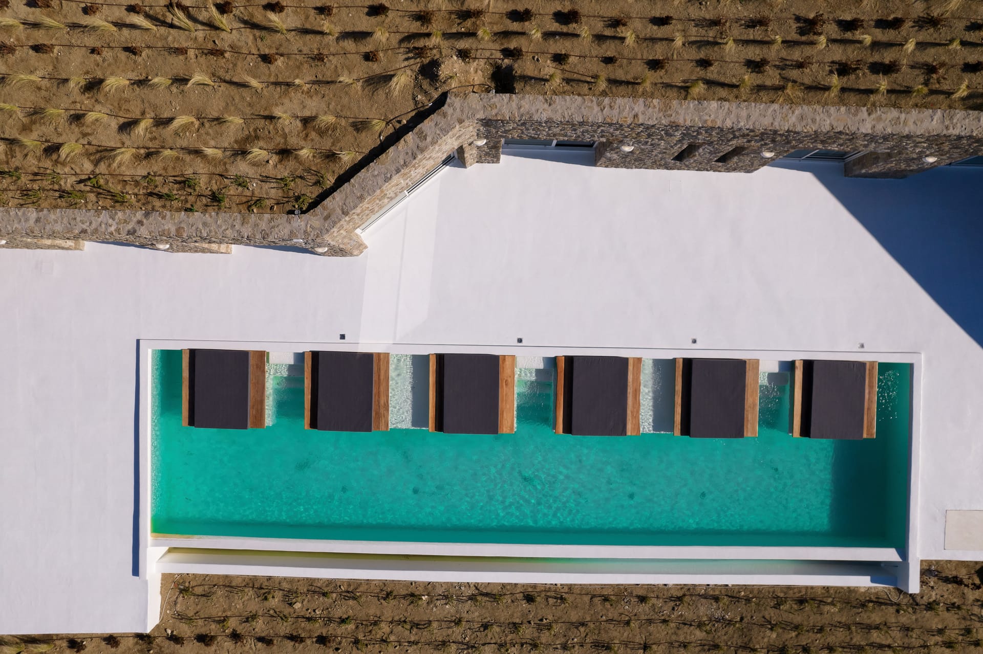 The exquisite villa alfresco areas are a sight to behold. Designed in high aesthetics and offering relaxation and lounging areas, it will be your own paradise in Mykonos to enjoy private moments of comfort, dine under the stars under pergola-protected areas, enjoy intimate swimming pool moments and take in the Mediterranean sun in the large infinity pool. Lie on the in-pool sun beds and let go in the calming moments that Villa Noir offers.