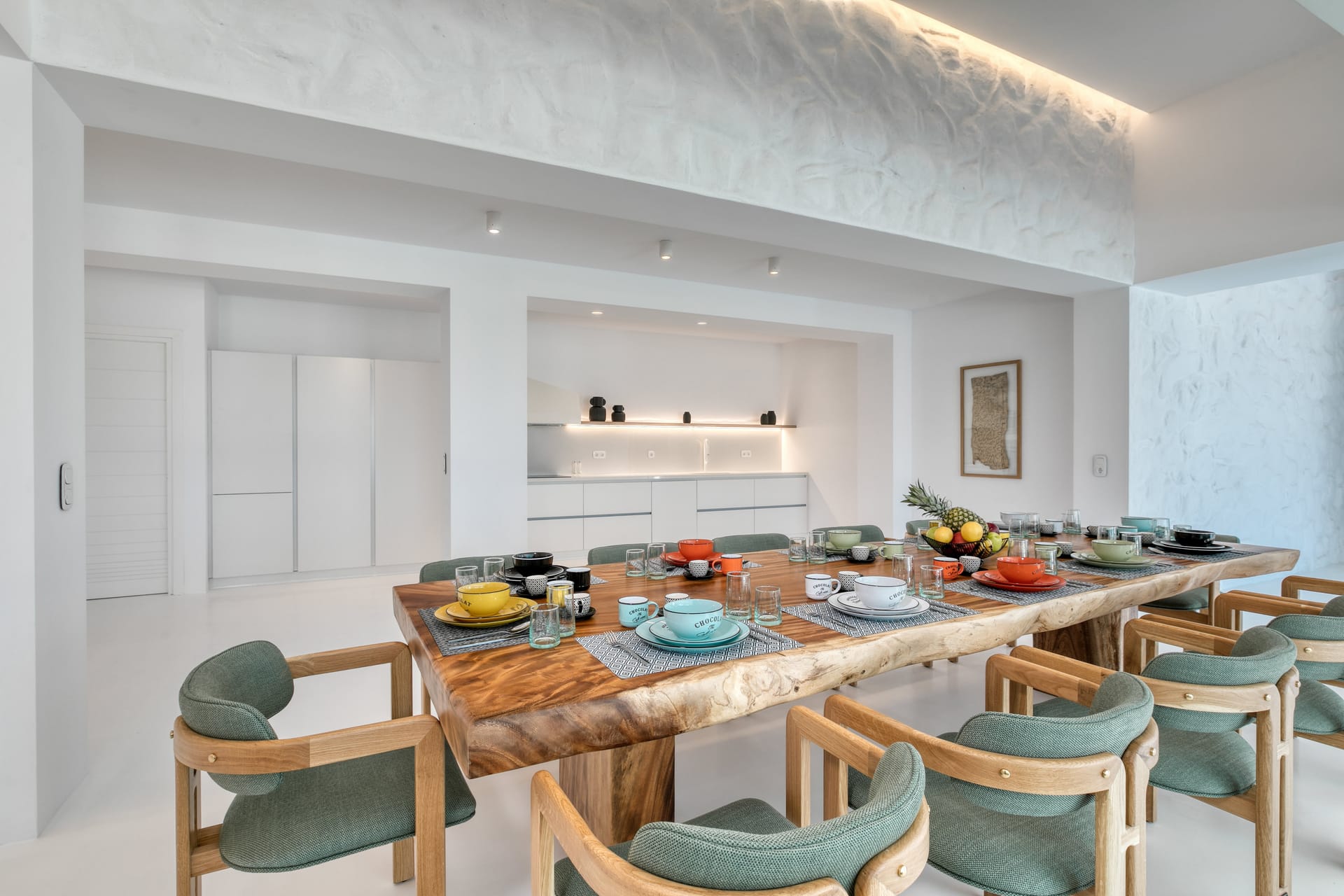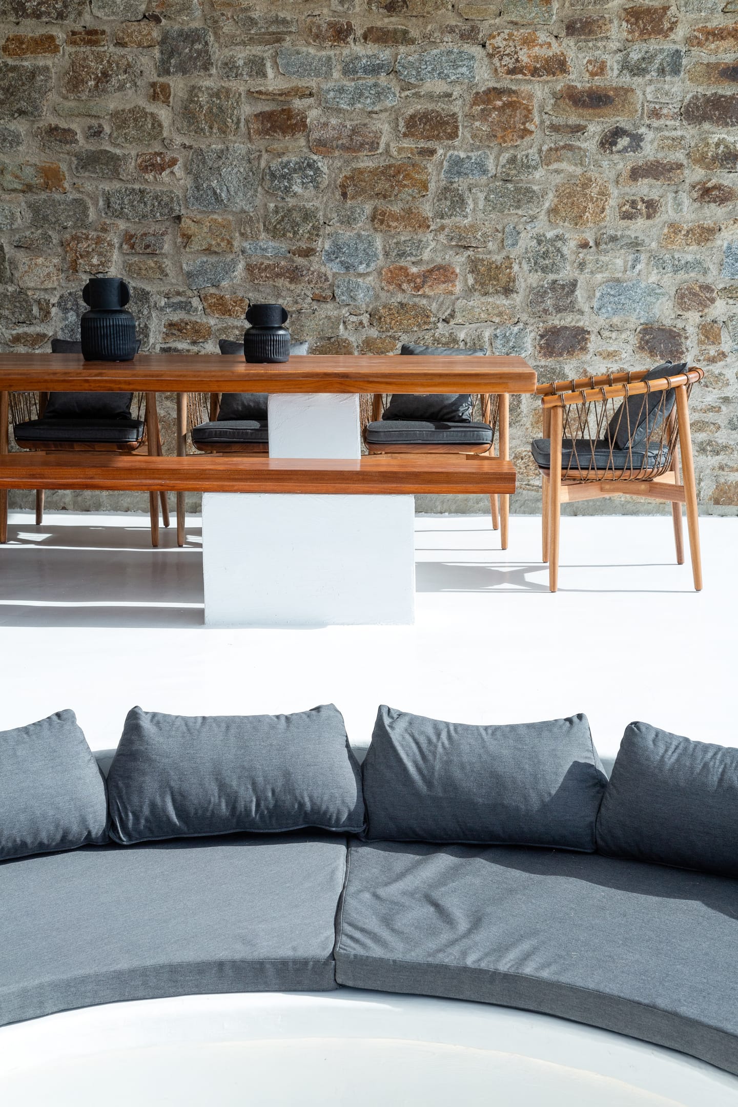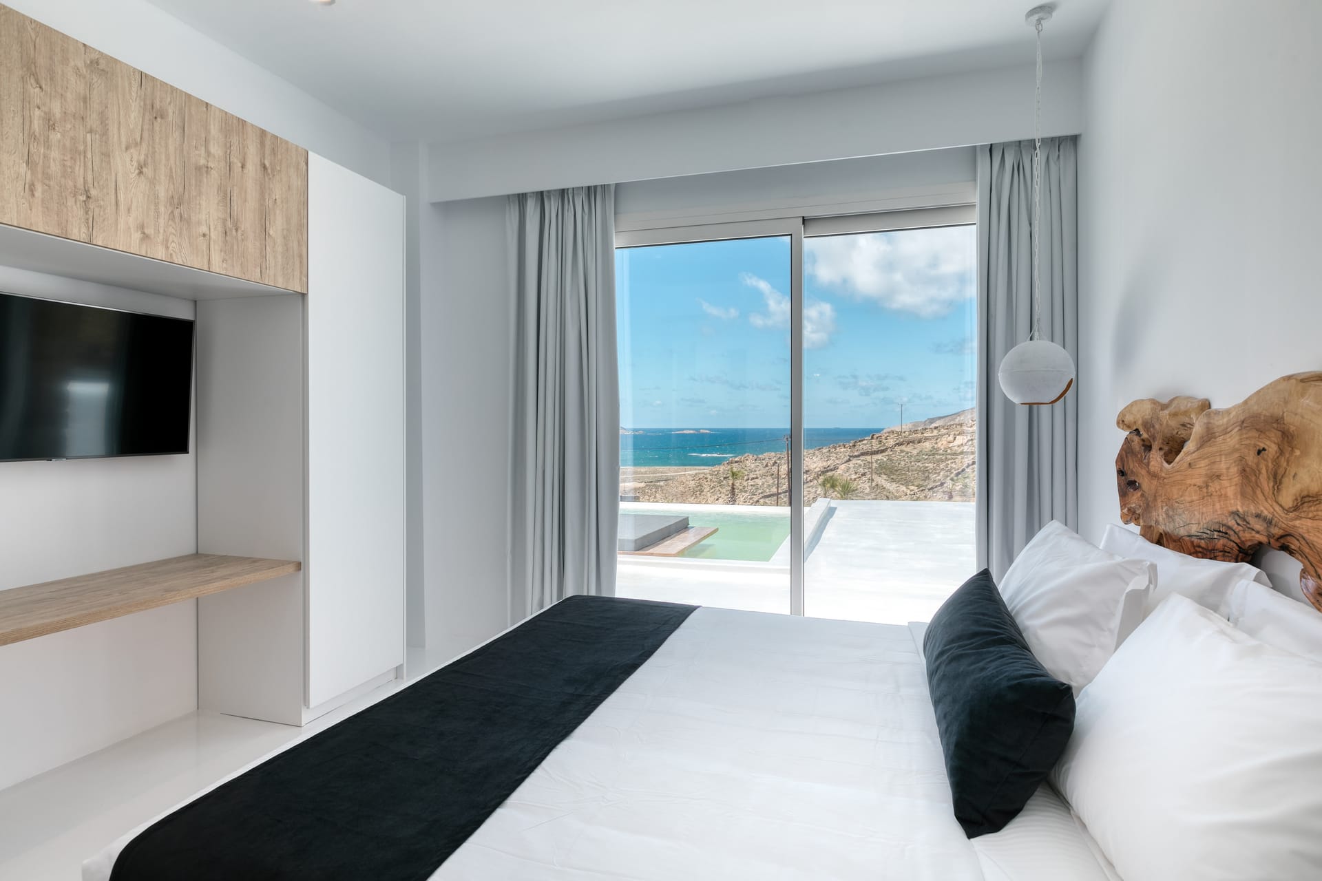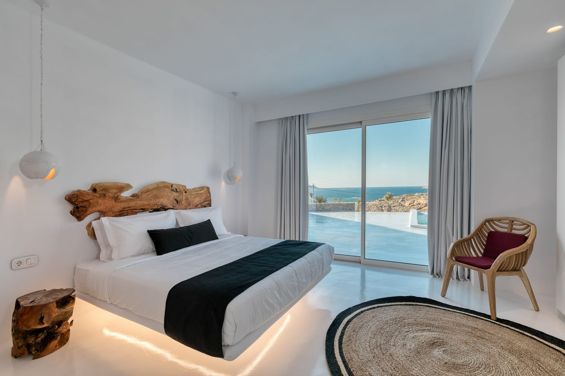 The luxury Mykonos Villa Noir interior design really speak for themselves. Fully equipped to the highest standards and featuring amazing private and communal areas, the villas guarantee pampering moments and intimacy for their lucky guests. From king-size beds to exceptionally equipped kitchens, huge living room areas and dining tables that waiting for you. Their minimal design and unique decoration are the perfect excuse to get those fab Instagram photos coming!