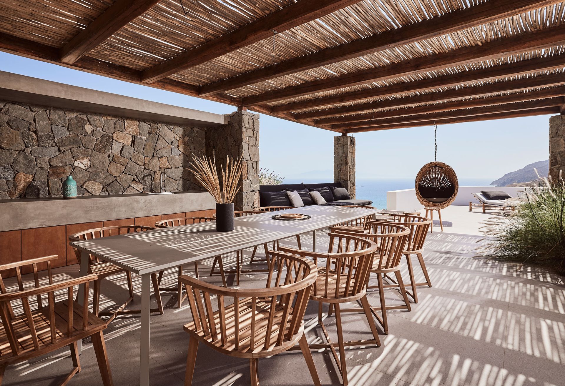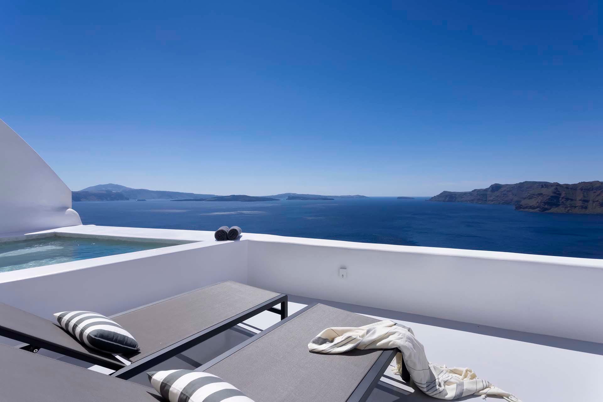 The elegant property expands on 2 levels: the upper level features the main unit, which hosts the main living and kitchen/dining areas along with 3 en suite double bedrooms (interior space), and the main exterior space which hosts the Infinity pool with the main outdoor sitting and dining areas. The lower level features 3 additional suites with independent entrances, two of which share a veranda with a sea view and lounge spots, and the staff room (staff-in-house). Designed elegantly down to the last detail and combining a clean architectural style with a minimal yet luxurious decoration, Villa Odyssey offers its guests the ultimate chance to experience the Greek hospitality, unwinding and relaxing in privacy.