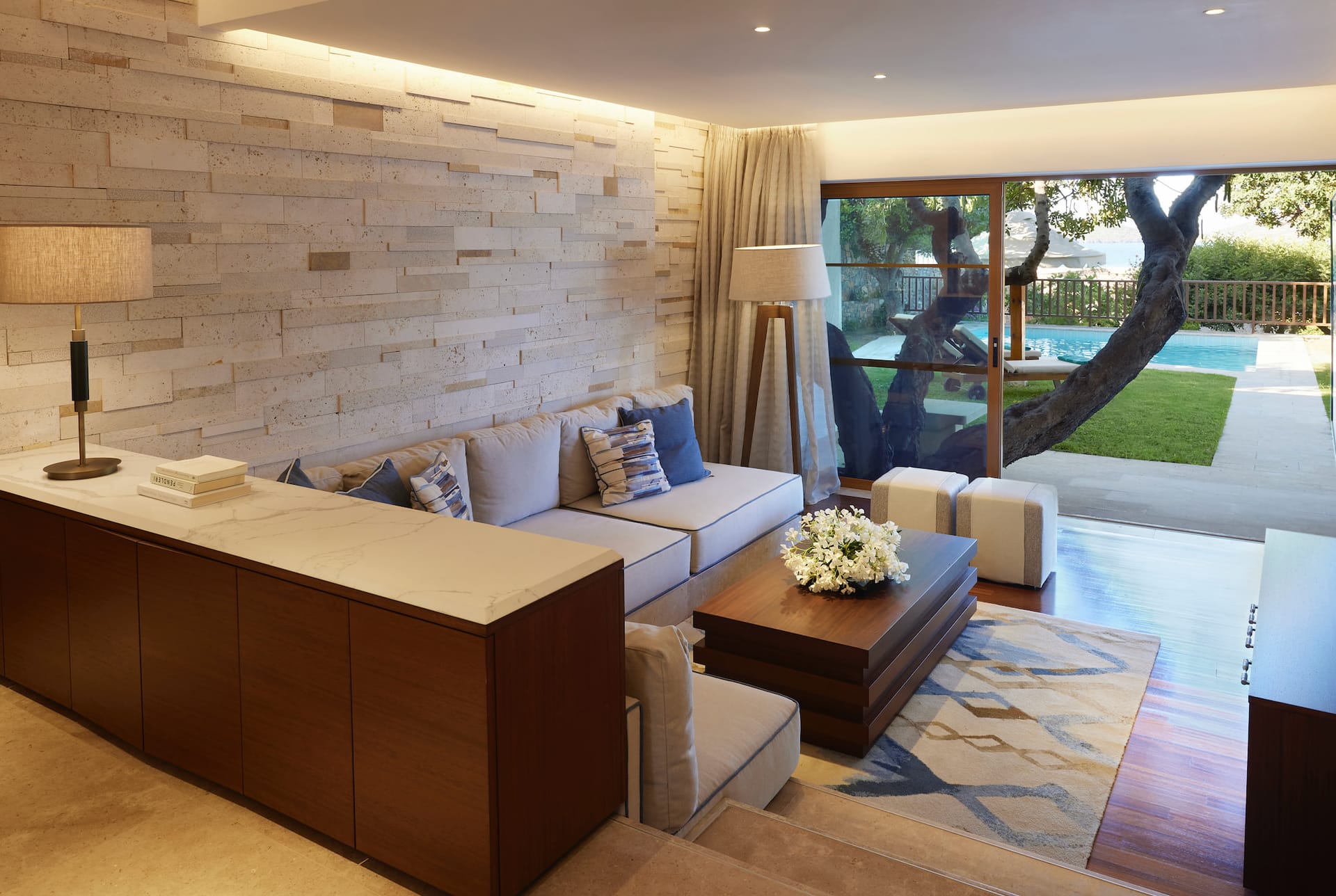 - Living room (opens to the pool area)