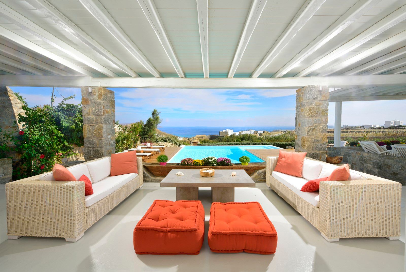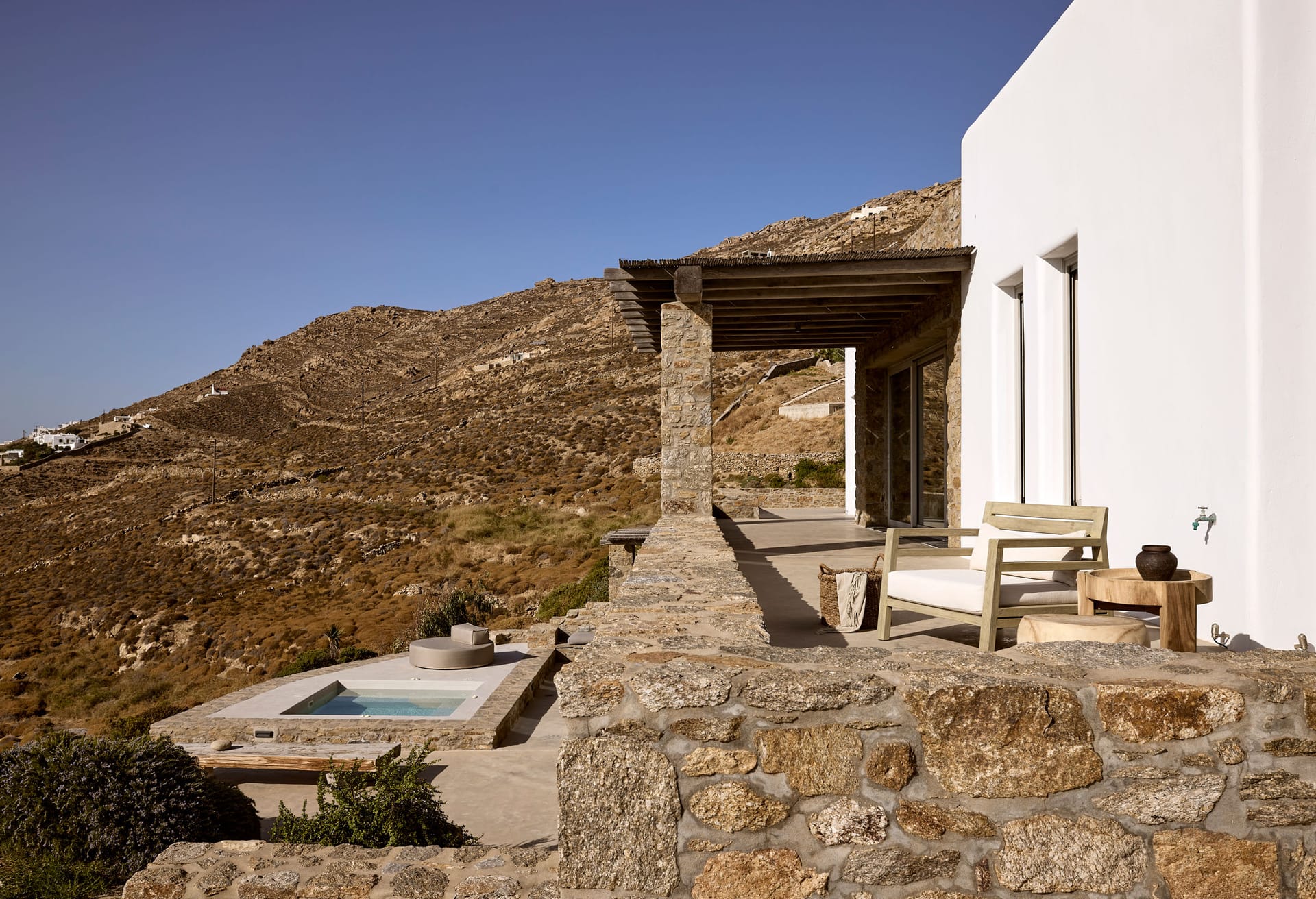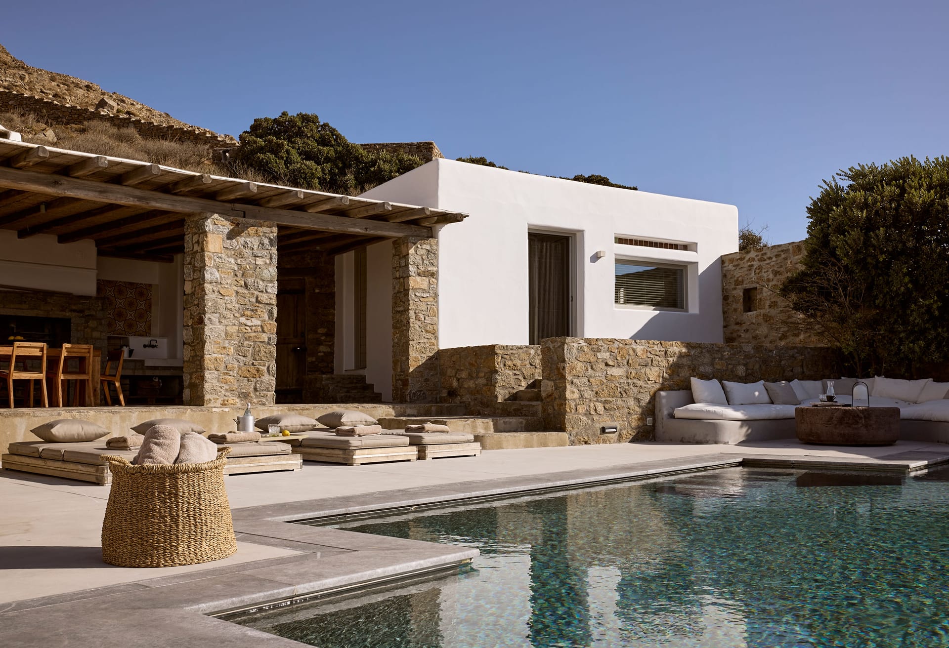The villa offers complete privacy at this lively island, with no neighbor "noise" as there are few houses in the area. Villa Ophelia combines the quite primitive aspect of Cyclades while being minutes away from the famous Mykonos nightclubs and restaurants!