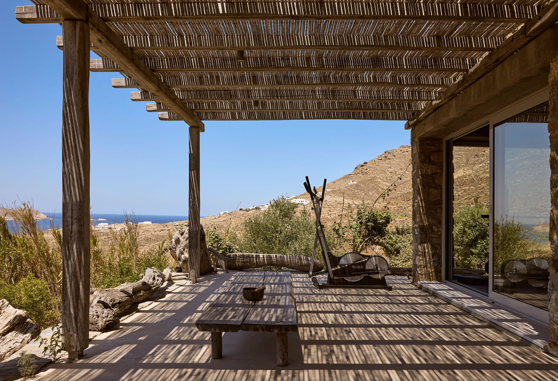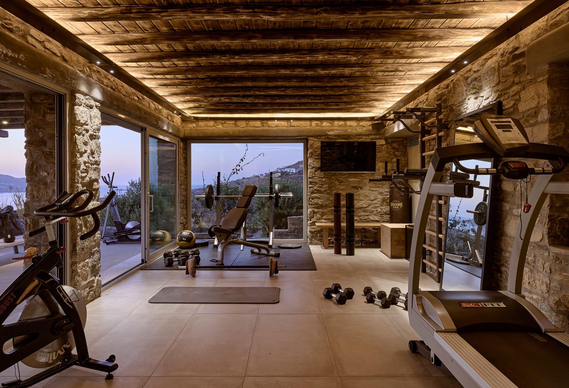 Free training facility overlooking Ftelia Beach. Glass-wall opens to connect space with outdoor pergola. Massage area. Total area 70m2
