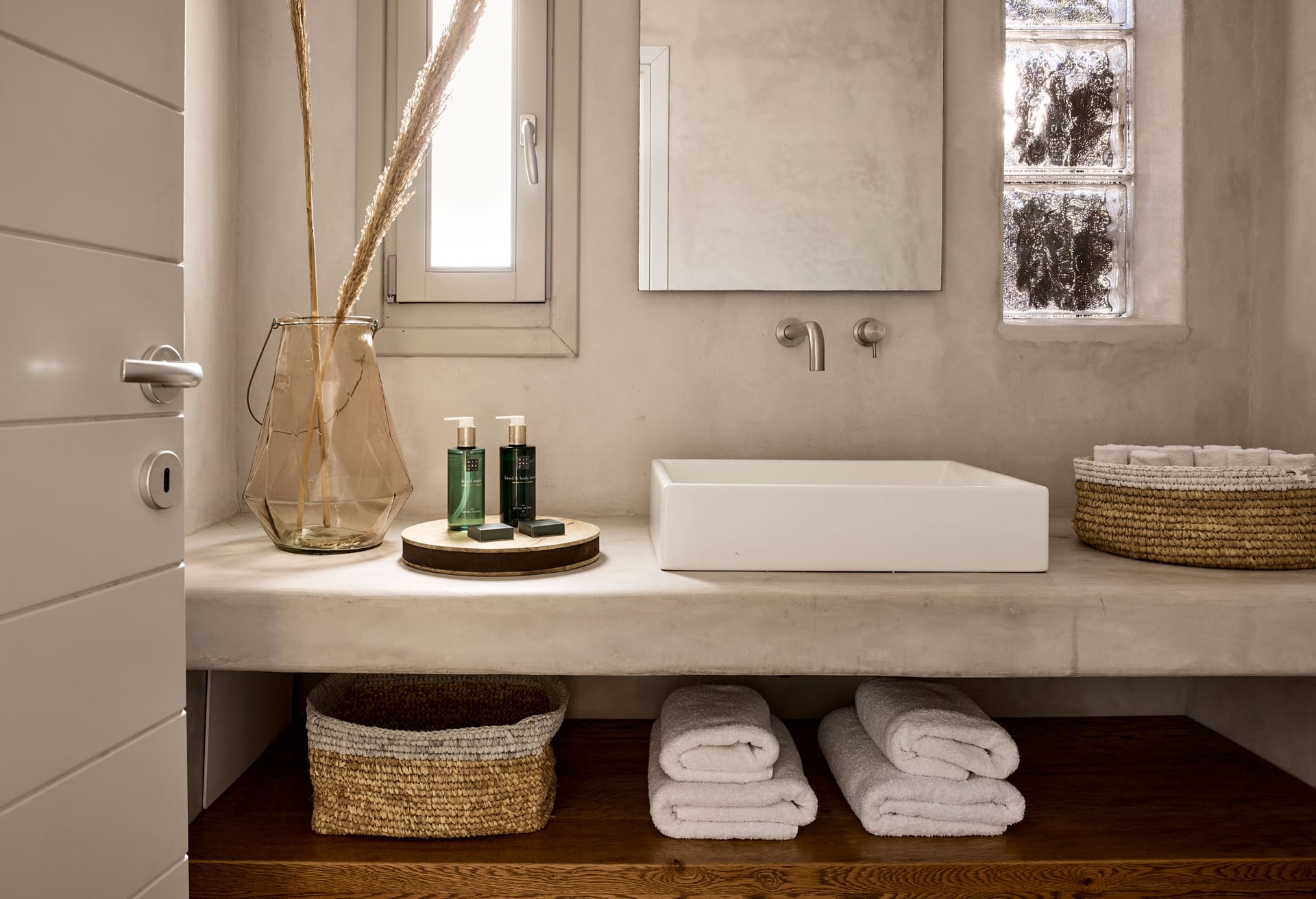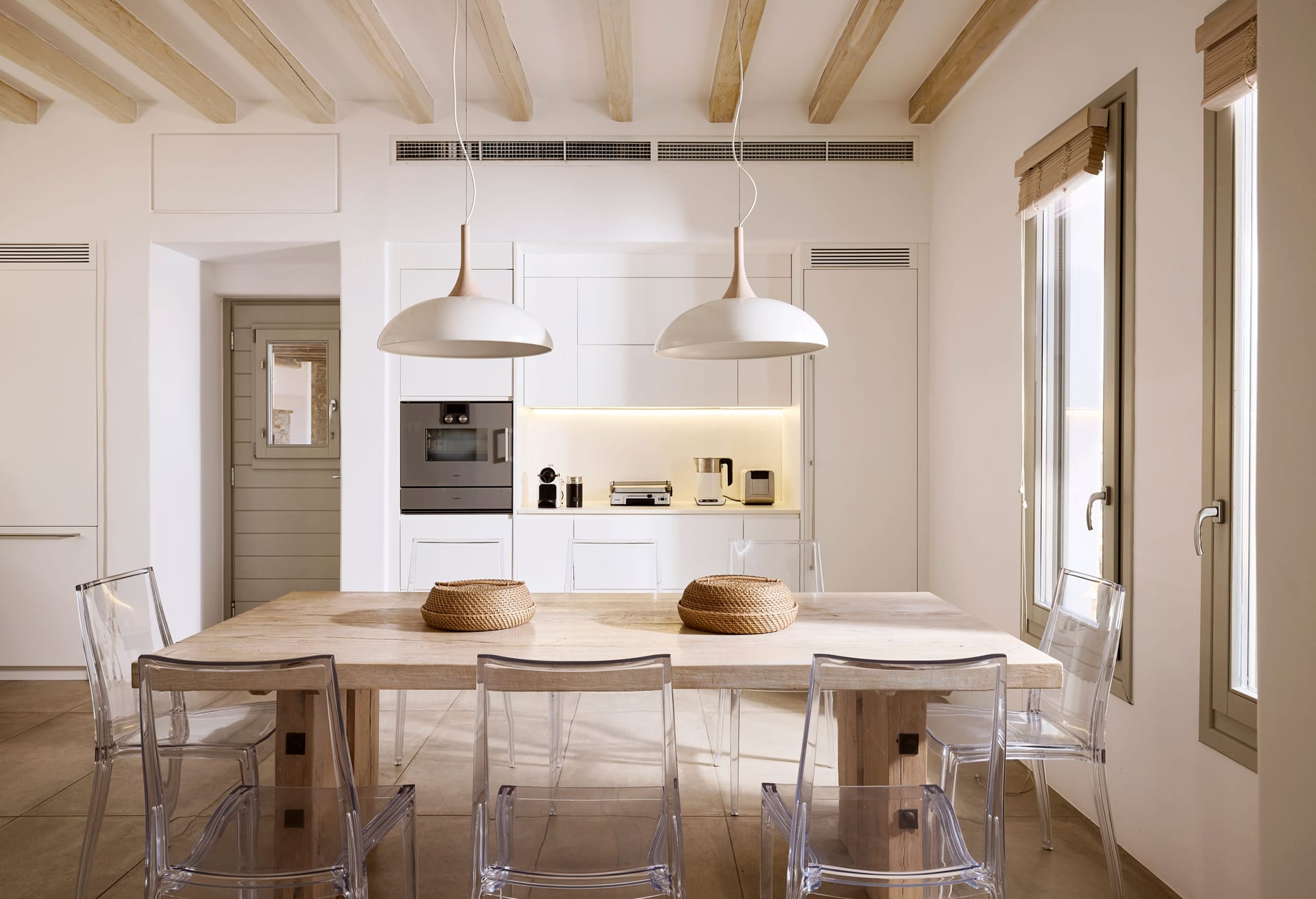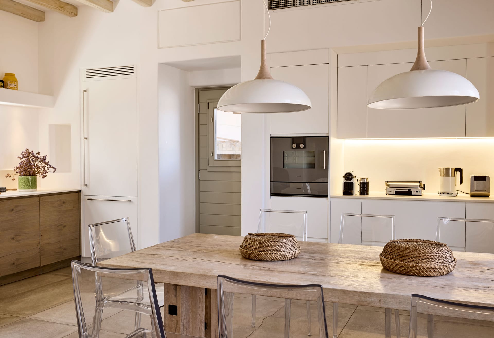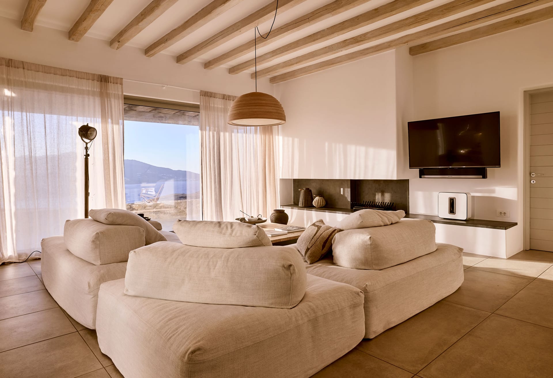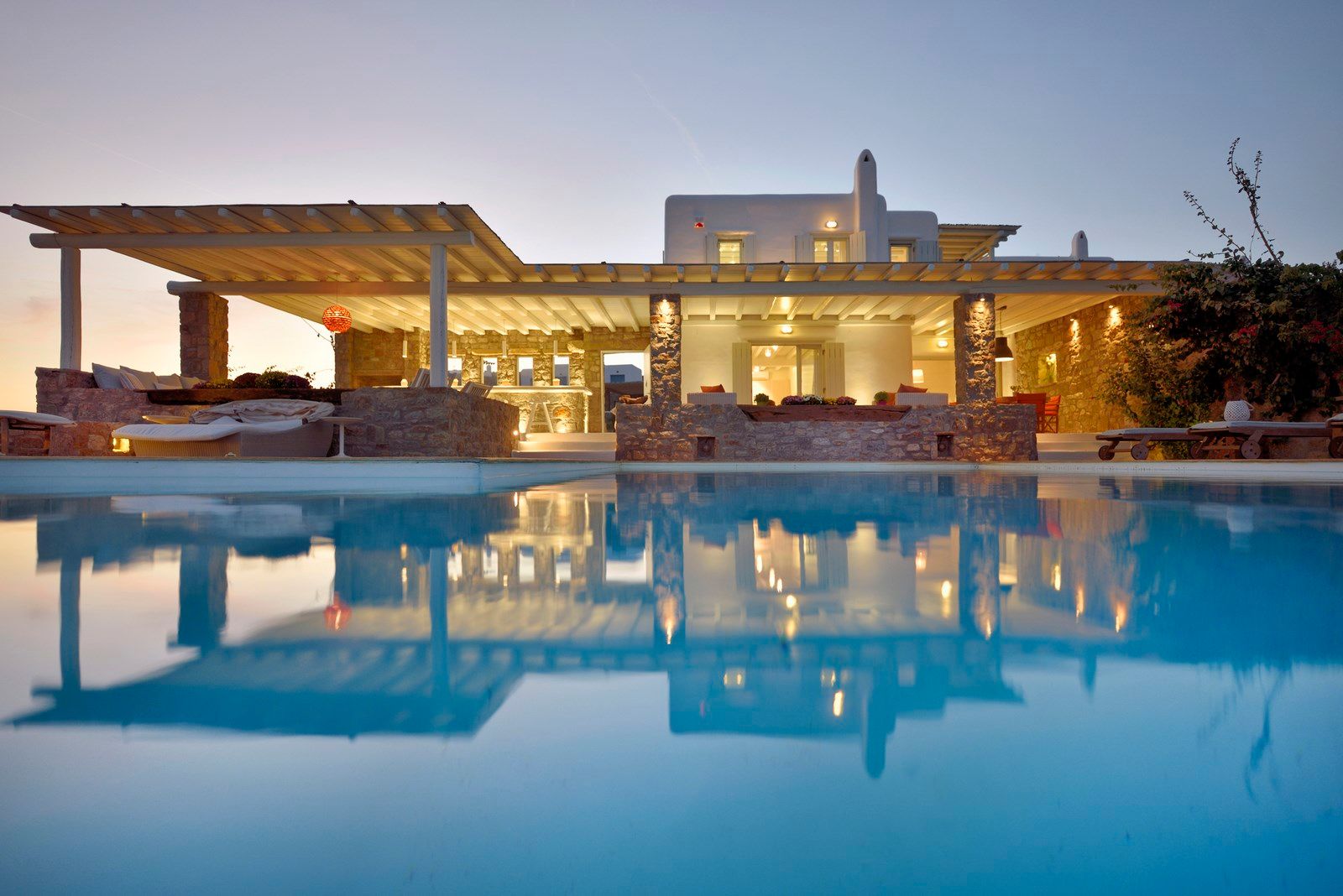Among others the villa offers a free training facility with a massage area overlooking Ftelia Beach with a glass-wall which opens to connect the space with the outdoor pergola, a Marble Hammam area and a second outdoor heated spa pool.
