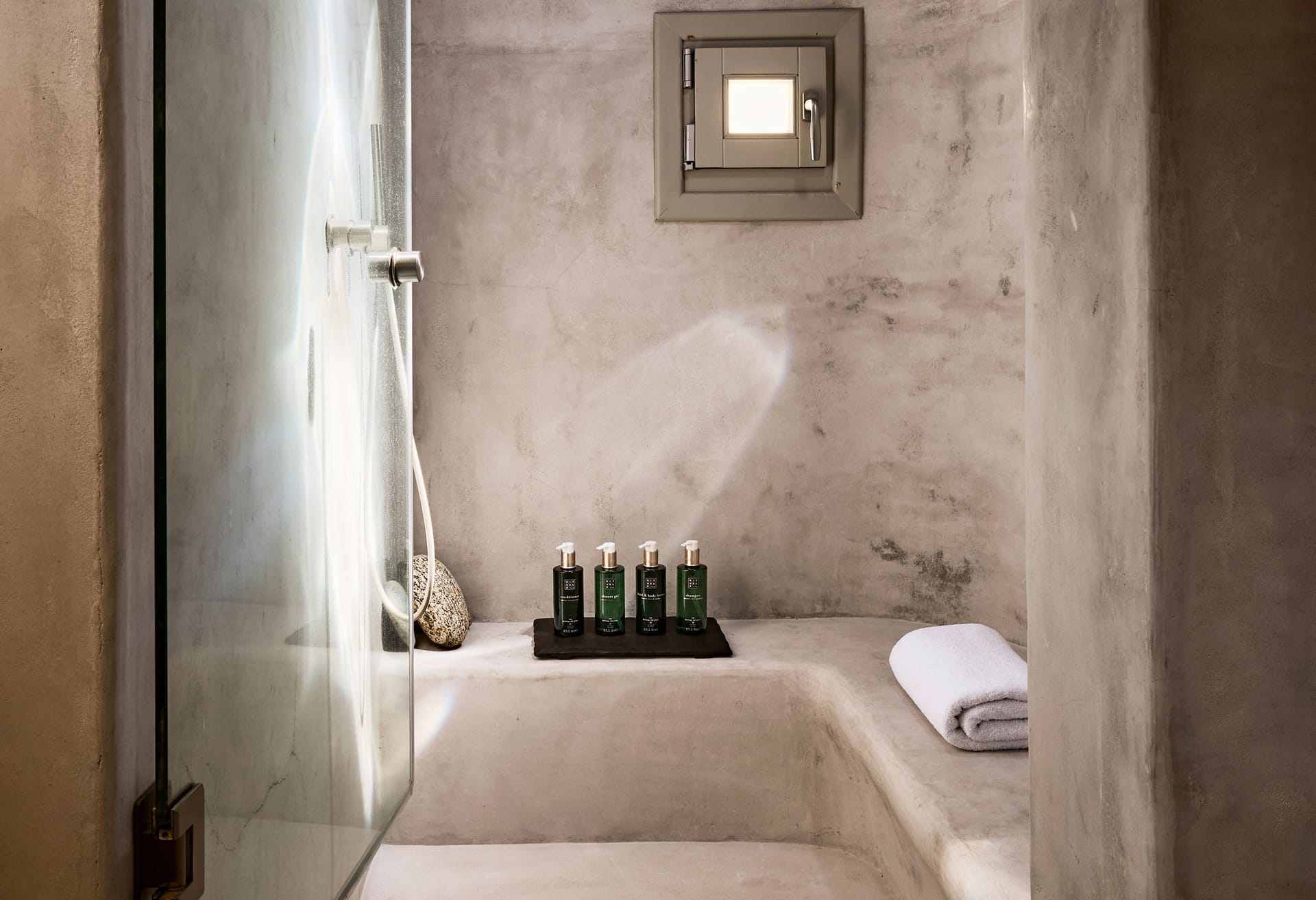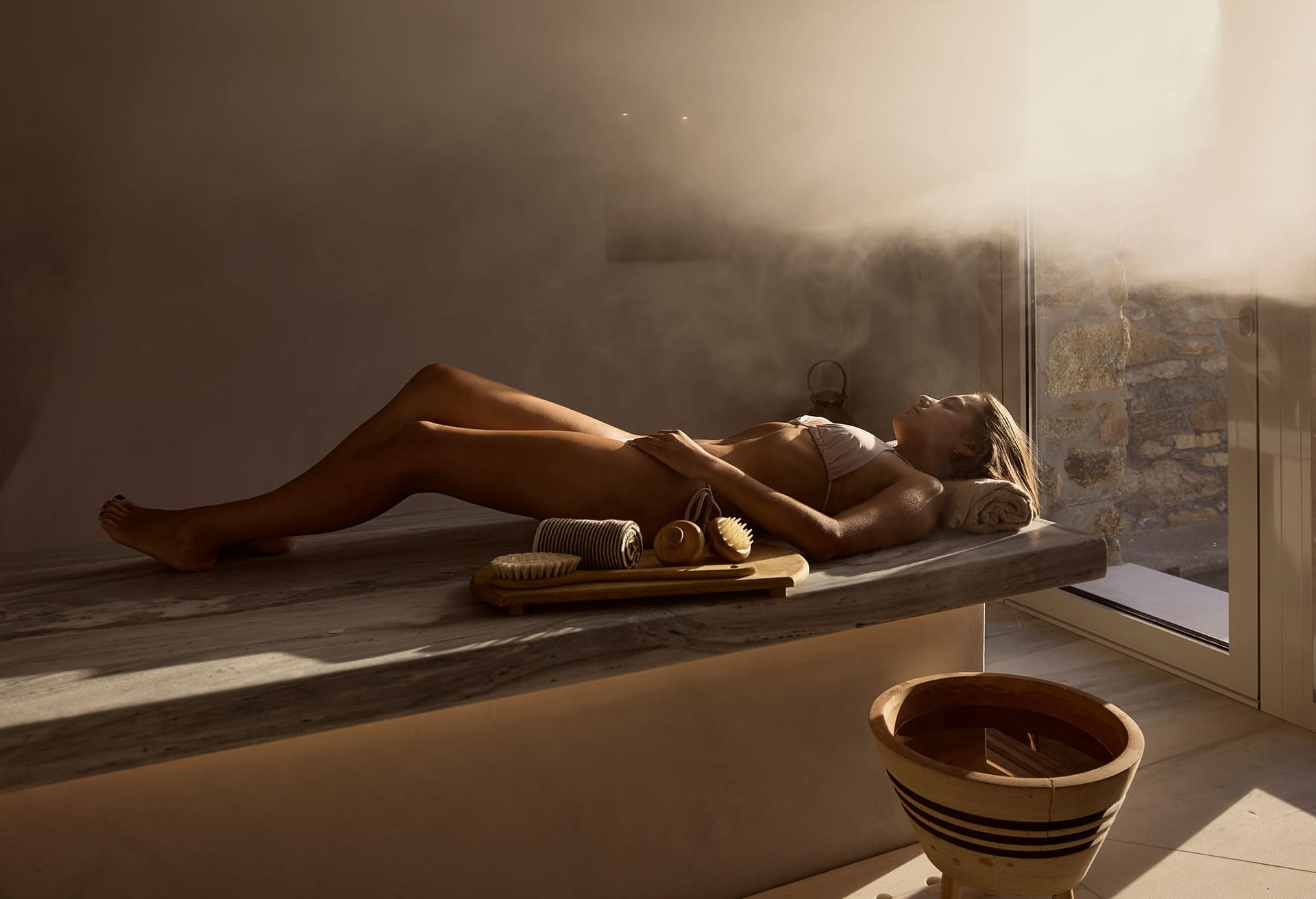 Marble Hammam area of 50m2 plus outdoor heated spa pool. *Professional facility available upon request. Use only under therapist supervision.