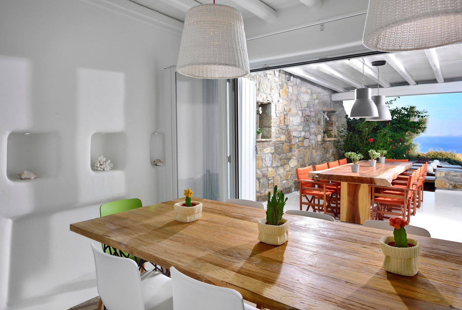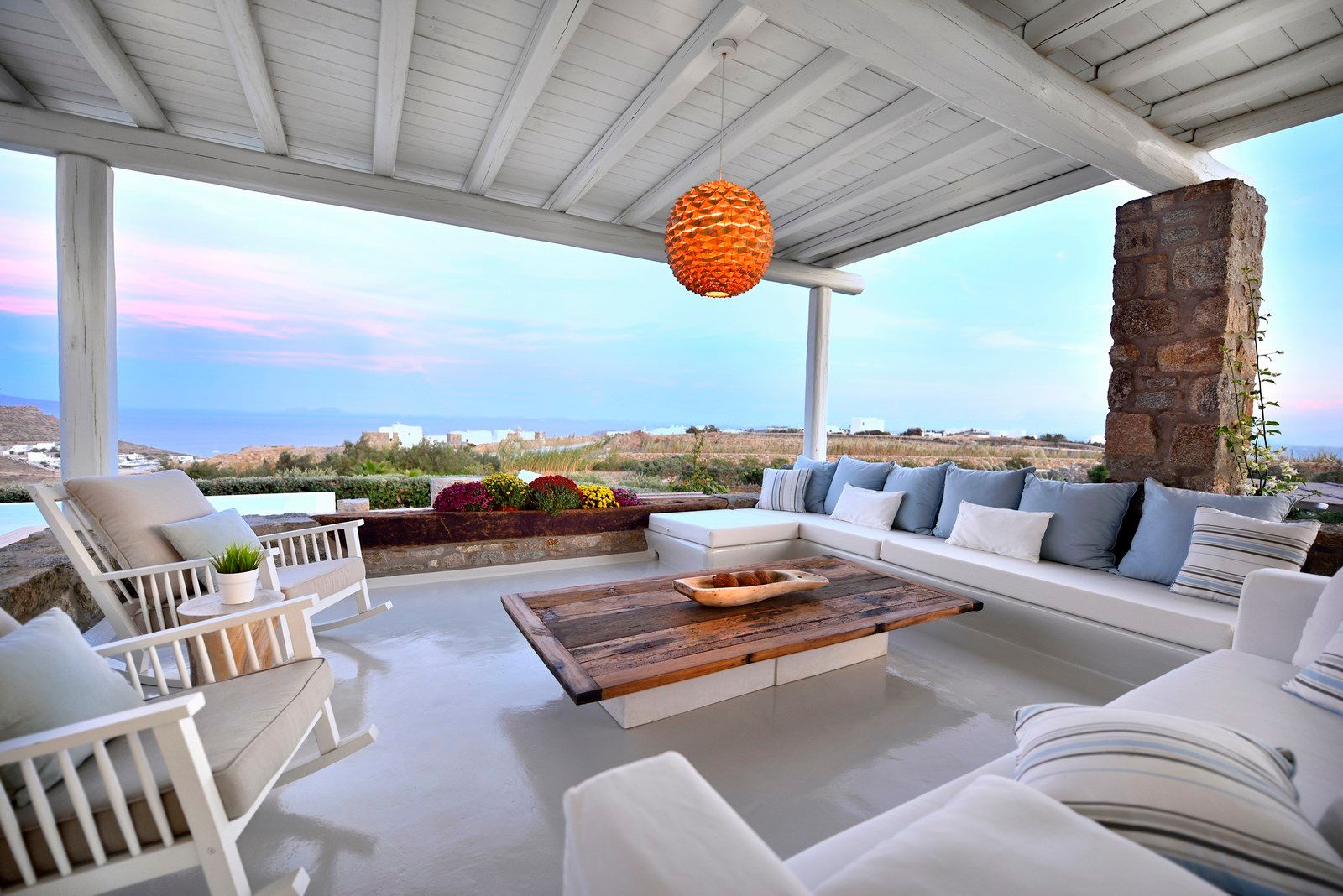 The spacious outdoor dining area situated above the pool offering breath-taking sea views while the lounge area is ideal for enjoying the stunning sunset colors of Mykonos, accompanied with inspiring vibes, drinks and cocktails.