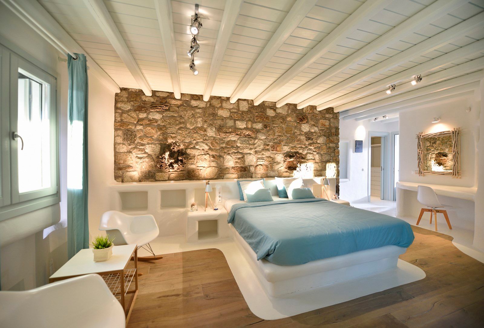 Independent open plan suite with rustic decoration.